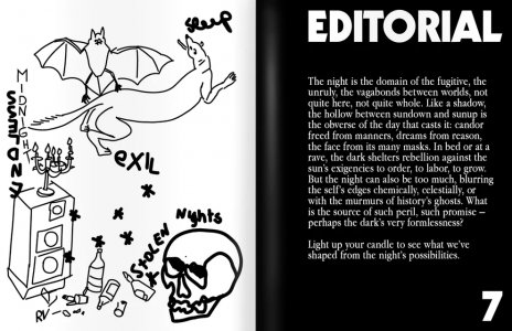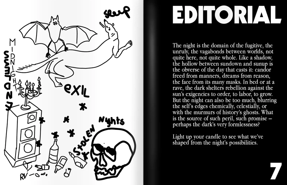 Need a break from the tyranny of the sun? Then light a candle, a headlamp, a flare – anything but your phone – and grap your copy to follow us into the possibility of the night.
