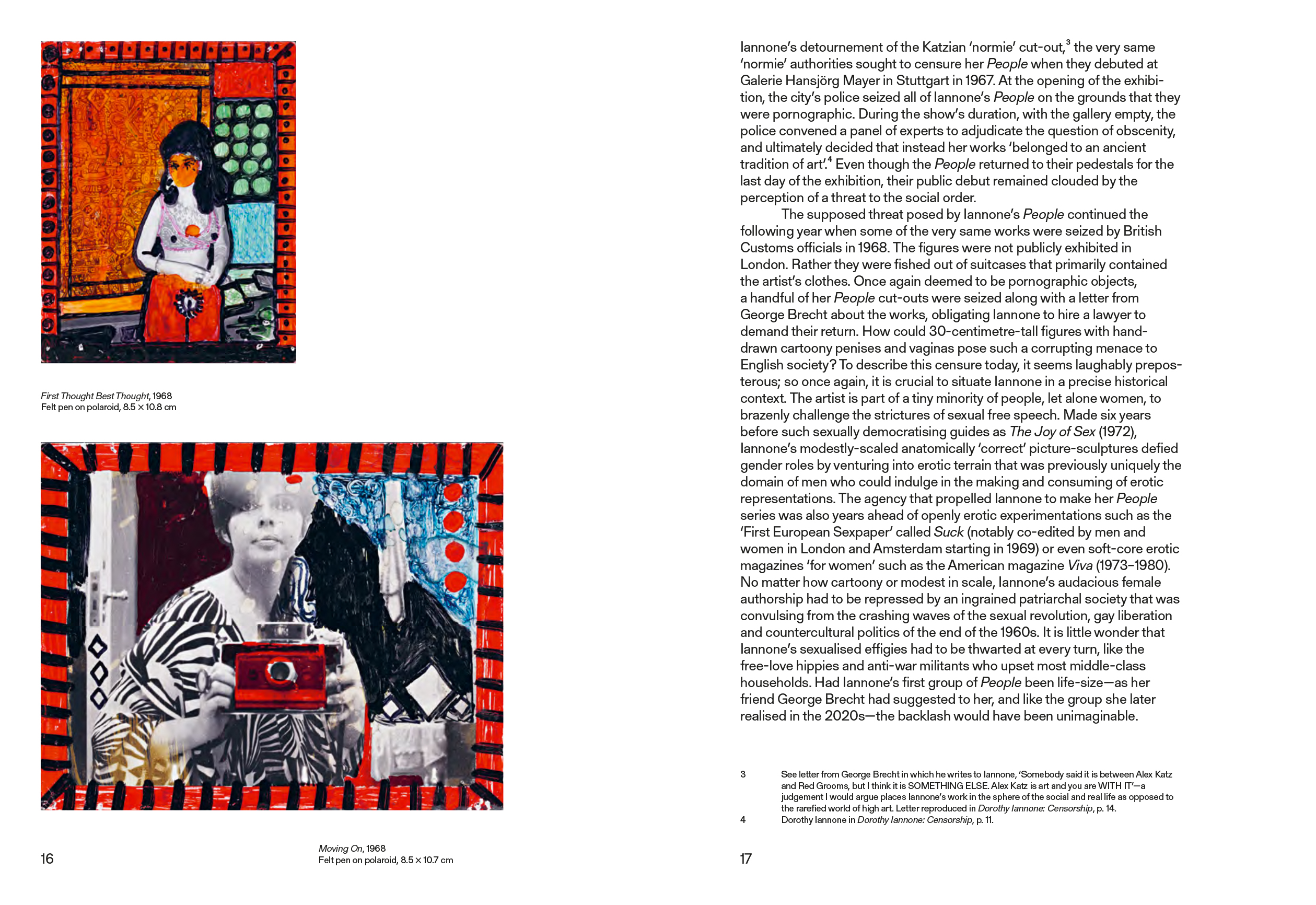 Published to accompany Dorothy Iannone's retrospective exhibition held at M KHA (Antwerp) in 2023–2024, this publication sheds new light on the legendary artist's practice by dealing specifically with her idiosyncratic take on performativity and transdisciplinarity—notably through her use of audio and video pieces, and creative writing—and her unique thinking and imagery regarding feminism and feminine sexuality and desire. New essays by American curator Alison Gingeras, French curator and academic Ana Mendoza Aldana, and M KHA curator Joanna Zielinska, together with a selection of rarely reproduced bodies of work—especially the "People" series (1966–1968)—offer new approaches to celebrate her work and life.