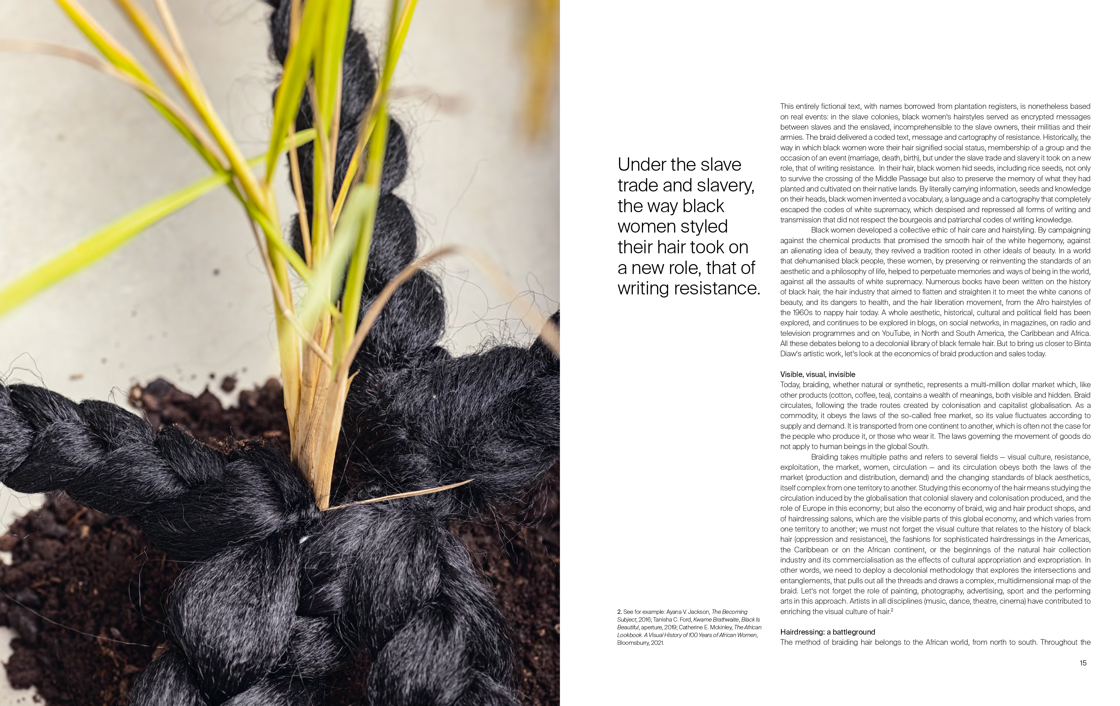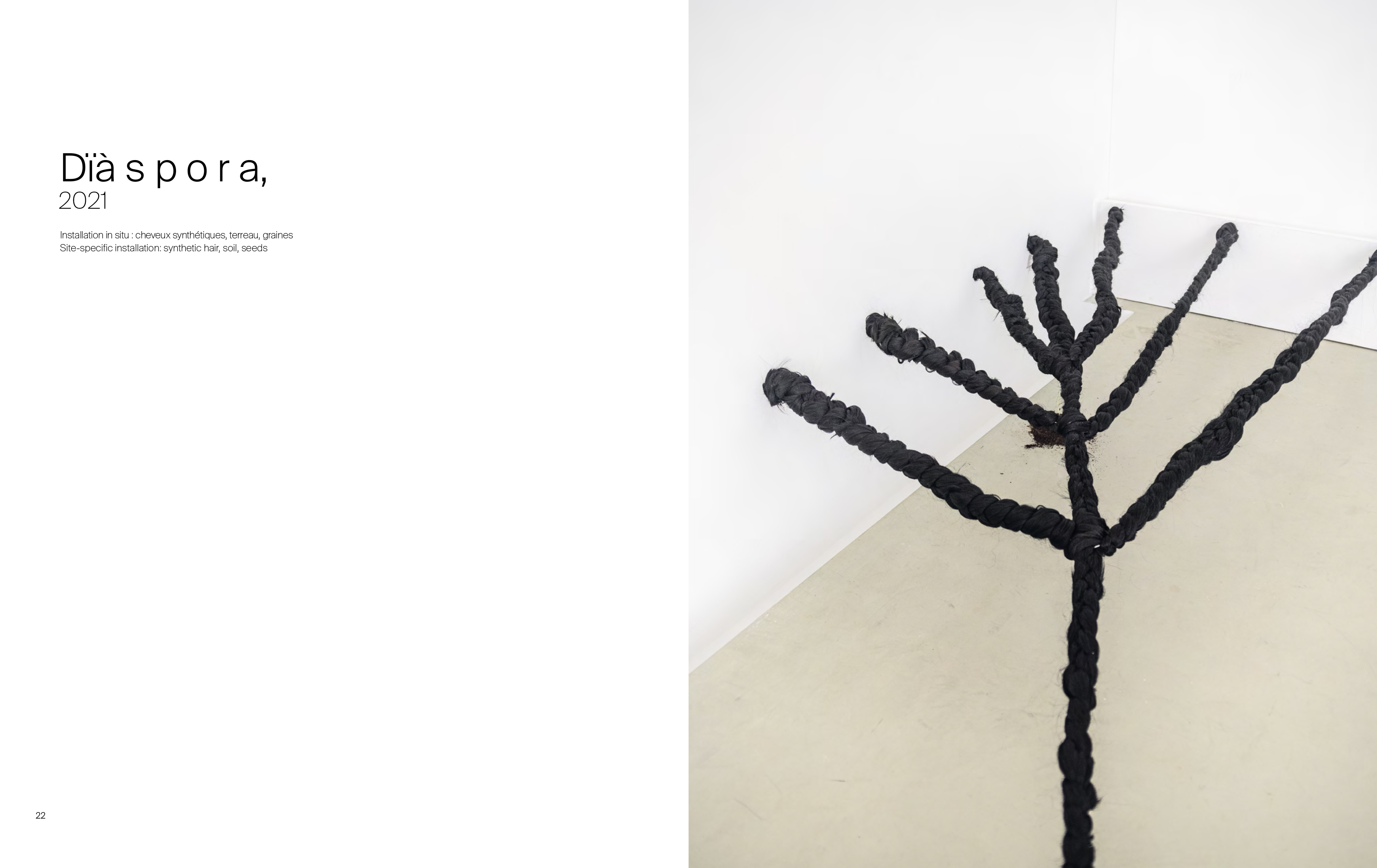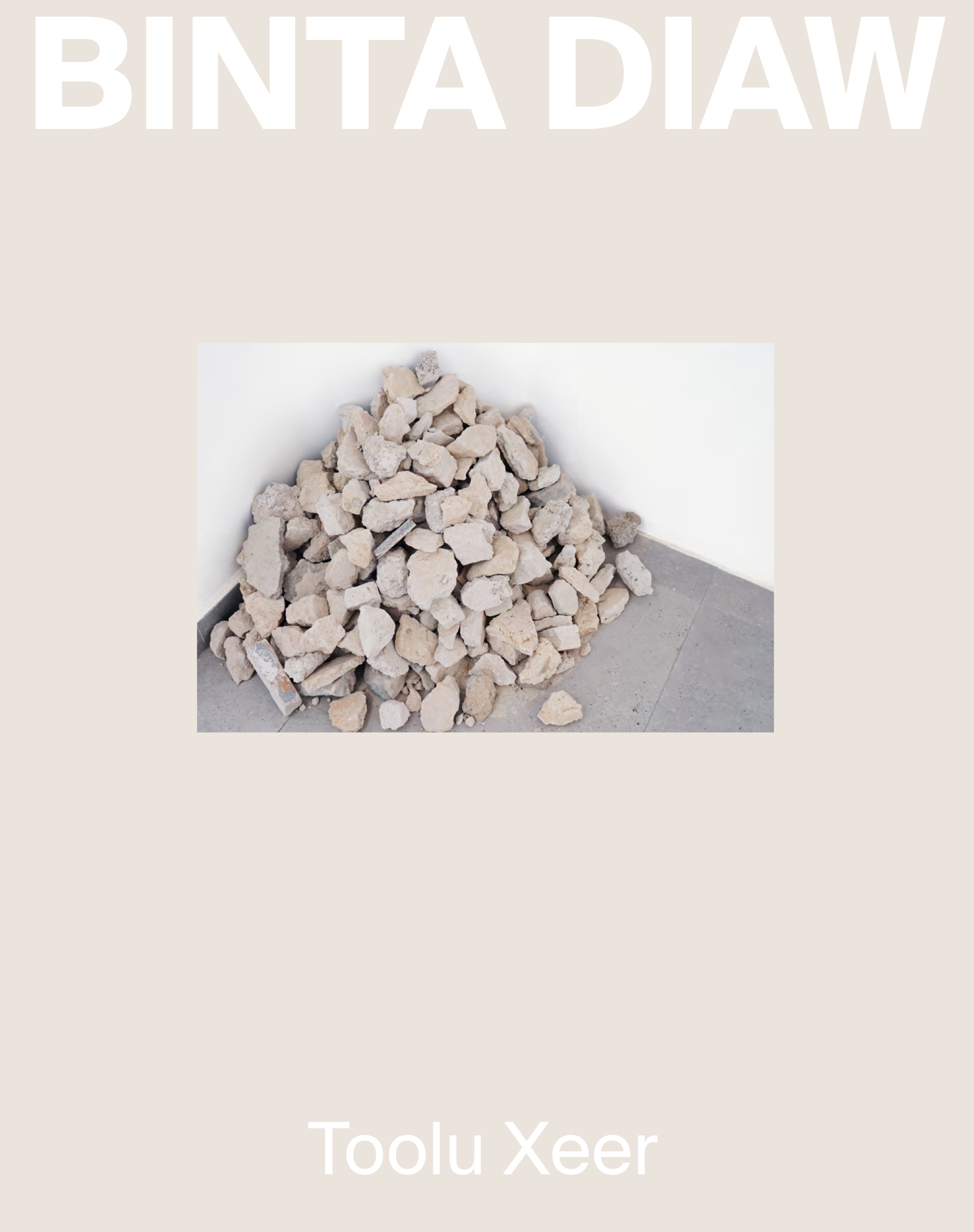 This book is divided into three parts, each devoted to a body of work by the artist (installation or solo exhibition). Following a preface by Marie-Hélène Pereira, the first part deals with the work Dïàspora (2021), accompanied by a text by Françoise Vergès. The second focuses on the works presented at his solo exhibition Toolu Xeer [Field of Stones] at the Galerie Cécile Fakhoury in Dakar in 2022, with a text by Delphine Lopez. Finally, the book presents Binta Diaw's installation Chorus of Soil, presented in 2023 at the Liverpool Biennial, in an interview with Janine Gaëlle Dieudji.