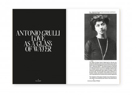 The "theory of the glass of water" dates back to the pre-revolutionary Russian period and is linked to the radical thinker and feminist Alexandra Kollontai (St. Petersburg, 1872–Moscow, 1952). It is a theory based on the idea of a sexual revolution where impulses are seen as a simple human necessity that must be satisfied with the lightness and carefreeness that a glass of water is usually drunk with. It had a significant influence on artistic and literary circles of those years, but was immediately opposed by revolutionary political establishments.