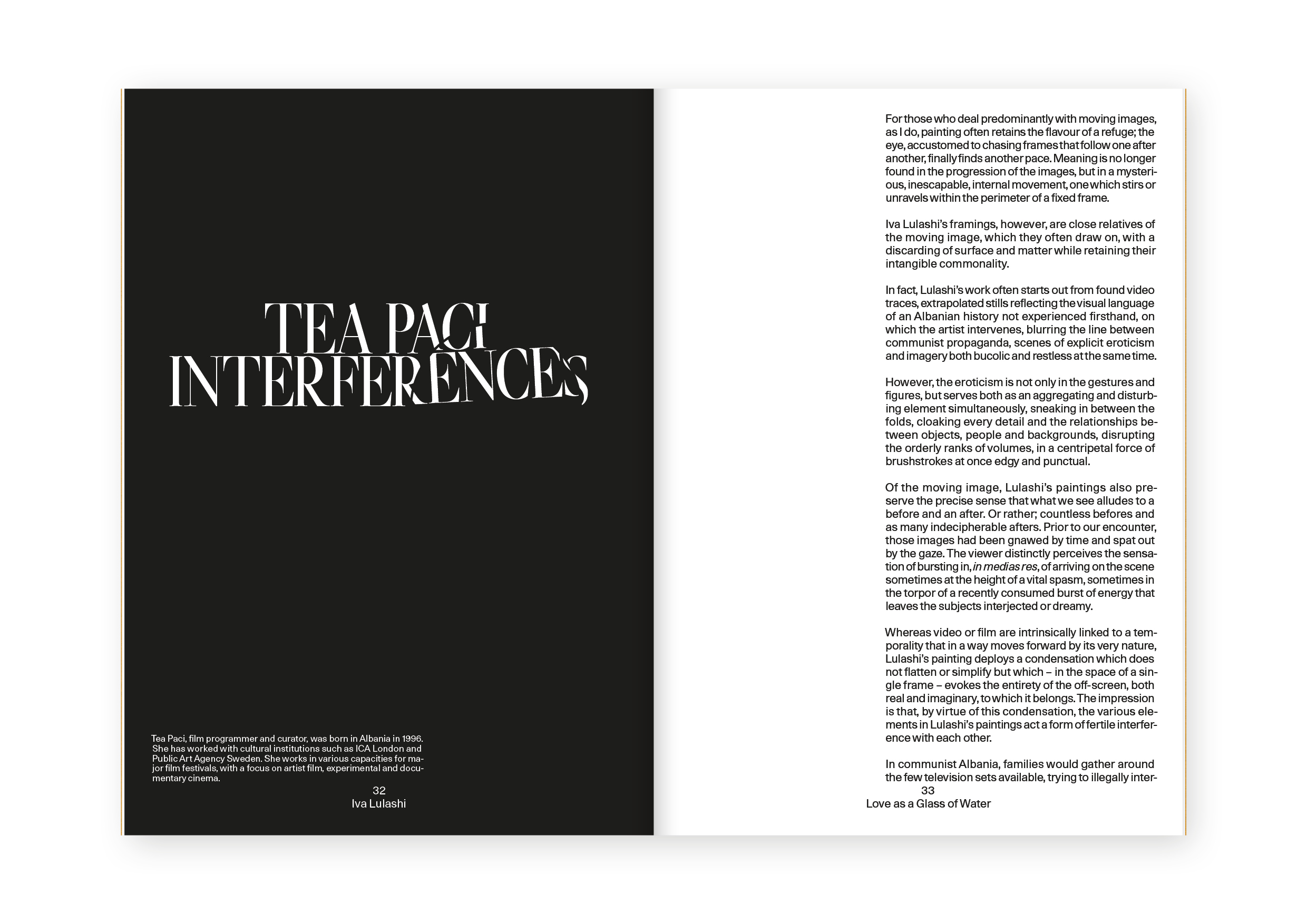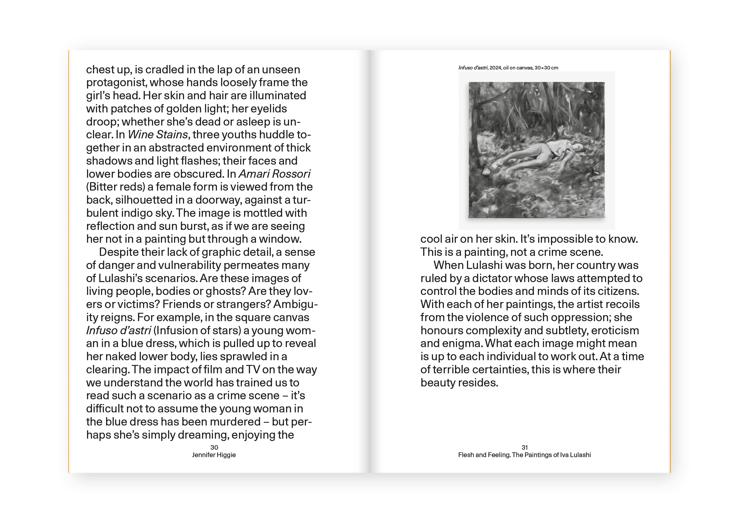 Iva Lulashi (born 1988 in Tirana) is an artist who lives and works in Milan. Love, desire—especially of feminine nature—, impulse, and sexuality are at the core of her work: universal subjects able to transcend differences and overcome boundaries. The images in her paintings are mostly taken from film and video stills, usually little known, which serve as the painting's initial detonator and from which the artist moves away, cutting the cord from the initial inspiration. They are mainly populated by female bodies and suggest scenarios potentially involving the erotic act—as if they were a "right before" or "right after"—without explicitly showing it. The paintings stand out for their "photographic" attitude, but at a closer look they manifest themselves as strongly painterly, made of a livid liquidity, of synthetic brushstrokes devoid of any affectation, leaving many parts of the painting deliberately unresolved and almost abstract. They are an ode to feminine desire, encompassing strength, fear, hope, a desire for freedom, dark sides, and vitality: inseparable themes from a not-yet-past past, laden with global political issues, which one must deal with every day and every night.