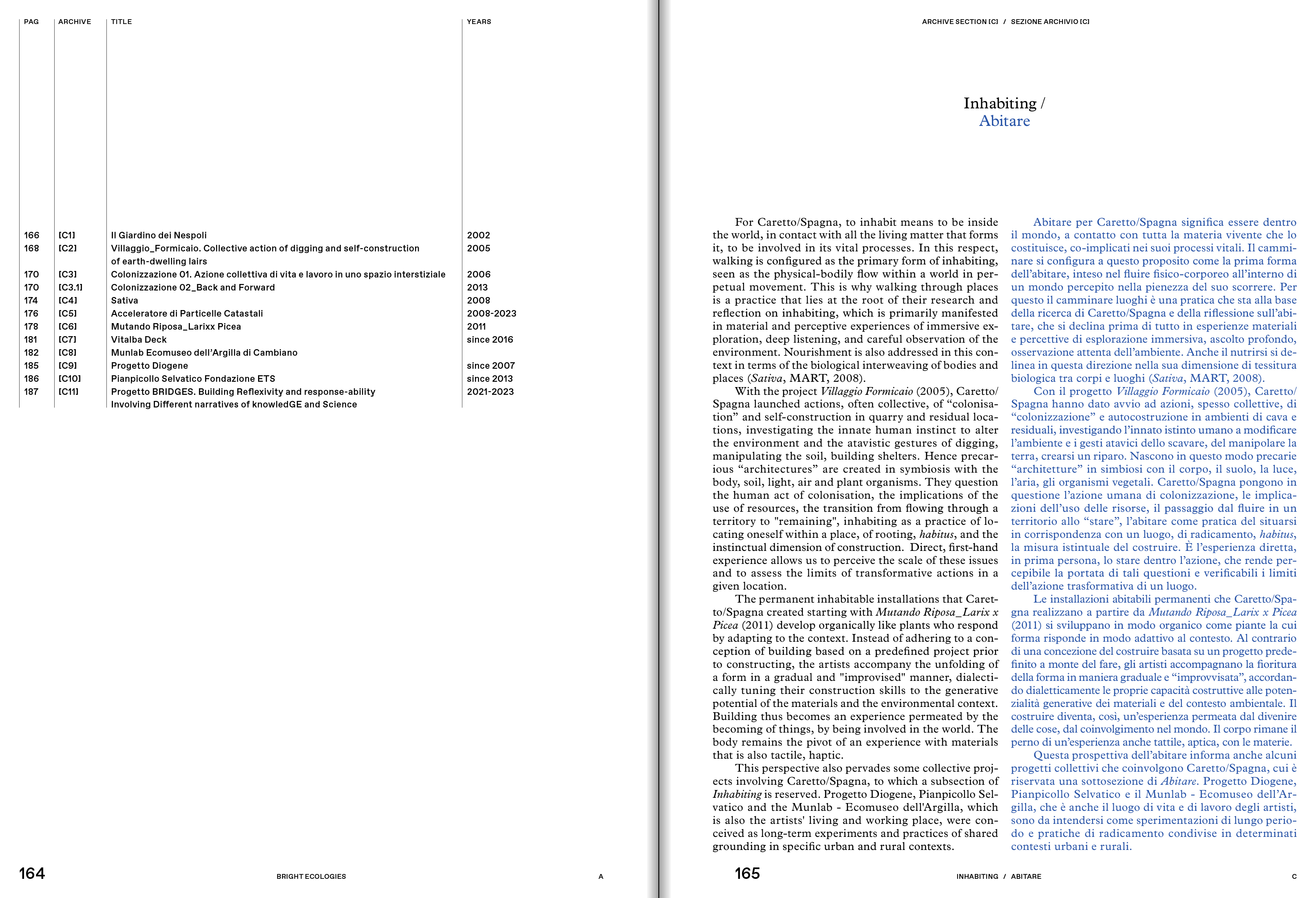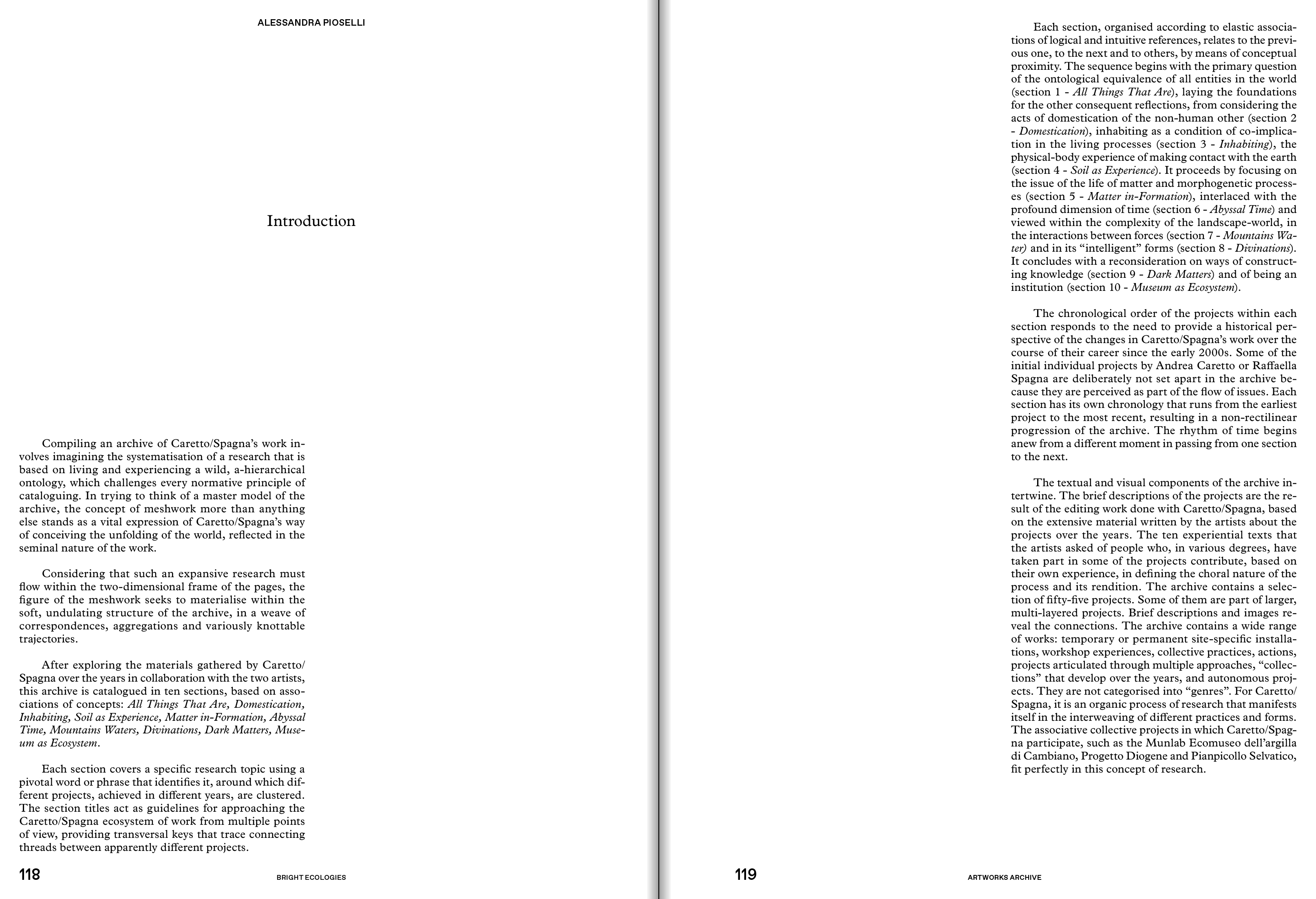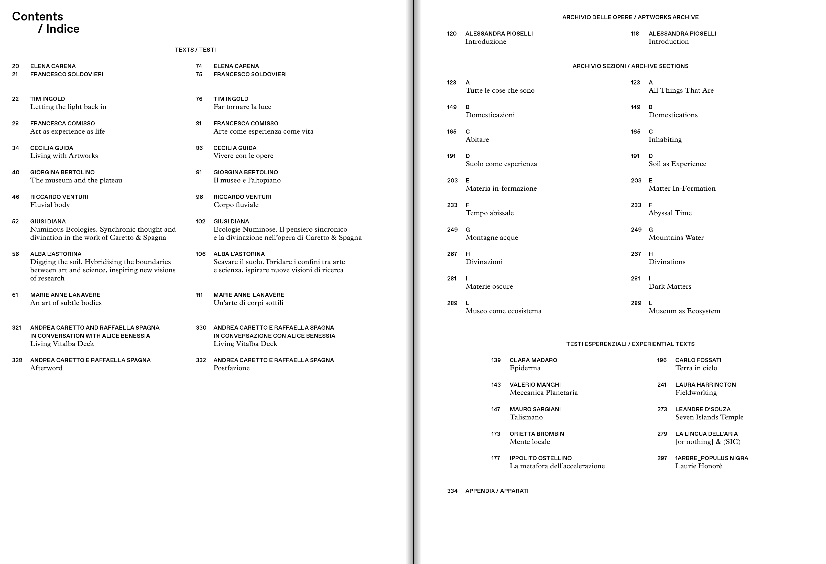 Tim Ingold, with texts by the curators (Francesca Comisso, Cecilia Guida, Giorgina Bertolino) and a series of crossreadings (Riccardo Venturi, Giusi Diana, Alba L'Astorina, Marie-Anne Lanavère). The central section of the monograph is devoted to the archive, edited by Alessandra Pioselli in collaboration with Caretto/Spagna. Starting with key concepts, it is organized into ten sections: All Things That Are, Domestication, Dwelling, Soil as Experience, Matter in-formation, Abyssal Time, Water Mountains, Divinations, Dark Matters, and Museum as Ecosystem. The documentation of over 50 projects is followed by ten narratives, ten testimonies commissioned by the artists from people who directly participated in the different experiences. The conversation between Caretto/Spagna and Alice Benessia and the apparatuses, constitute the third section of the monograph.
