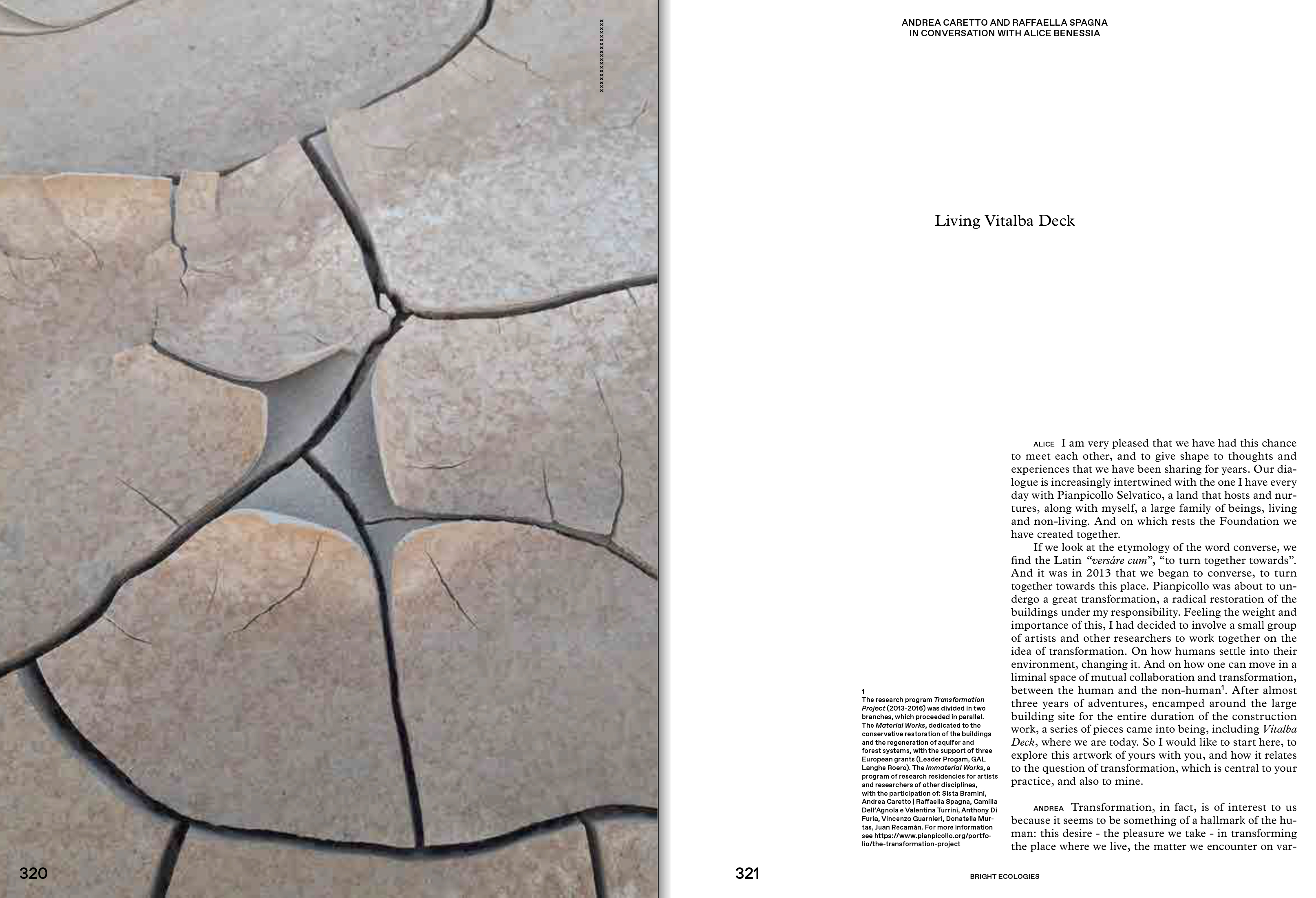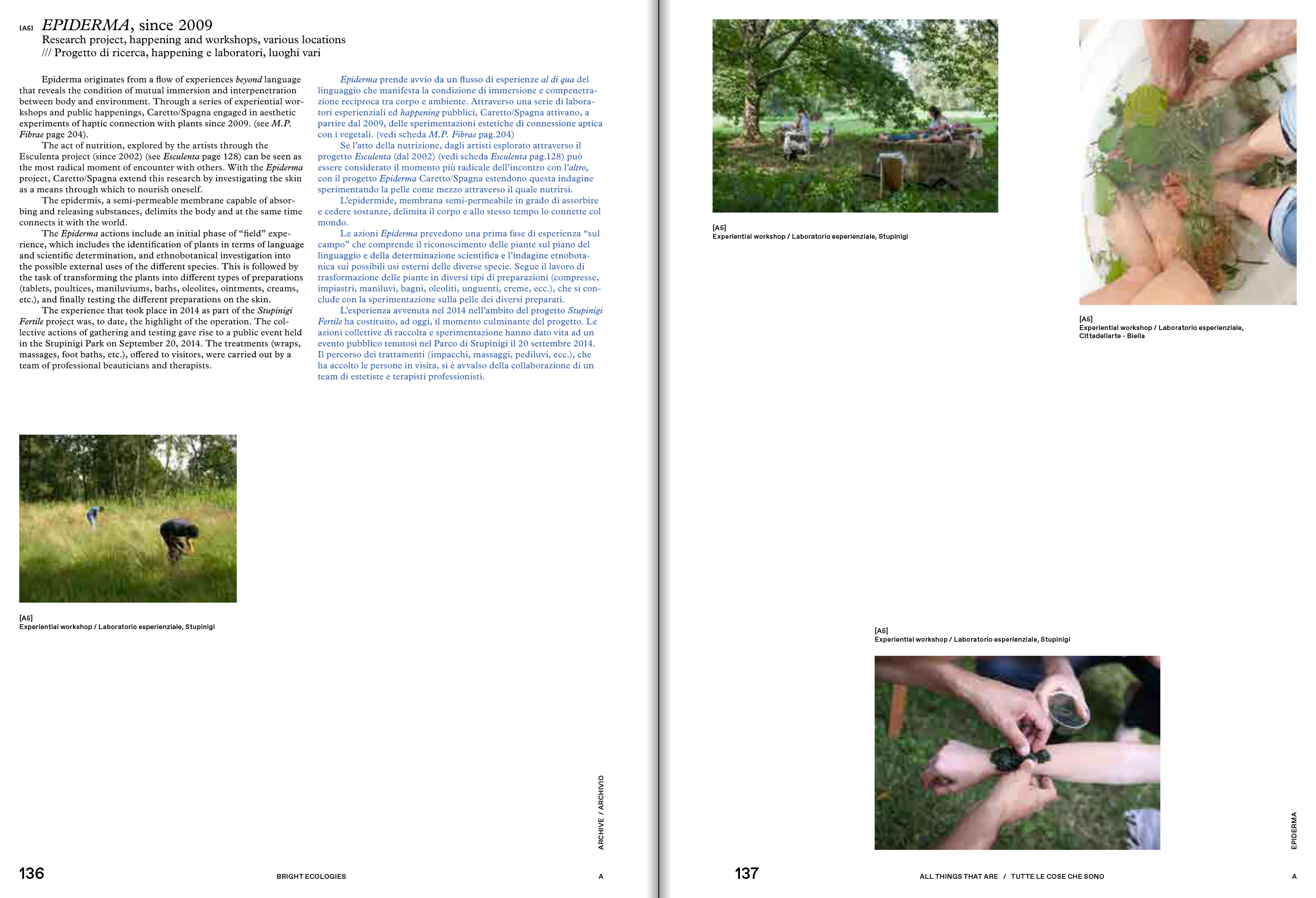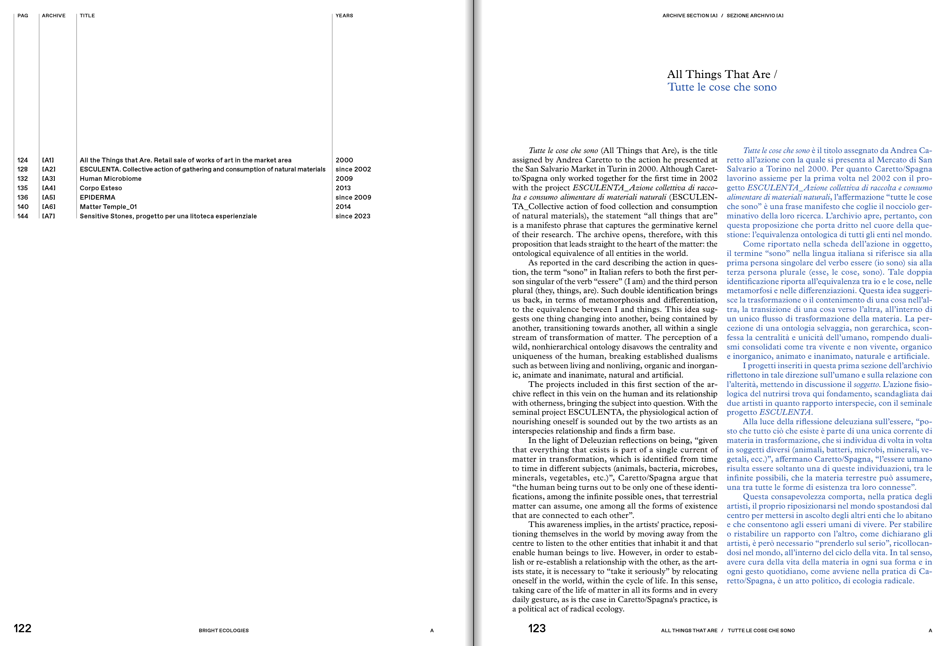 Tim Ingold, with texts by the curators (Francesca Comisso, Cecilia Guida, Giorgina Bertolino) and a series of crossreadings (Riccardo Venturi, Giusi Diana, Alba L'Astorina, Marie-Anne Lanavère). The central section of the monograph is devoted to the archive, edited by Alessandra Pioselli in collaboration with Caretto/Spagna. Starting with key concepts, it is organized into ten sections: All Things That Are, Domestication, Dwelling, Soil as Experience, Matter in-formation, Abyssal Time, Water Mountains, Divinations, Dark Matters, and Museum as Ecosystem. The documentation of over 50 projects is followed by ten narratives, ten testimonies commissioned by the artists from people who directly participated in the different experiences. The conversation between Caretto/Spagna and Alice Benessia and the apparatuses, constitute the third section of the monograph.
