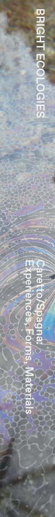 This volume offers the first overview of Caretto/Spagna's work, in a full-bodied monograph that interweaves interpretive and documentary approaches, critical and theoretical reading with the regest and reconstruction of a broad itinerary, through fact sheets and a rich apparatus of images. The outcome of discussions among the artists, the curators, and the publisher, Bright Ecologies is a book-length book that provides the reader with multiple points of entry. Structured in three parts, it opens with an essay by anthropologist