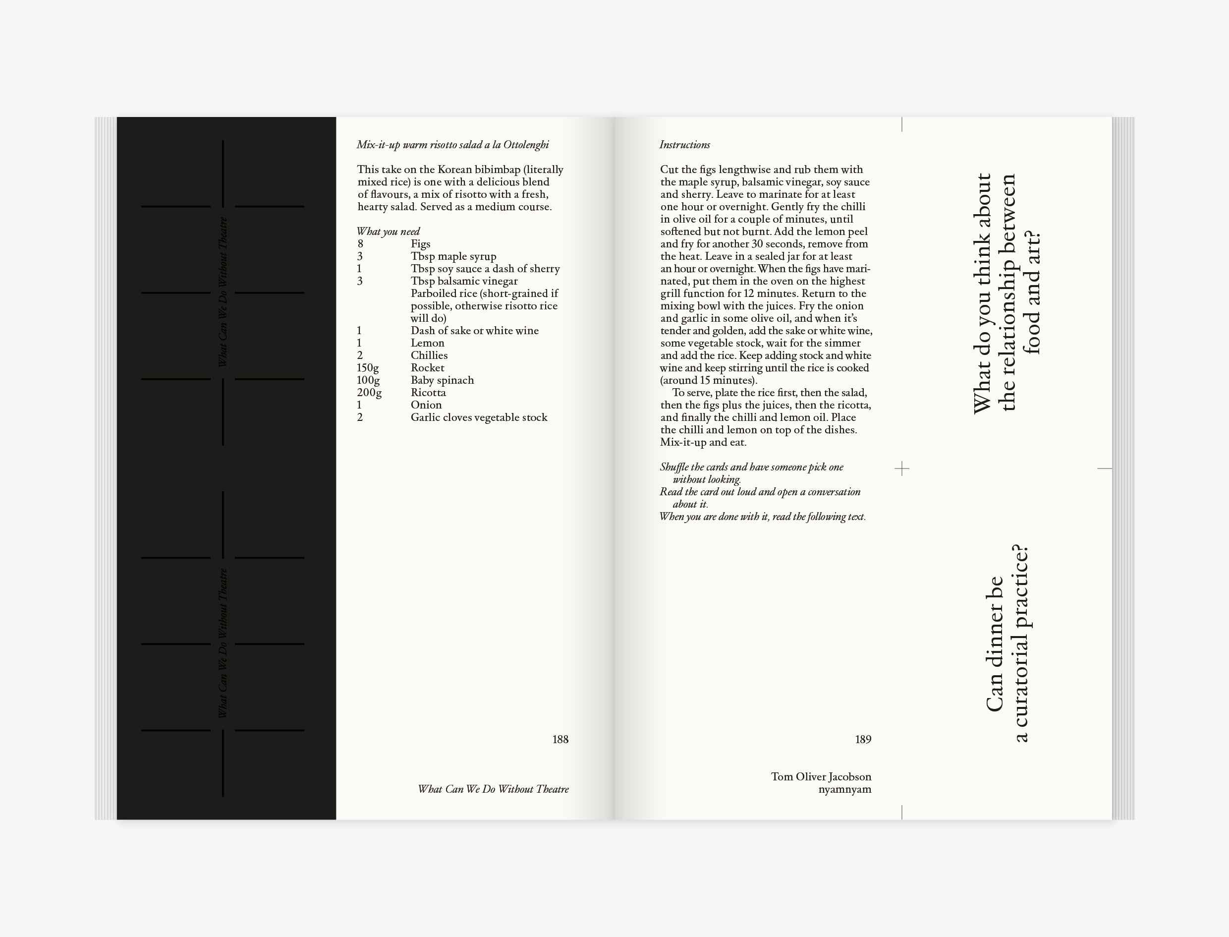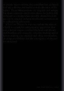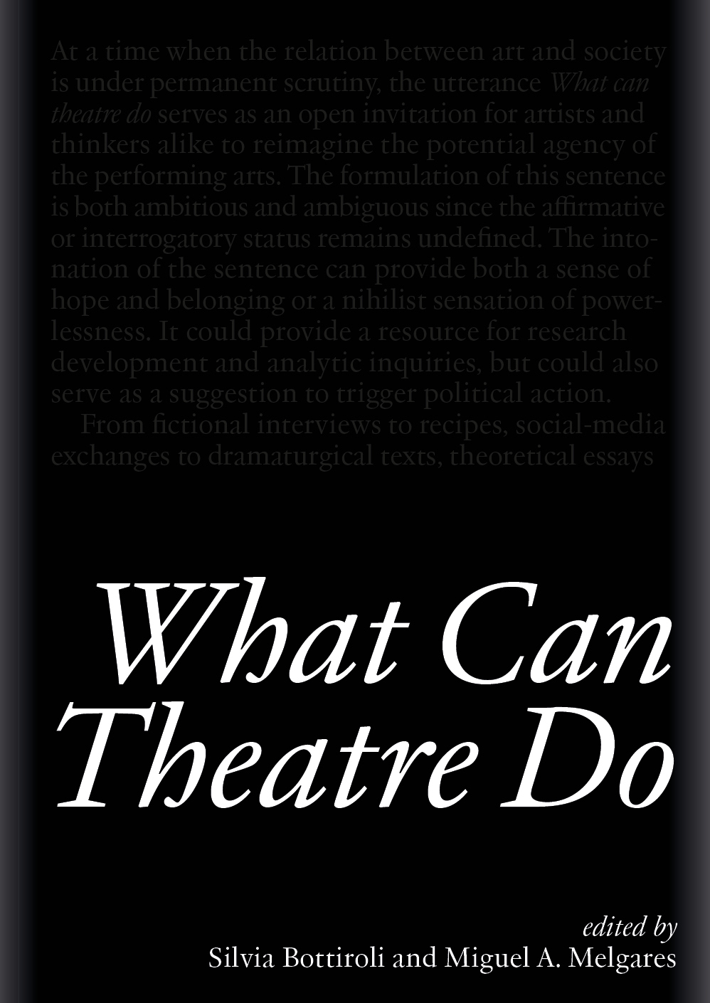 From fictional interviews to recipes, social-media exchanges to dramaturgical texts, theoretical essays to artistic interventions, the contributions gathered here are a diverse and multifaceted collection of dialogues. These interventions are singular and unique but share concerns and desires about the politicality of theatre as a realm where possible alternative realities can be enacted and potential future scenarios can be collectively rehearsed. What Can Theatre Do tries to explore the idea of a book as a complex performative apparatus that can generate a space within which art and theory, and therefore also strategies of reality-making and of fiction-making, can entangle and affect one another, creating possibilities for the emergence of the not yet imagined.