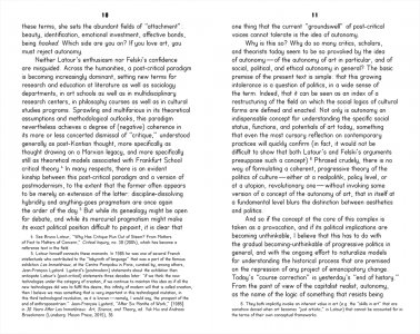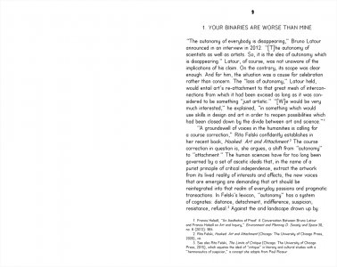Over recent decades, a post-critical theoretical and methodological paradigm has become increasingly dominant in the human sciences. Proponents of this approach have come to dismiss the idea—central to all modern aesthetics—of the autonomy of art.