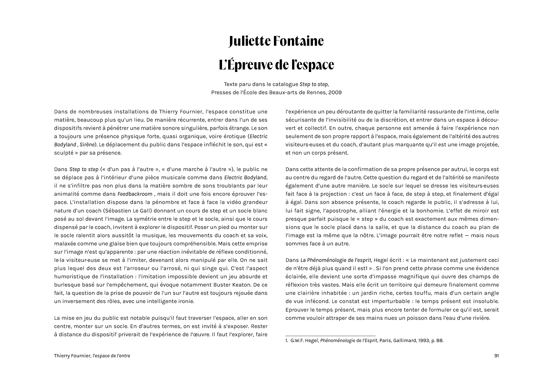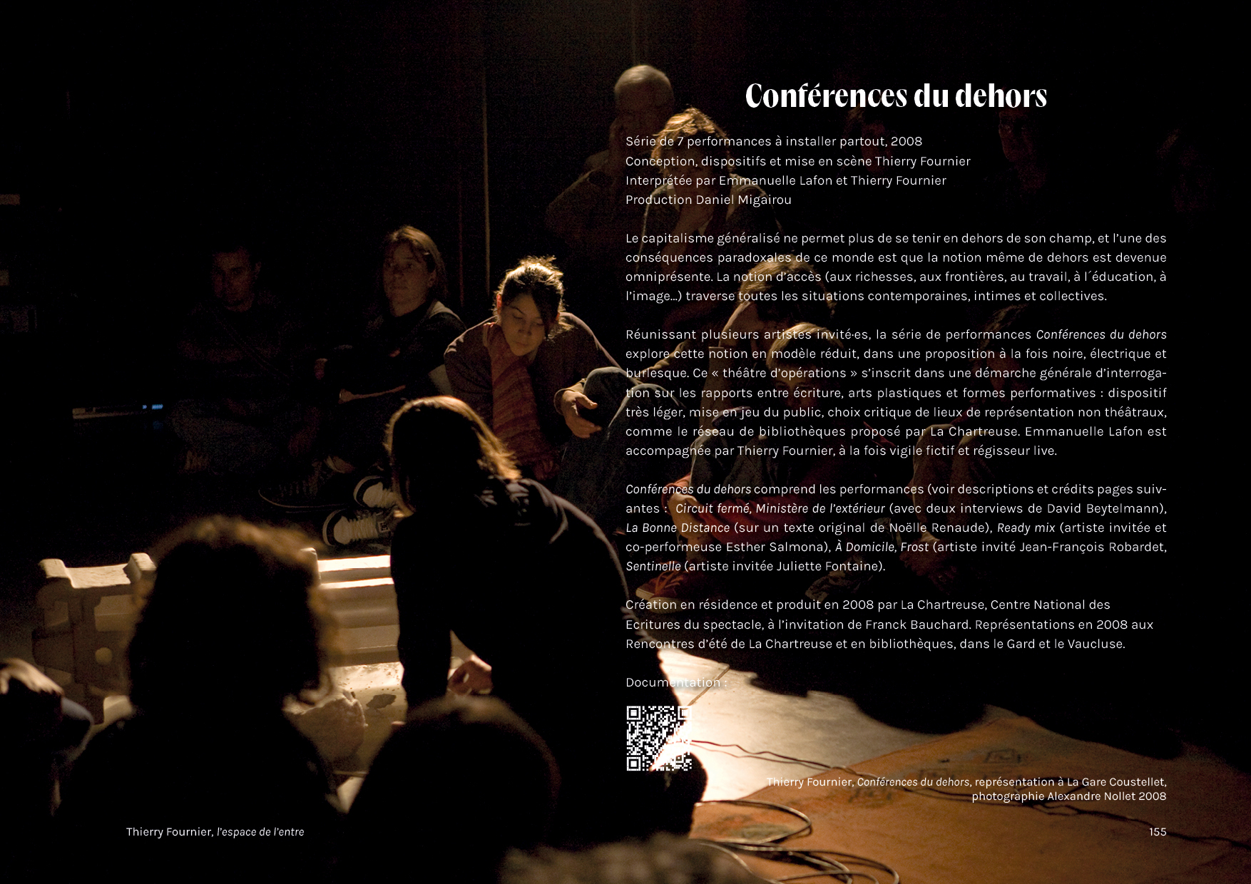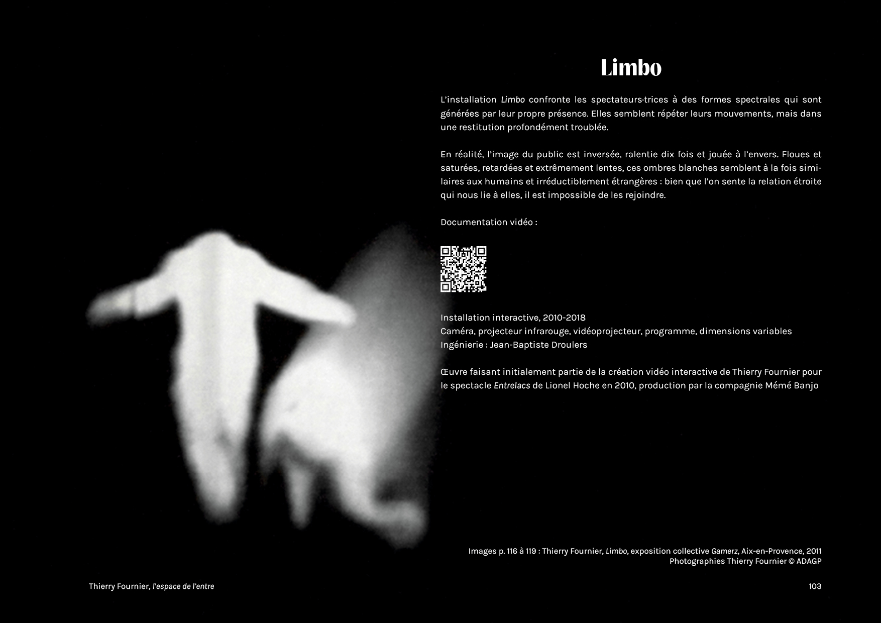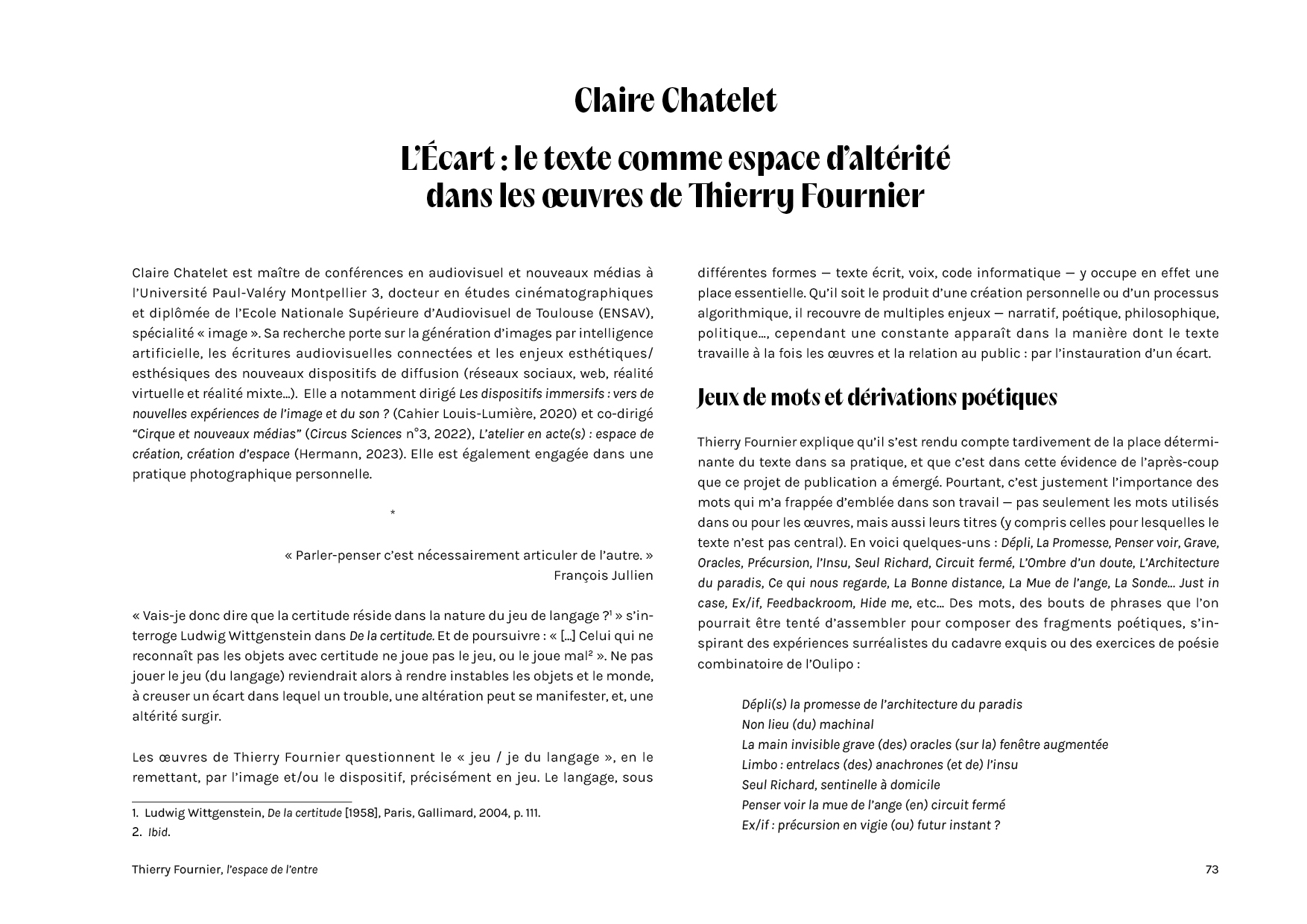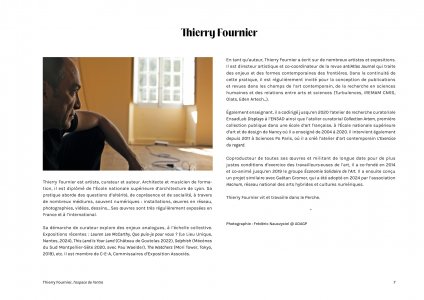 The book is co-edited by Claire Chatelet, lecturer and researcher at the Université Paul-Valéry Montpellier 3, and Juliette Fontaine, artist, curator and author. It brings together three previously unpublished texts by Claire Chatelet, philosopher and researcher Jean Cristofol and Juliette Fontaine, as well as three unpublished interviews between Thierry Fournier and, respectively: Juliette Fontaine, Franck Ancel, psychoanalyst and artist, and Emmanuel Simiand, psychoanalyst, author and film-maker. The last two interviews are moderated by artist and researcher Damien Beyrouthy. These texts alternate with presentations of Thierry Fournier's works, with QR codes allowing to watch documentation videos on his website.