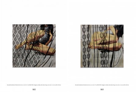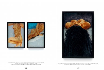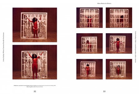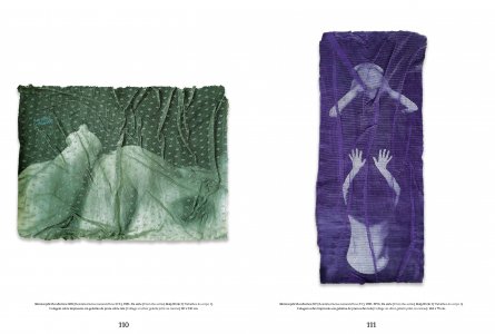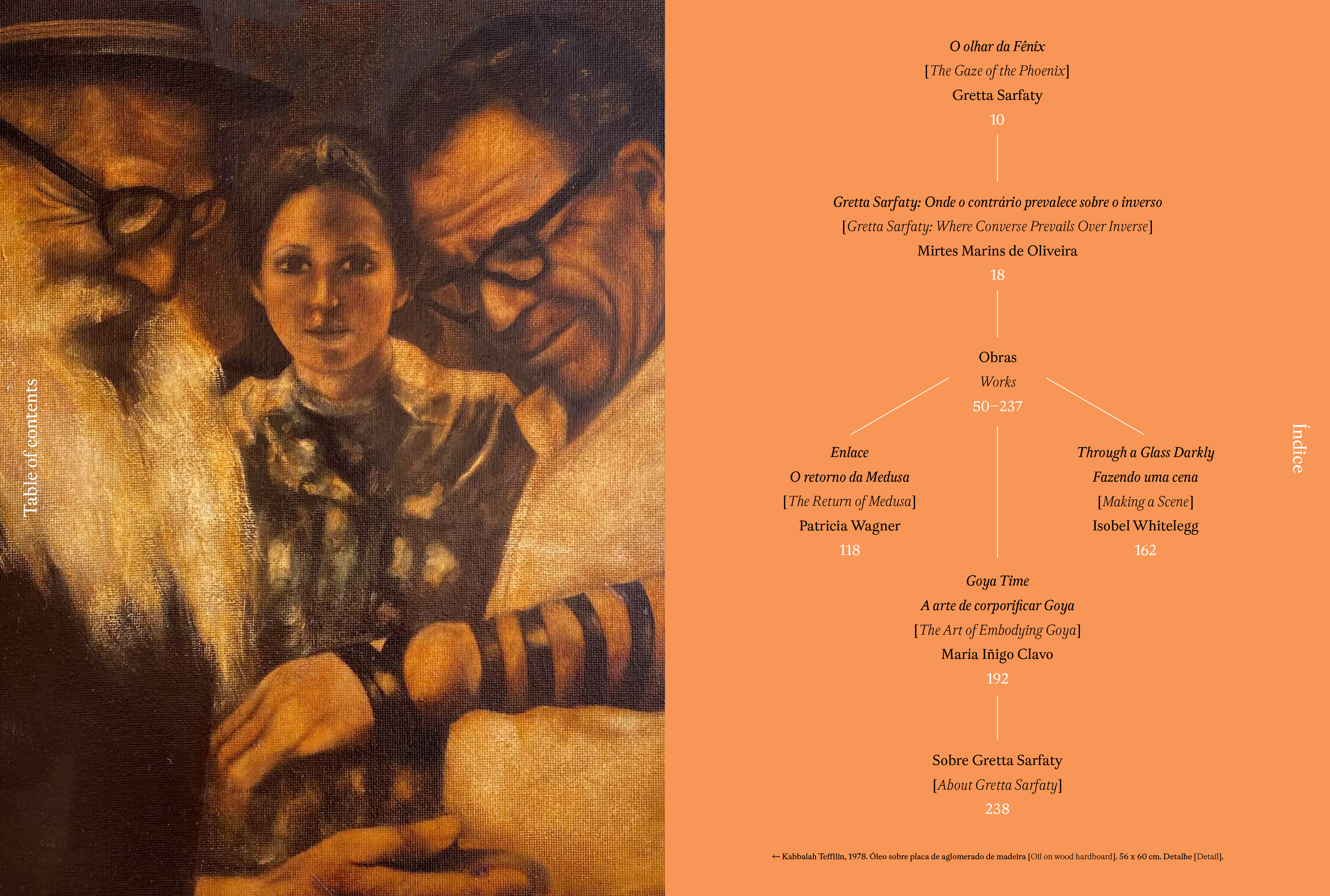 It is important to highlight the notable female leadership behind the team responsible for the book, whose design project is signed by Camila Regueira, drawing inspiration from symbols associated with Jewish culture such as the Kabbalah and the Talmud, both deeply associated to the artist's ancestry. In addition to tradition, another major element in Sarfaty's work, the body, is represented through the book's chosen chromatic composition. Veils and laces, other crucial parts in the game of hiding and revealing performed in some of her works, are also present in the woven texture on the cover.