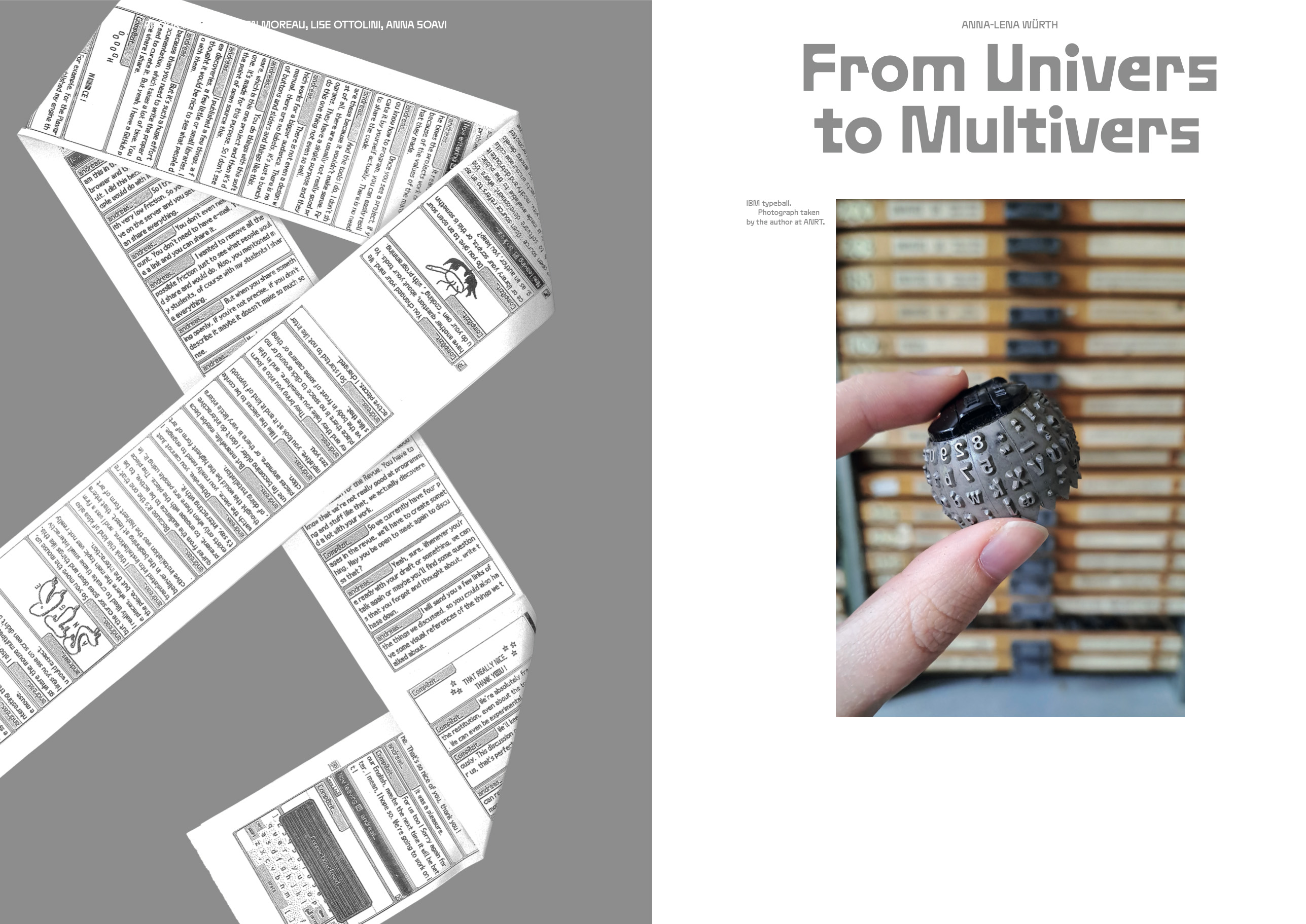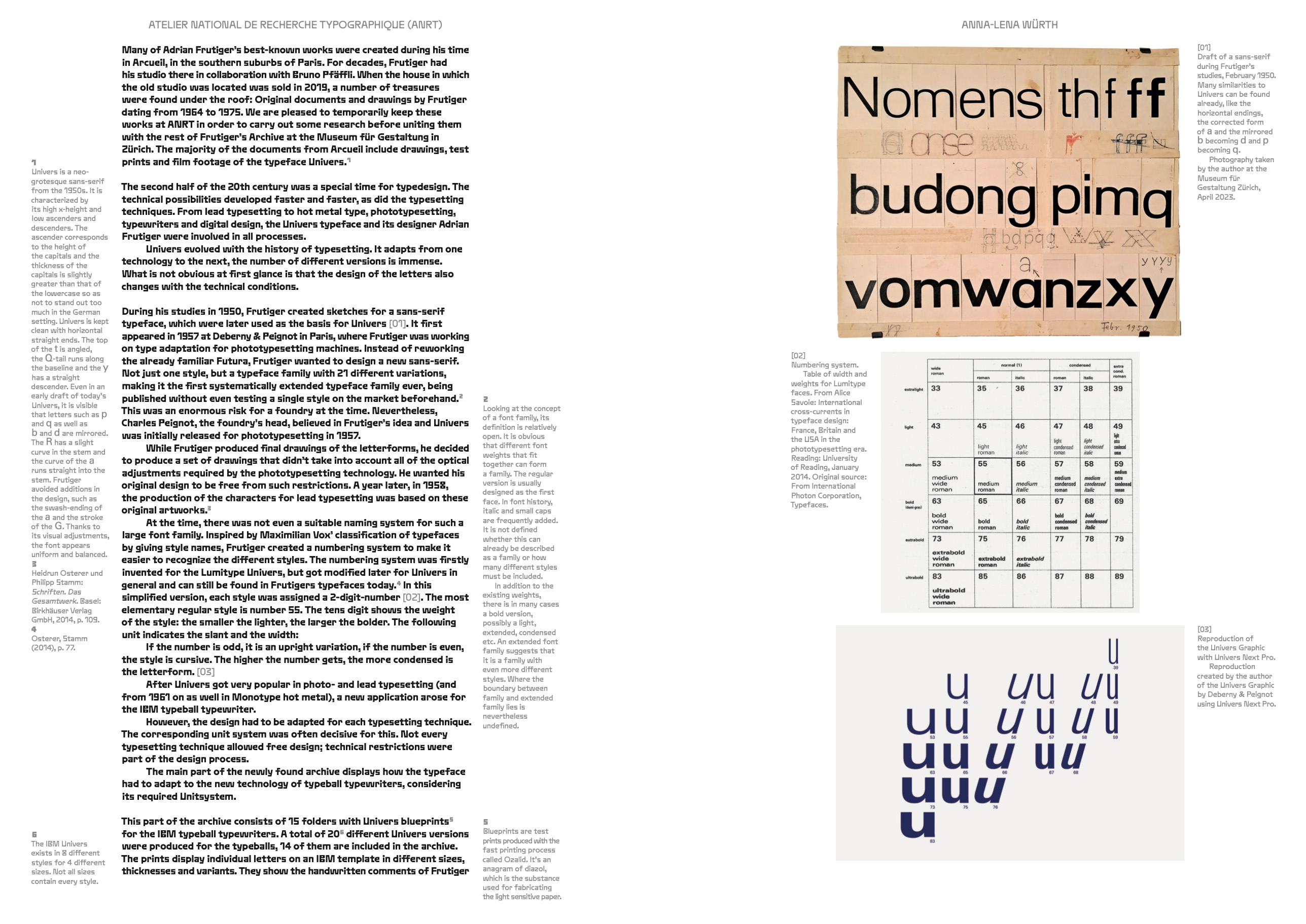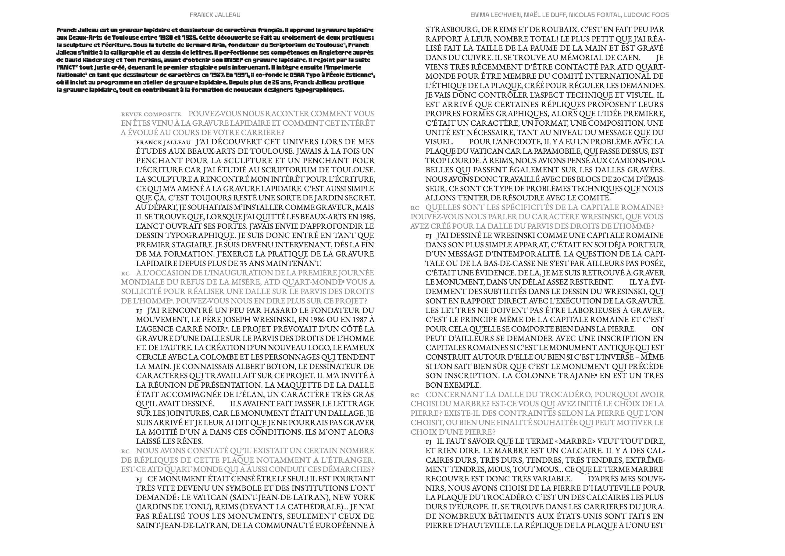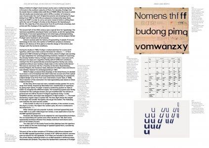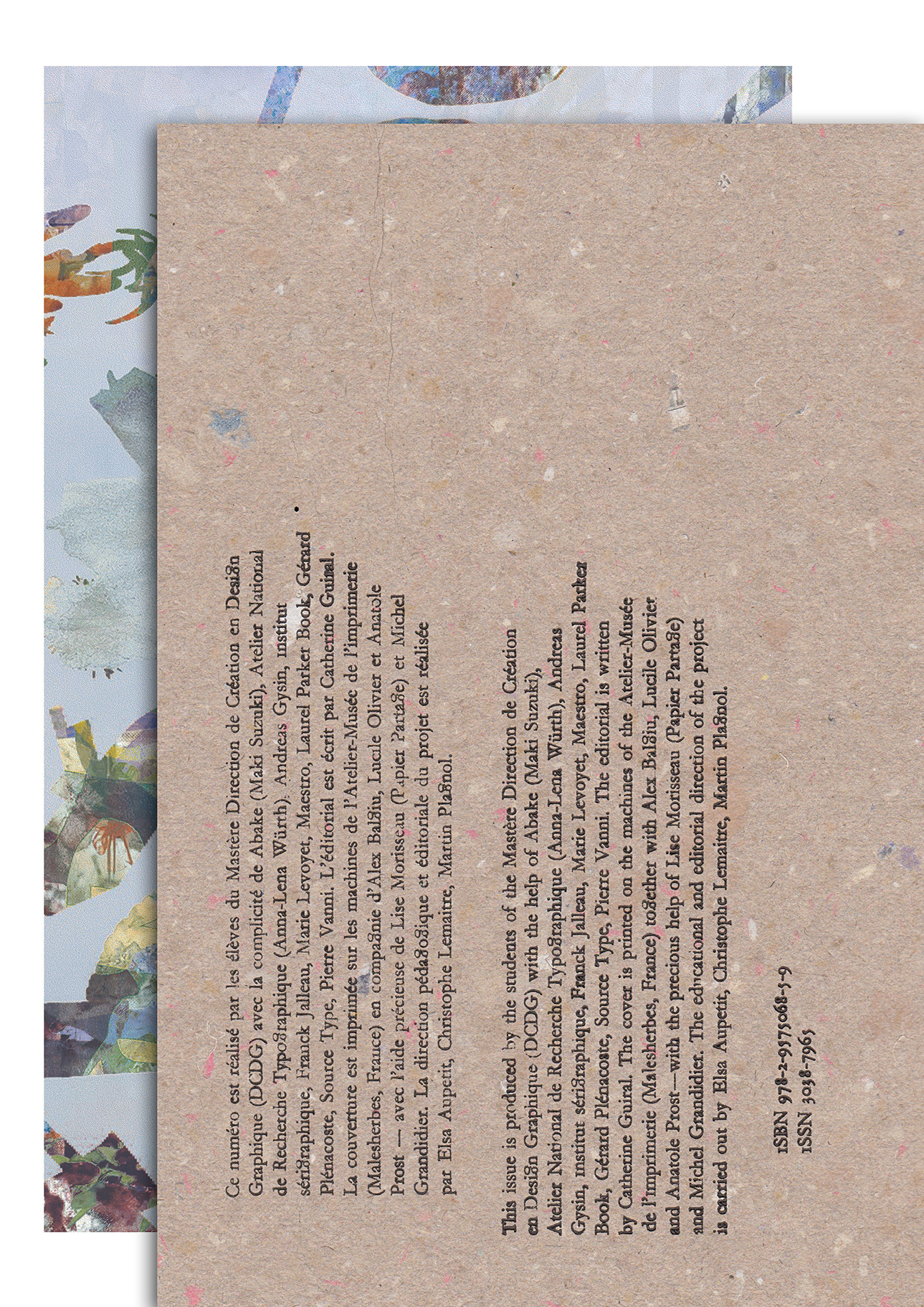 Atelier National de Recherche Typographique (Anna-Lena Würth), Andreas Gysin, Institut sérigraphique, Franck Jalleau, Marie Levoyet, Maestro, Laurel Parker, Gérard Plénacoste, Source Type, Pierre Vanni. The editorial is written by Catherine Guiral. The cover is printed on the machines of the Atelier-Musée de l'Imprimerie (Malesherbes, France) under the supervision of Alexandru Balgiu. The educational and editorial direction of the project is carried out by Elsa Aupetit,