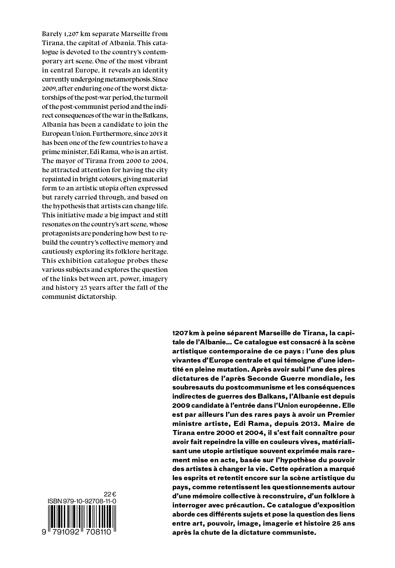 Barely 1,207 km separate Marseille from Tirana, the capital of Albania. This catalogue is devoted to the country's contemporary art scene. One of the most vibrant in central Europe, it reveals an identity currently undergoing metamorphosis. Since 2009, after enduring one of the worst dictatorships of the post-war period, the turmoil of the post-communist period and the indirect consequences of the war in the Balkans, Albania has been a candidate to join the European Union. Furthermore, since 2013 it has been one of the few countries to have a prime minister, Edi Rama, who is an artist. The mayor of Tirana from 2000 to 2004, he attracted attention for having the city repainted in bright colours, giving material form to an artistic utopia often expressed but rarely carried through, and based on the hypothesis that artists can change life. This initiative made a big impact and still resonates on the country's art scene, whose protagonists are pondering how best to rebuild the country's collective memory and cautiously exploring its folklore heritage. This exhibition catalogue probes these various subjects and explores the question of the links between art, power, imagery and history 25 years after the fall of the communist dictatorship.