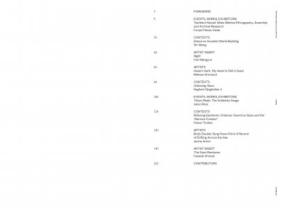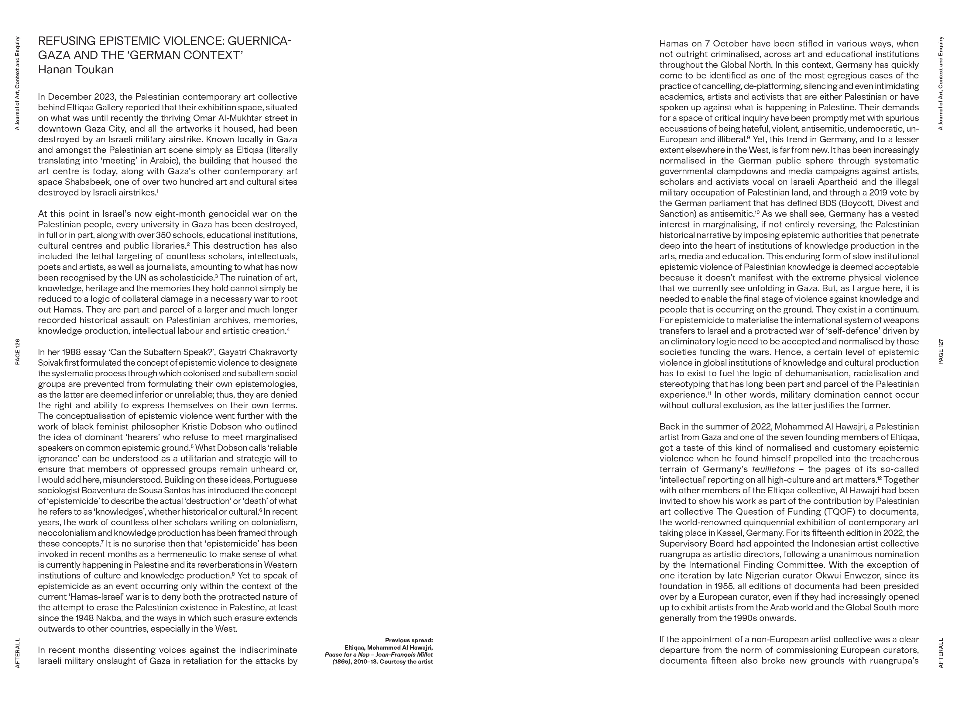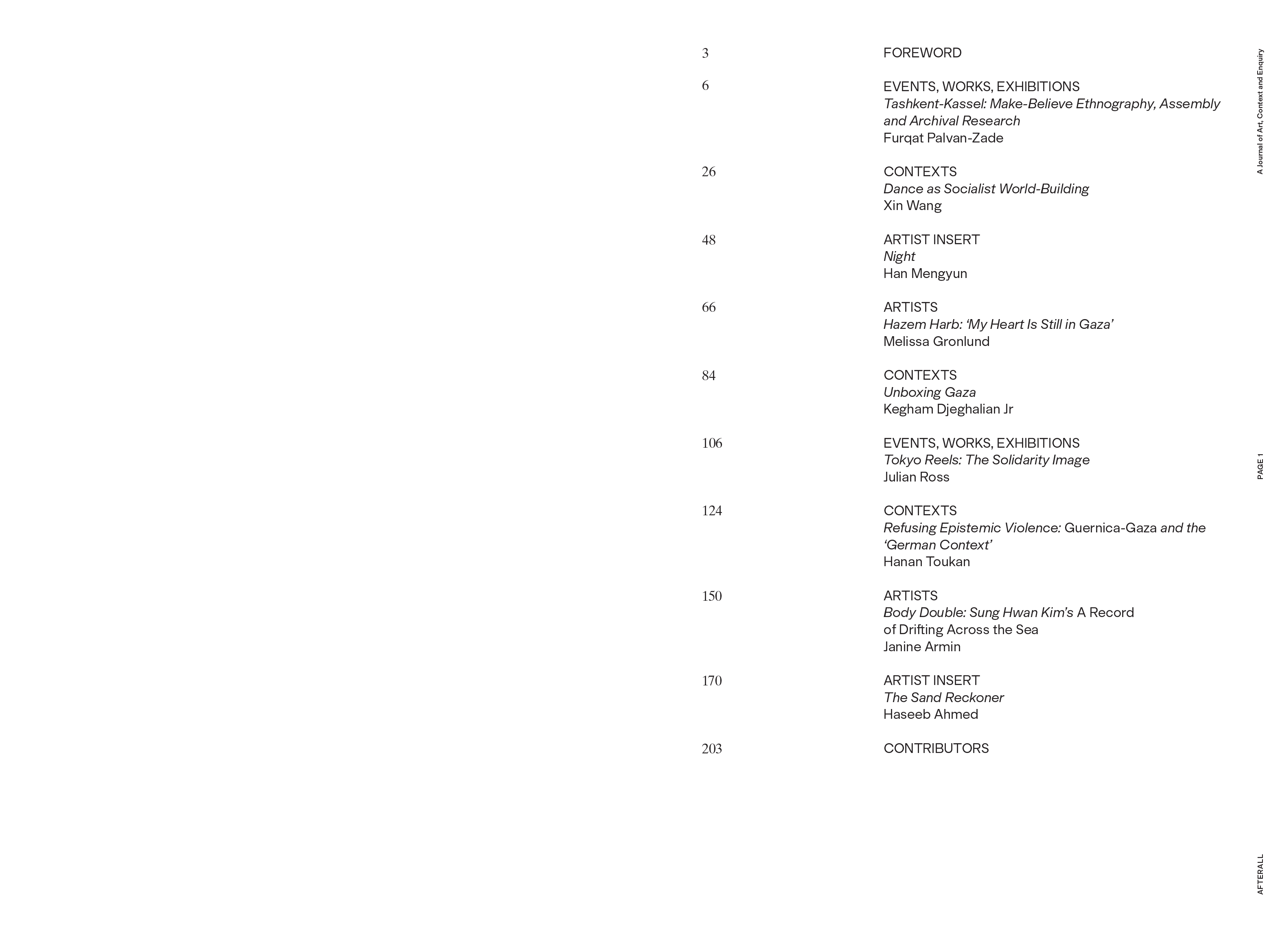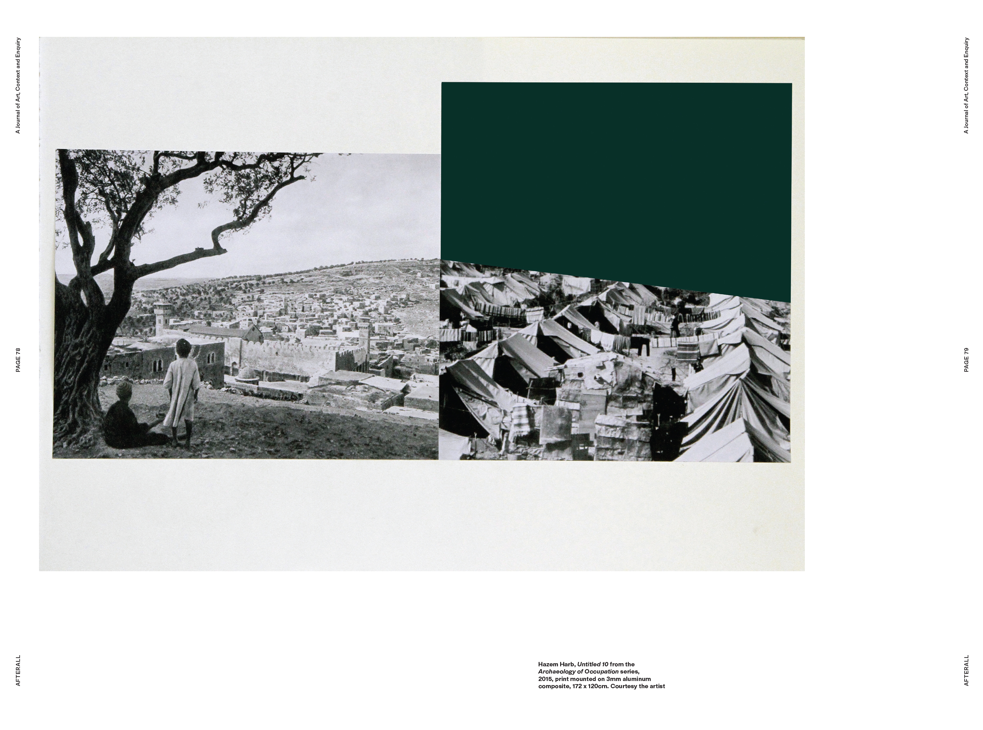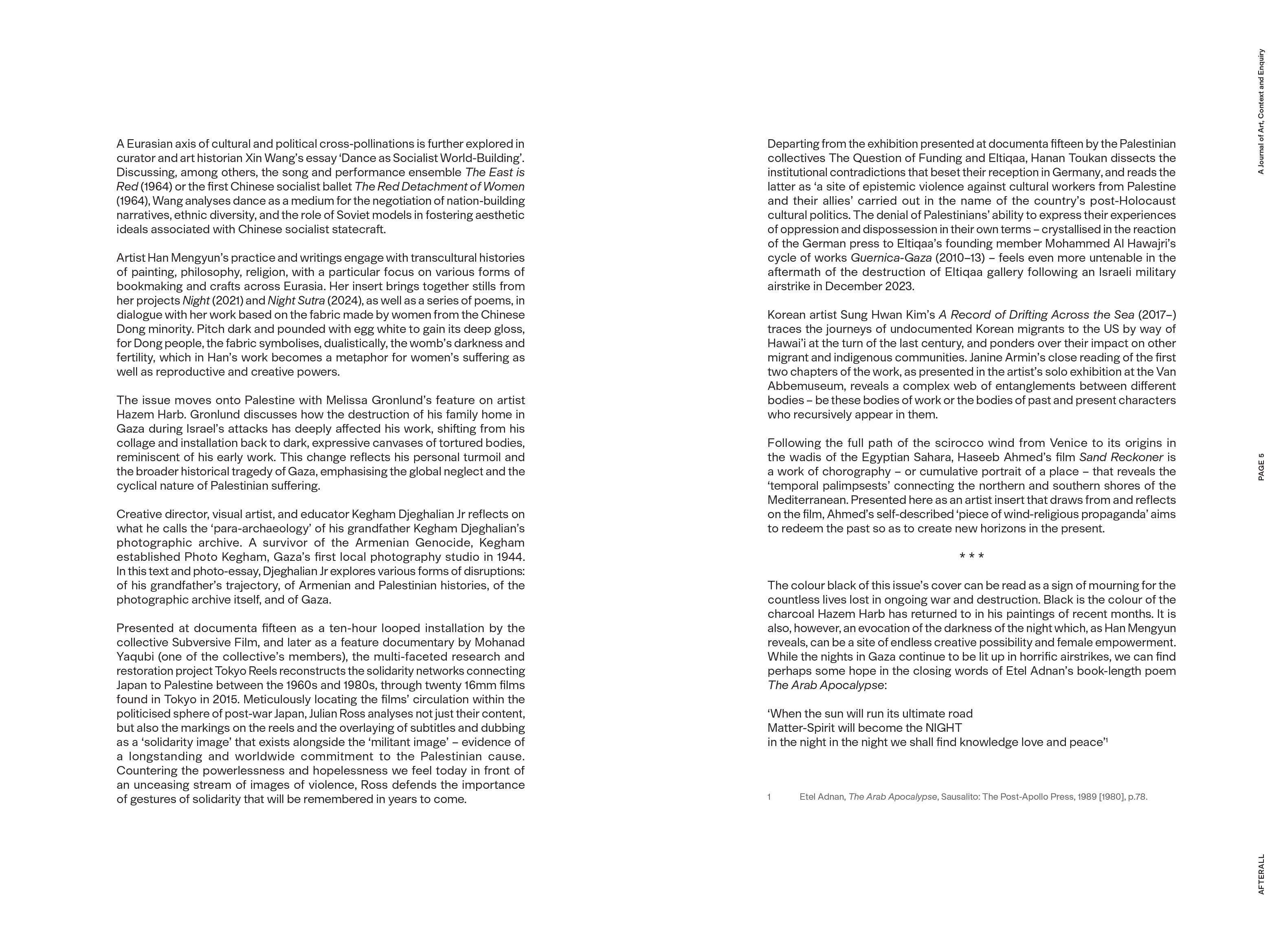 Following documenta 15's cascading logic, this issue then branches out, on the one hand, towards further engagements with Palestinian art and visual culture as a way to fend off ongoing erasure and, on the other, towards new understandings of geographies of art practices and histories.