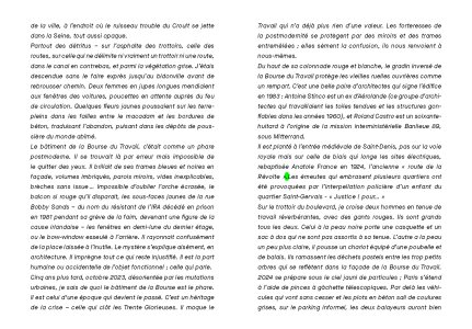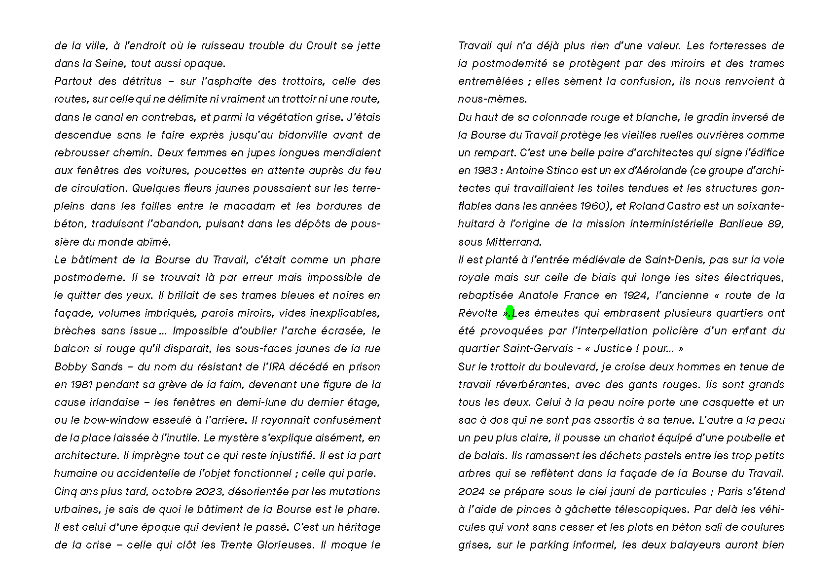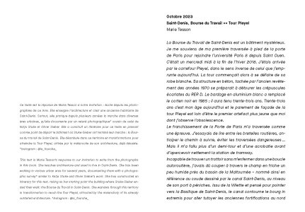 The text that accompanies this book is the fruit of another wandering, that of Marie Tesson, from Saint-Denis to the Pleyel Tower. A way of extending the reflection on what lies beneath the many layers of the city's architecture, particularly those of the megacity.