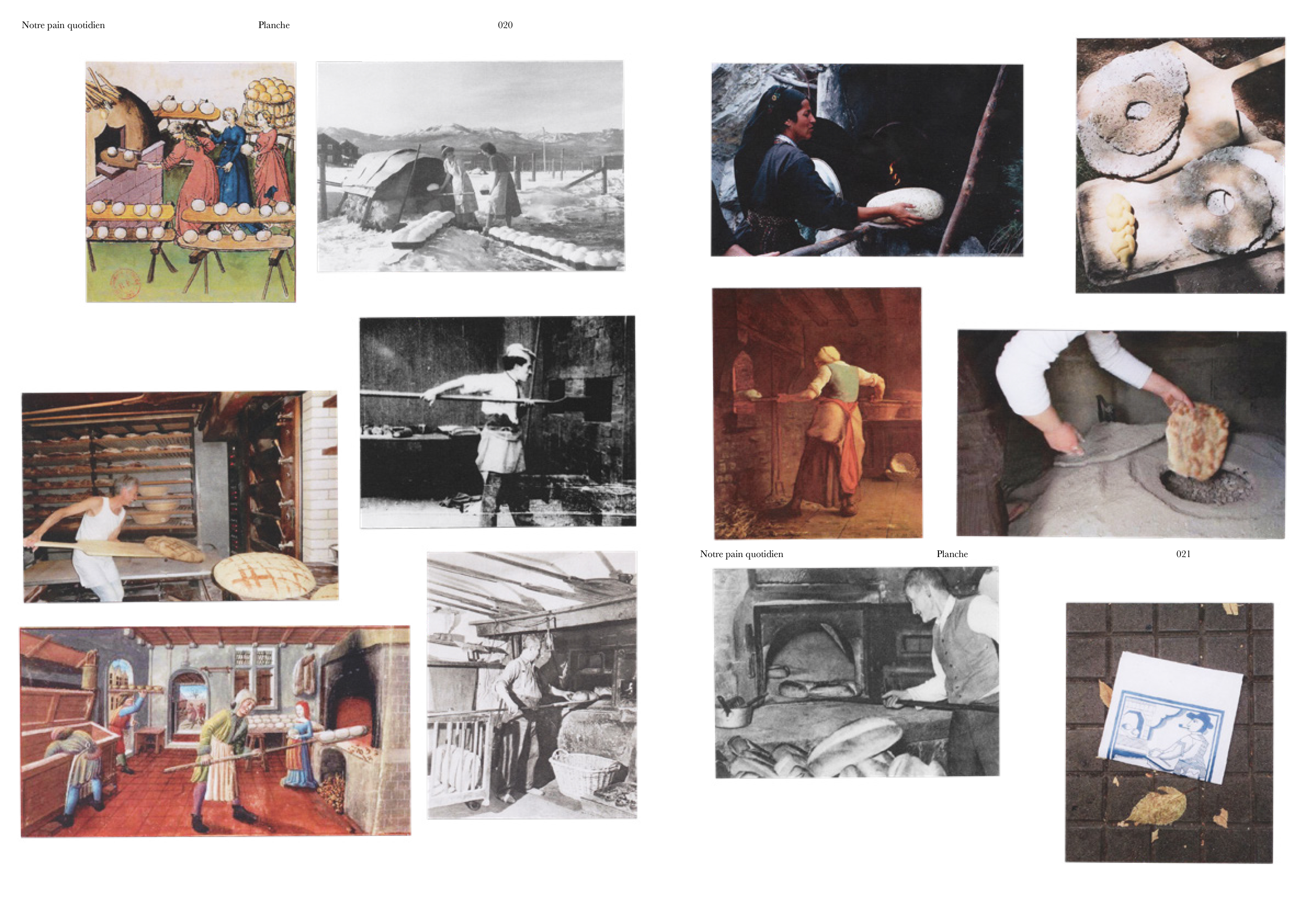 Notre pain quotidien is a collection of images presented in the form of 156 iconographic spreads. Sourced from various media and mediums such as social networks, cookbooks, educational manuals, and audiovisual archives, these images have been printed to the same scale, cut out, and manually arranged on the confined space of A4 sheets. Transitioning from crumbs to wholeness, these spreads group together different aspects of the culture and iconography of bread without hierarchization, but thematically. As the pages unfold, a collective memory emerges around this staple food which acts as a catalyst for community—covering its production to its most varied uses.