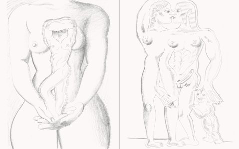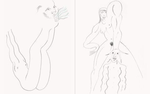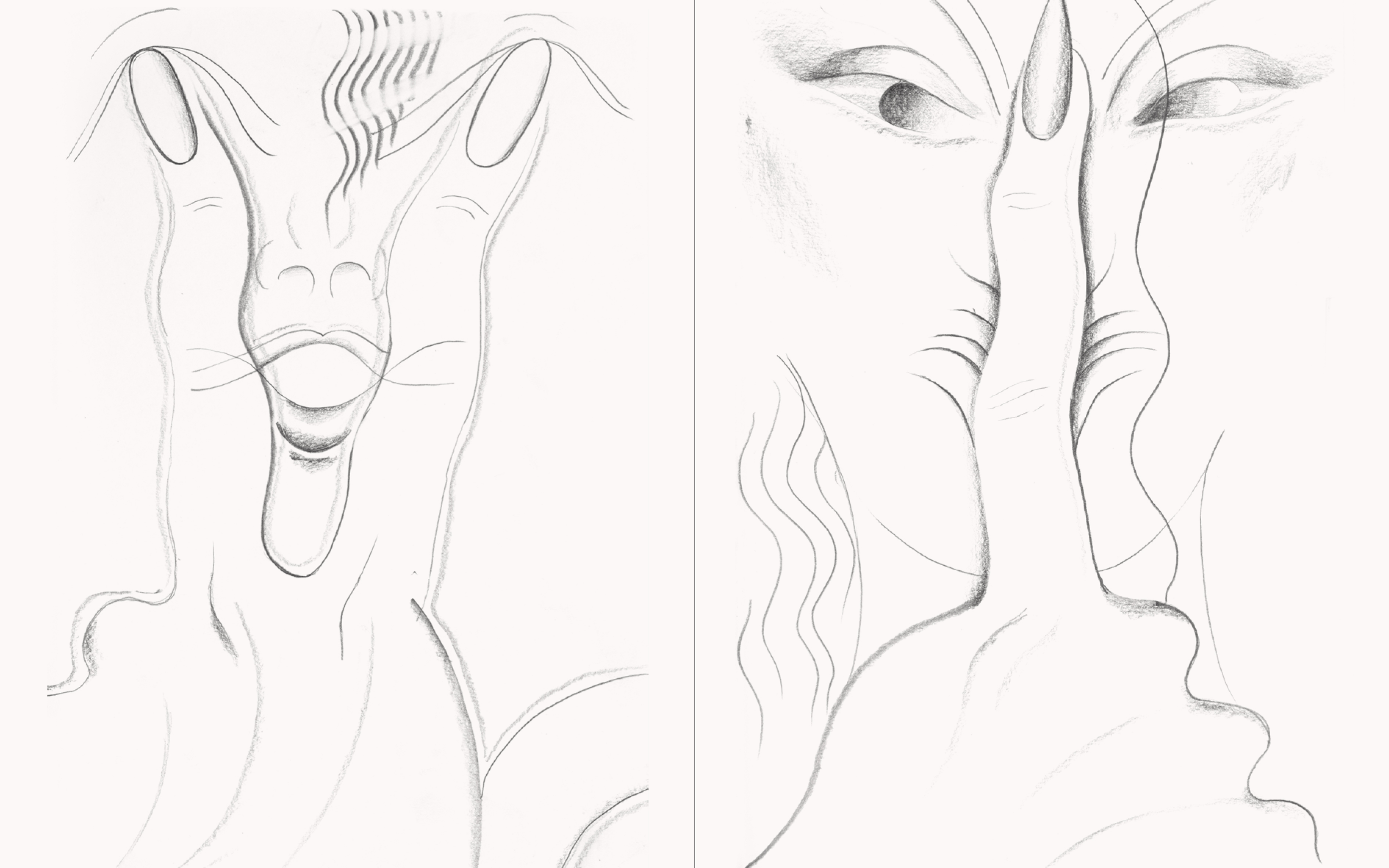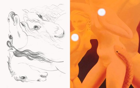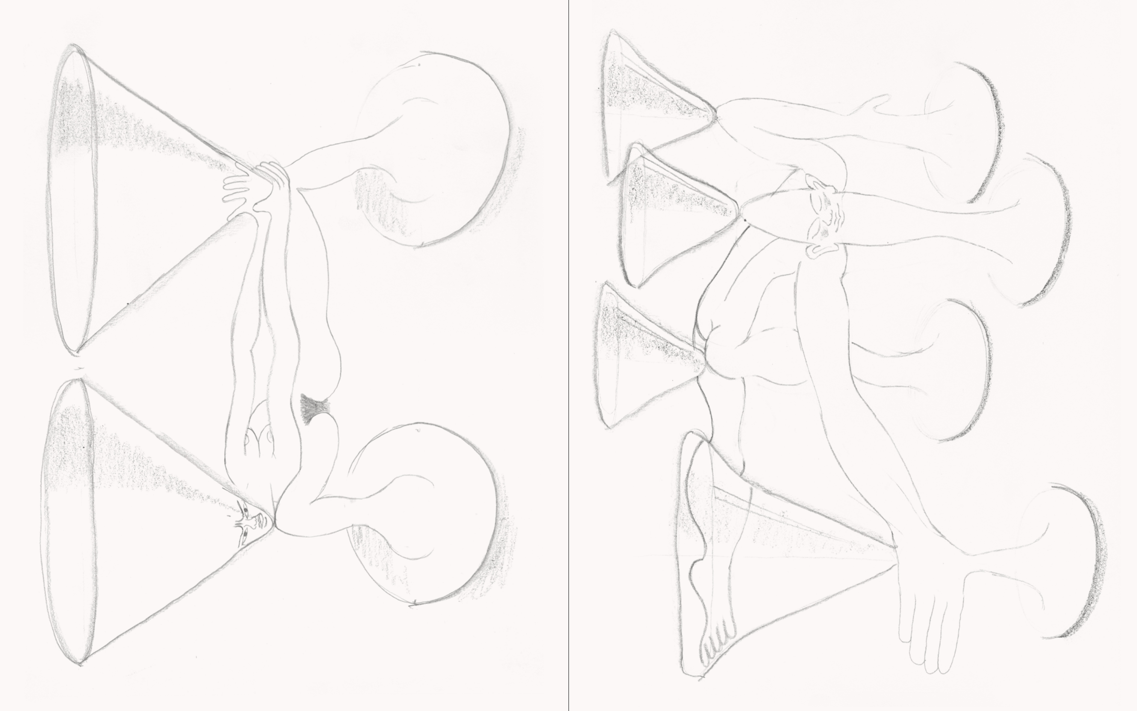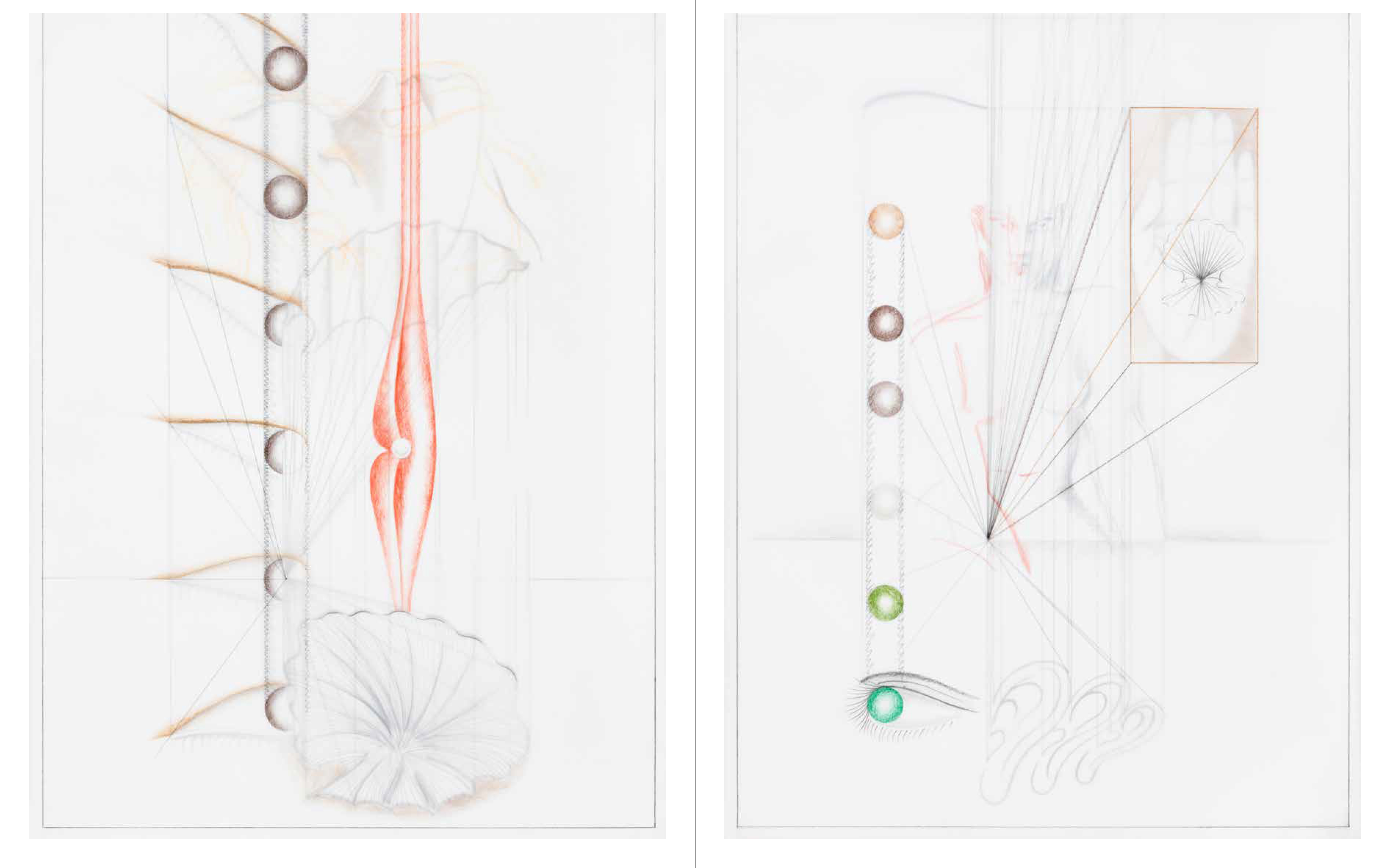Upside-down trees with roots reaching toward the cosmos, glasses, pitchers, transparent vessels, and bodies blending human and animal, male and female features populate Jacopo Pagin's works. These figures reveal themselves in their decadent and symmetrical being, caught within a web of references centered on the evocative power of the gaze.