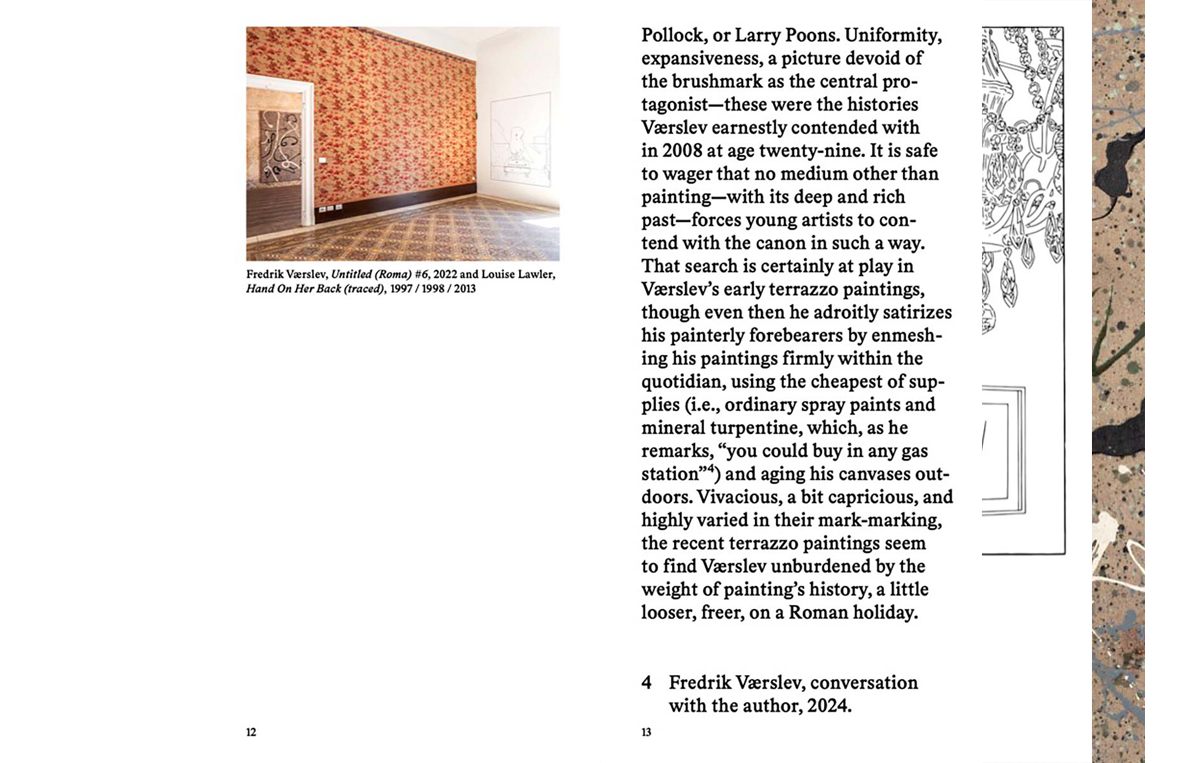 painting, Norwegian artist Fredrik Værslev navigates between different painterly traditions. His practice demonstrates an insistent focus on the painting process that demonstrates the possibilities and relevance of the medium today. His works stem from the meeting between architecture and painting, and take form as painted renderings of motifs from the artist's daily life. He treats his paintings as objects, often created through more or less laborious, serial, or deterministic processes where time itself, as well as various external factors, become active co-creators in the making of the piece. In several series he left his paintings outdoors for long periods of time, allowing the weather and external wear to complete them. Other works employ apparently clichéd techniques, motifs, or art historical quotations (i.e. dripping and splattering). Værslev also challenges the process of painting by freely collaborating with fellow artists or making use of untraditional painting tools, such as spray cans or equipment used to paint roads and sports arenas. Værslev's paintings often shift between abstraction and representation, as can be seen in his breakthrough series, the “terrazzo” paintings, that imitate the visuality of Italian stone floors and at the same time call upon the expressivity and spontaneity of abstract expressionism. The “Canopy” series is reminiscent of modernism and its stripe paintings, but they stem rather from the awnings at the artist's childhood home.