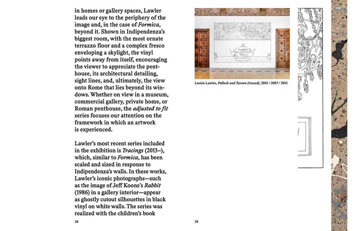 Louise Lawler's incisive practice brings to the fore the very means by which value and significance are conferred upon artworks. Her critical strategies reveal the mechanisms by which art is produced, reproduced, consumed to question how we understand issues of authorship, connoisseurship, and meaning. Through emblematic interventions belonging to the series Tracings (2013-present), Adjusted to fit (2010-present), and Paperweights (1988-present) within Indipendenza's rooms, that once served as an apartment, Lawler's works draw our attention to how we organize and present our lives to others.