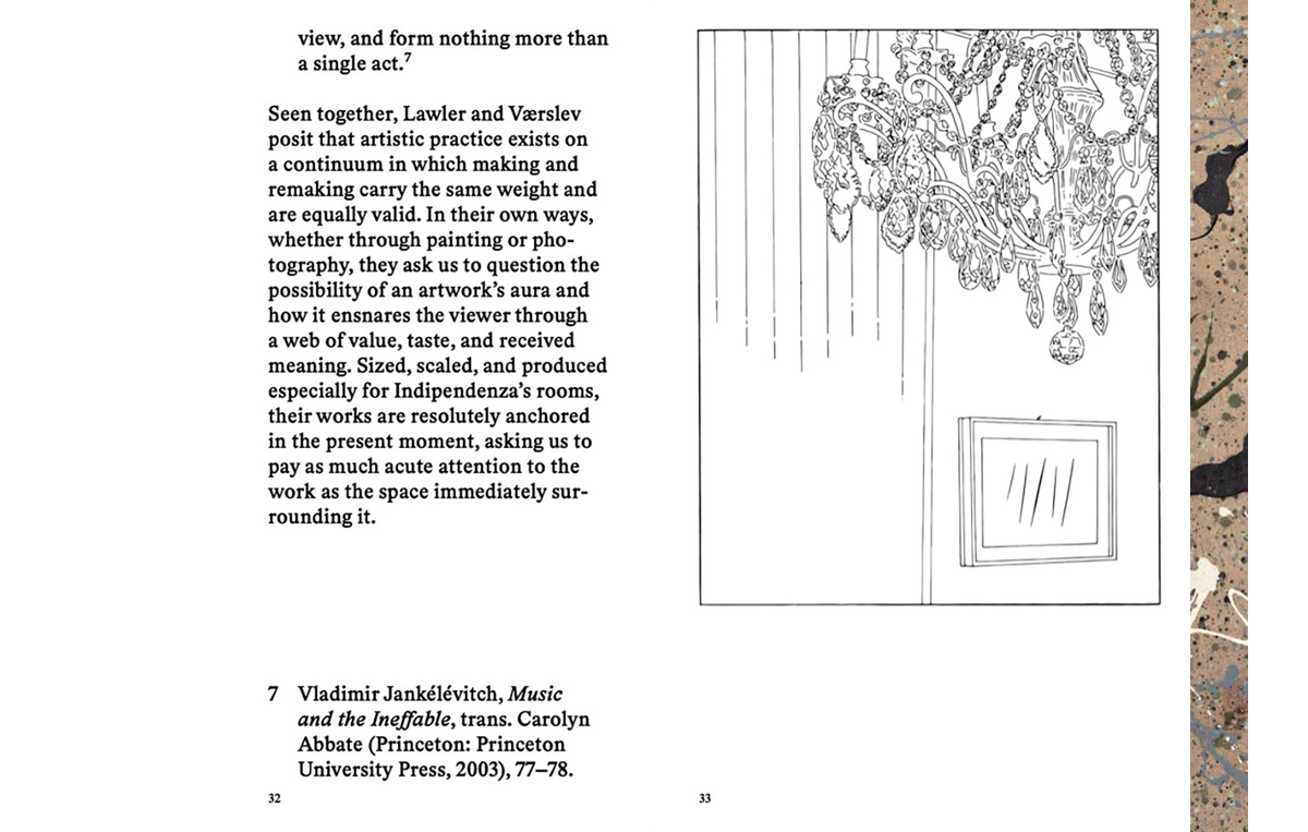 Conceived as a catalogue and an artist's book, the publication offers a deeper insight into the eponymous 2022 exhibition staged at Indipendenza Roma, and explores tensions that can be generated between artworks and their surrounding architectural context, raising questions of taste, value, function and decoration.