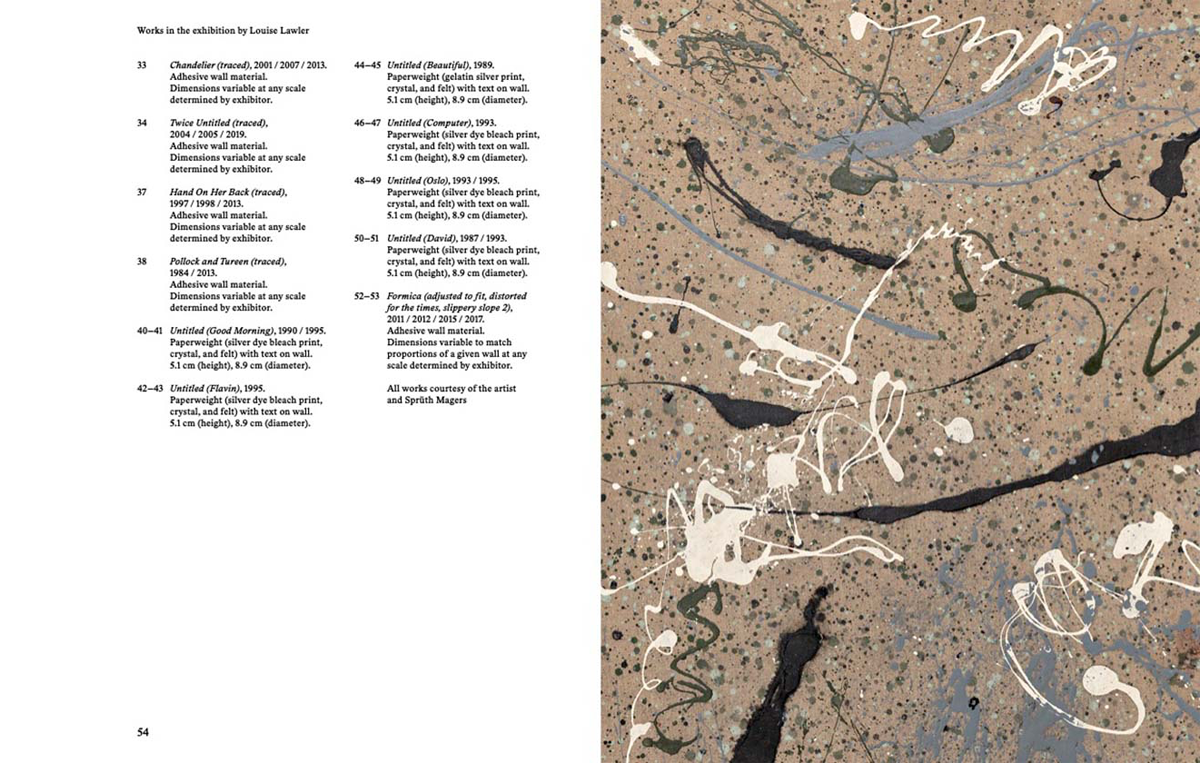 Louise Lawler's work is presented in an ostensibly clear program, as work on the conditions, procedures, instances of presentation, framing and circulation of works of art. She photographs art and its spaces, but to disturb her skillfully channeled economy of attention span and attachment. Her photographs, her diversified interventions, are defined by defocusing the viewer's attention on the works and drawing it to what surrounds them: an ensemble of set or supple relationships, both persistent and inconsistent, which, although unnoticed as such, in their opaque, elusive interactions, full of contingent contiguities, nevertheless point to specific types of authority and institutional power.
