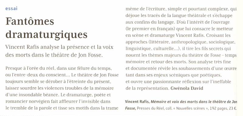 An illustrated essay devoted to Norwegian author Jon Fosse, this book offers a cross-reading of the major themes of his theater, in an approach that attempts to modernize the dramaturgical exegesis by renewing his tools.