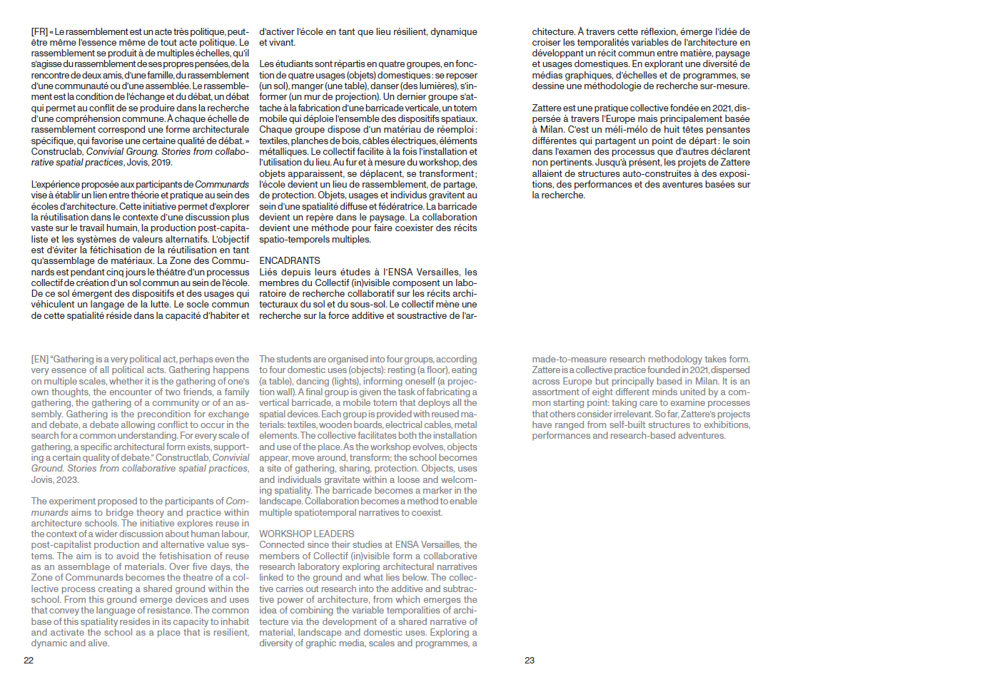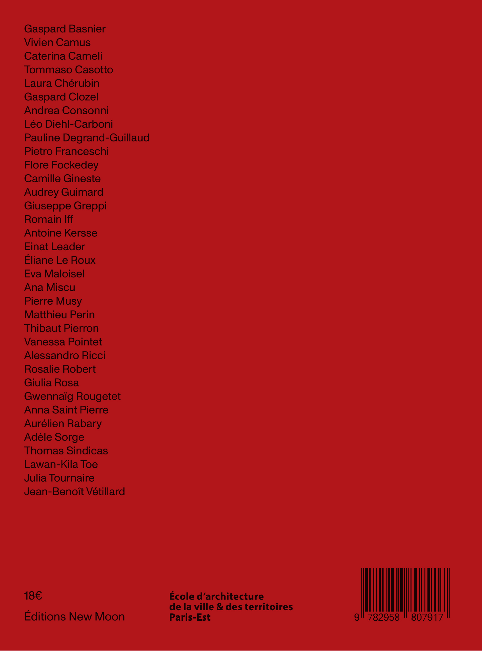 Contributions by Thibaut Barrault, Eva Maloisel, Jean-Benoît Vétillard, Collectif (in)visible & Collectif Zattere, Adèle Sorge, Aurélien Rabary, Vanessa Pointet, Thibaut Pierron, Audrey Guimard, Éliane Le Roux, Anna Saint Pierre, Ana Miscu, Thomas Sindicas, Léa Cottreel, Rosalie Robert, Pauline Degrand-Guillaud, Antoine Kersse & Julia Tournaire, Camille Gineste, Gwennaïg Rougetet, Vivien Camus, Flore Fockedey, Matthieu Perin, Einat Leader, Romain Iff, Pierre Musy, Collectif xenia, Gaspard Clozel & Laura Chérubin.