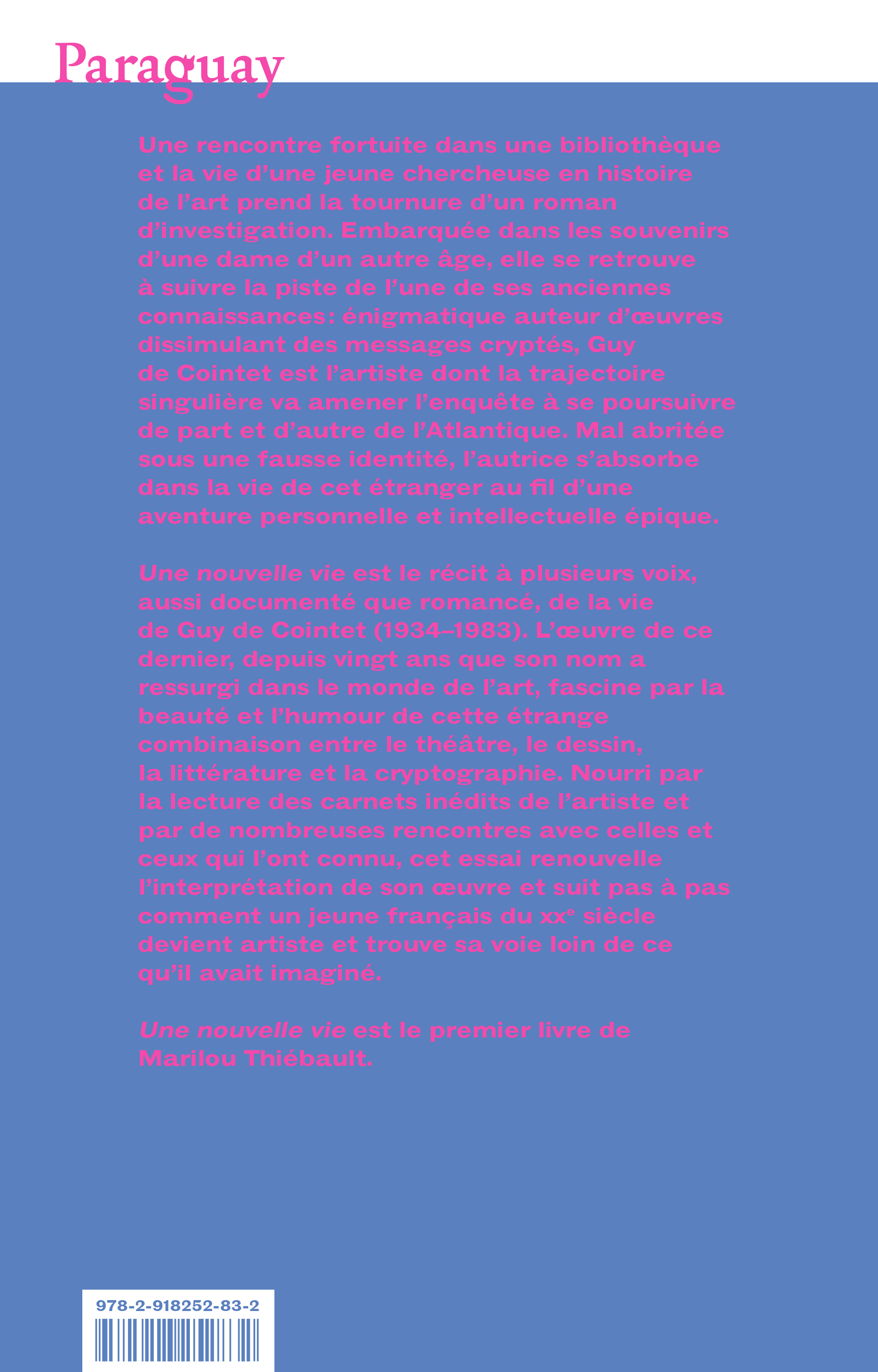 A New Life is the multi-voiced account, as documented as it is fictionalized, of the life of Guy de Cointet. The latter, for twenty years since his name resurfaced in the art world, fascinates with the beauty and the humor of his work, a strange combination of theater, drawing, literature and cryptography. Enriched by the reading of the artist's unpublished notebooks and by numerous interviews with those who knew him, this essay renews the interpretation of his work and tells how a young Frenchman in the 20th century becomes an artist and finds his way far from what he had imagined.