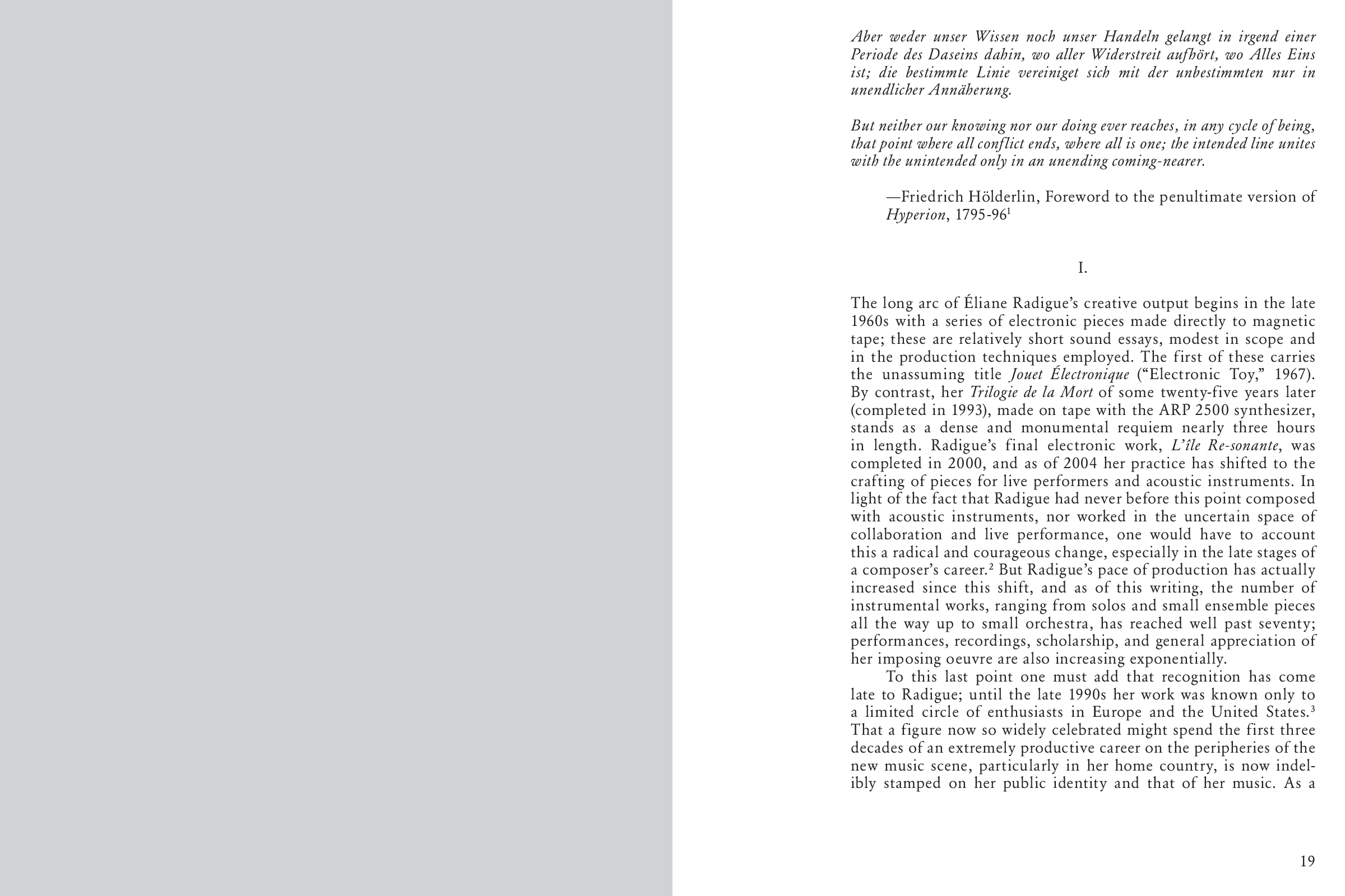 This volume explores the early electronic work of French composer Éliane Radigue, whose radical approach to feedback, analog synthesis, and composition on tape has long evaded historical and technical interpretation. Combining key texts, newly translated primary documents, in-depth interviews, and commissioned essays, this compendium interrogates the composer's idiosyncratic compositional practice, which both embraces and confounds the iterative nature of magnetic tape, the subtleties of amplification, and the very experience of listening.