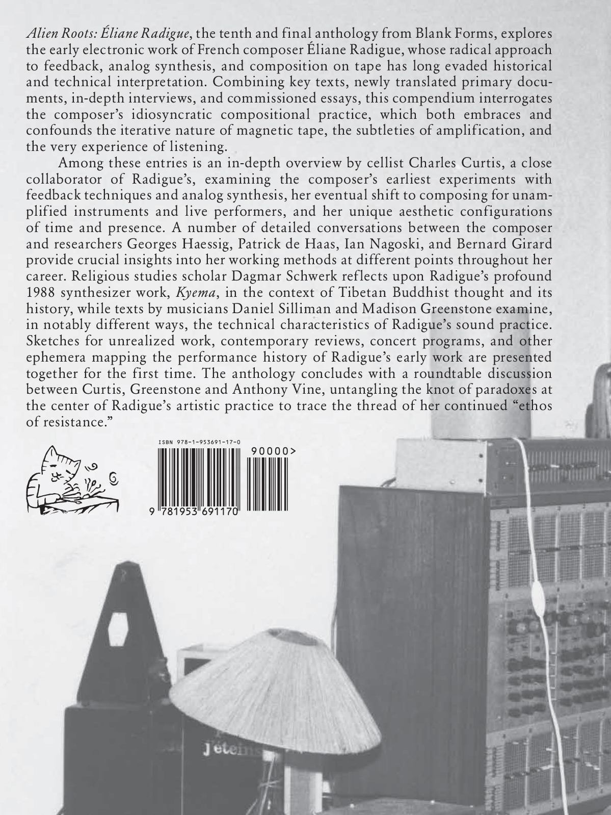 The tenth and final anthology from Blank Forms offers an exceptional insight into the work, working methods and thinking of the French pioneer of musique concrète and electroacoustic composition Éliane Radigue, through key texts, a wealth of archival documents (including correspondence, notes and sketches for works, concert flyers, photographs, drawings, reviews, etc.), in-depth interviews and commissioned essays.