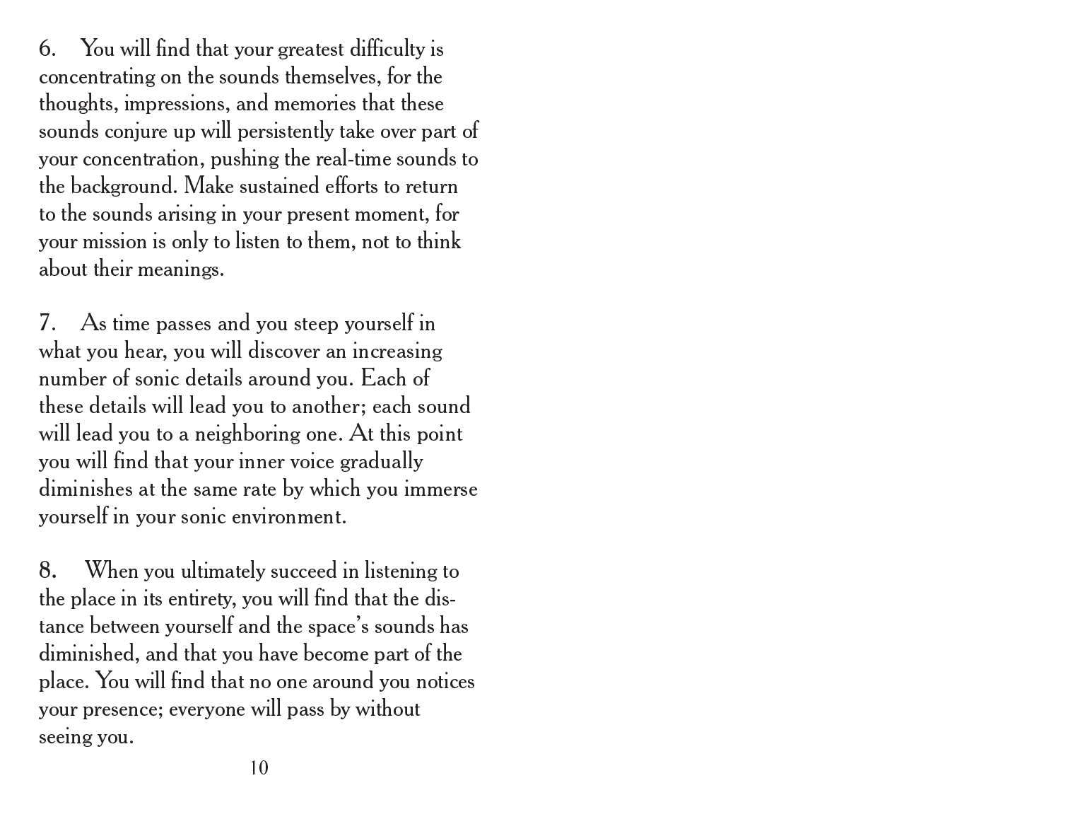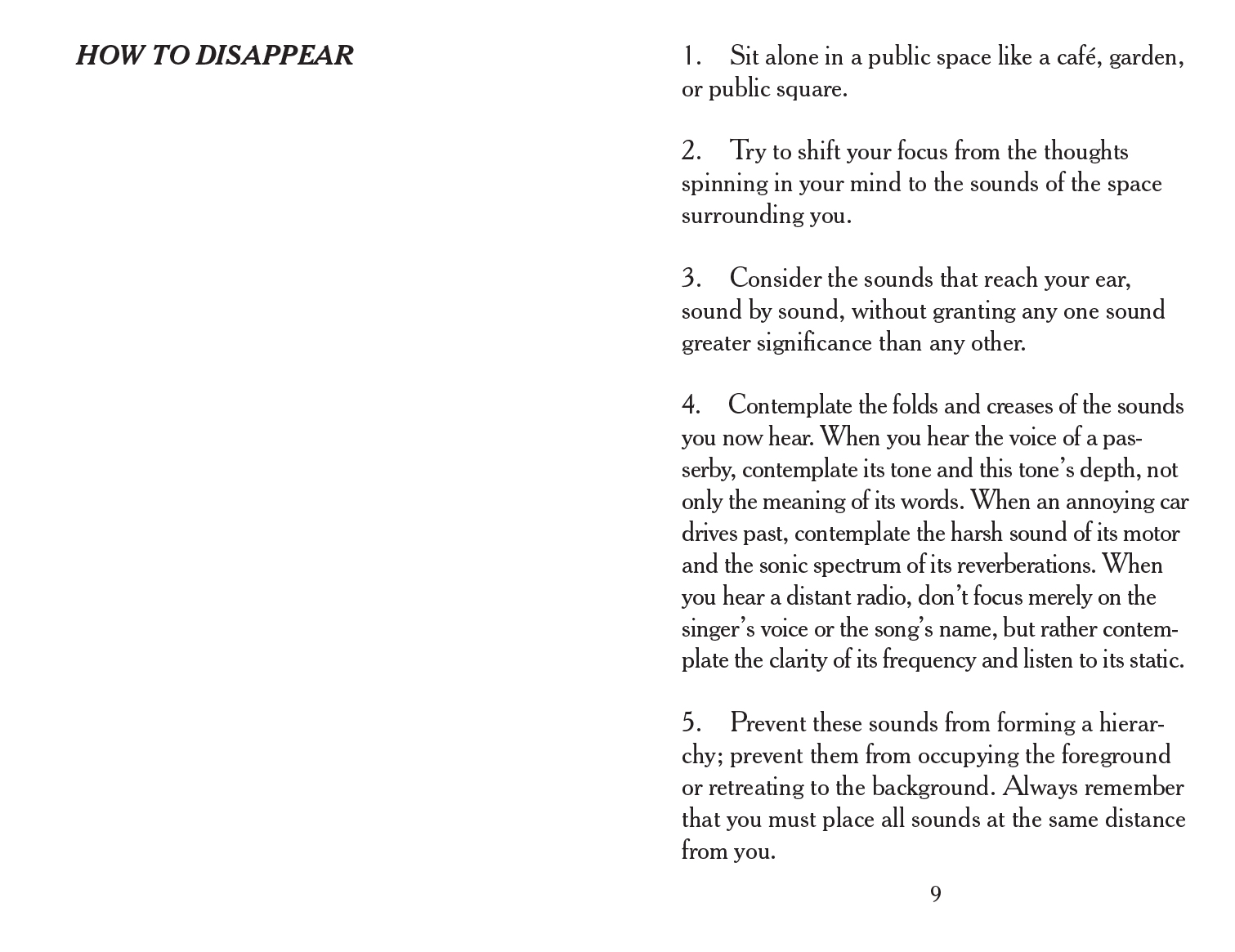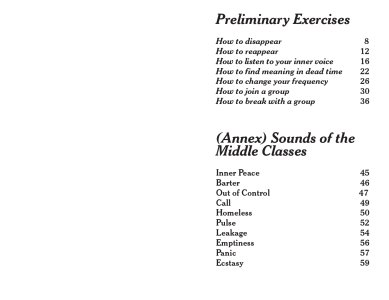 This publication proposes a set of aural exercises that show readers how to disappear, reappear, join a group, or leave a group. Its annex is a lexicon of some of the sounds that dwell in or are banished from the middle-class household.