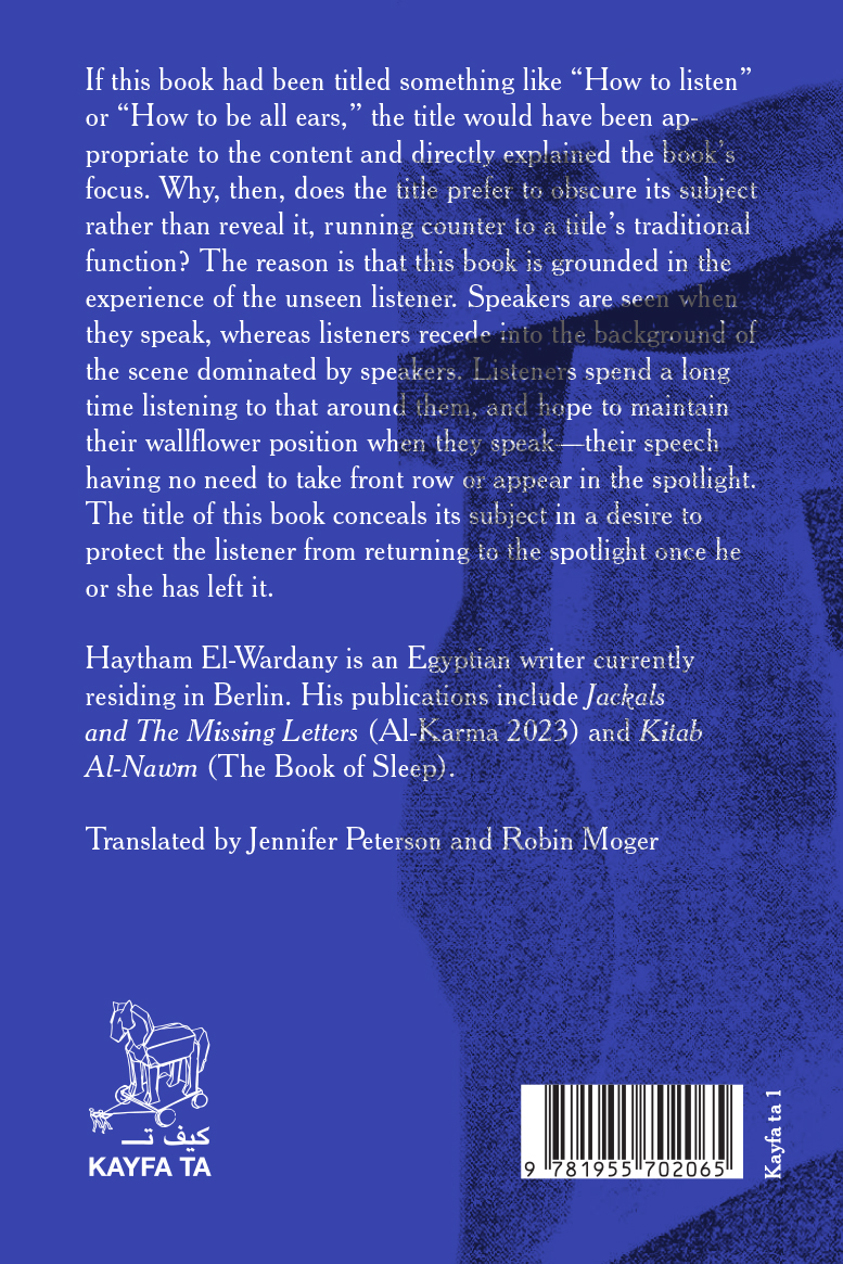 "If this book had been titled something like 'How to listen' or 'How to be all ears,' the title would have been appropriate to the content and directly explained the book's focus. Why, then, does the title prefer to obscure its subject rather than reveal it, running counter to a title's traditional function? The reason is that this book is grounded in the experience of the unseen listener. Speakers are seen when they speak, whereas listeners recede into the background of the scene dominated by speakers. Listeners spend a long time listening to that around them, and hope to maintain their wallflower position when they speak—their speech having no need to take front row or appear in the spotlight. The title of this book conceals its subject in a desire to protect the listener from returning to the spotlight once he or she has left it."