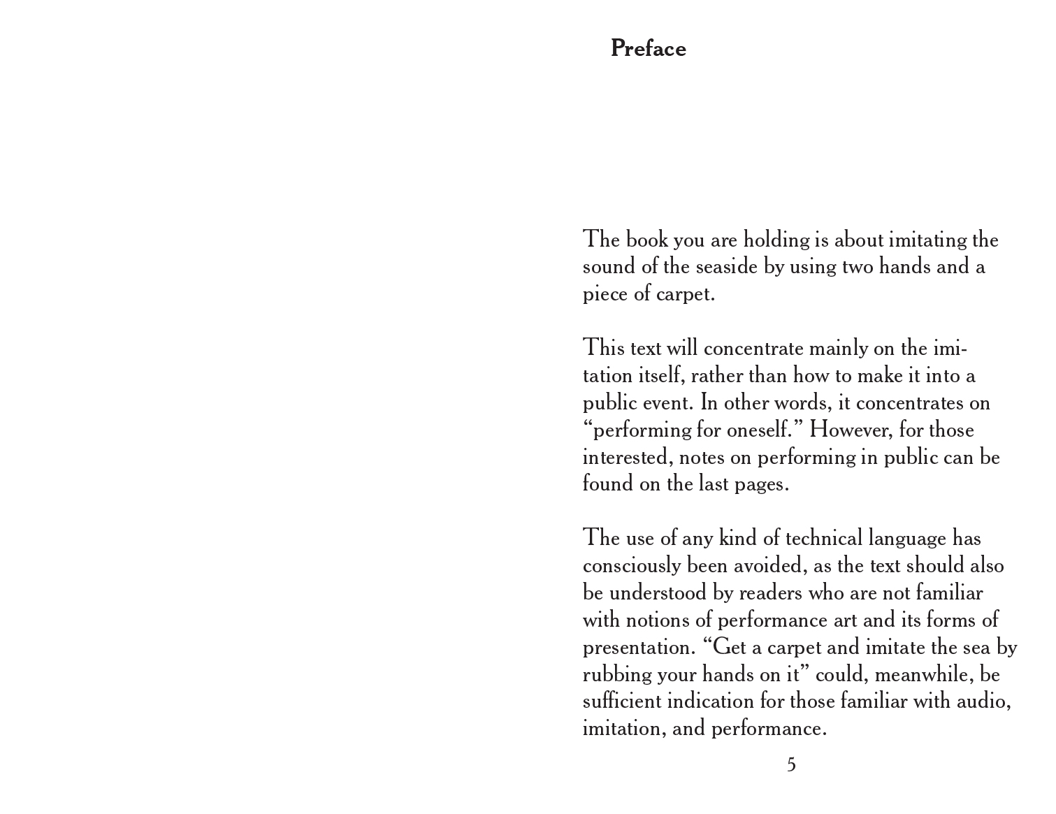 SSS: How to imitate the sound of the shore using two hands and a carpet is, at first glance, exactly what it claims to be: an in-depth manual for staging a private (or public) performance, in which one uses both hands and a carpet to imitate the sounds of water making contact with land. Cevdet Erek's book includes diagrams and photographs, which illustrate possible methods for producing this effect, while also addressing theoretical and methodological issues related to the representation of nature.