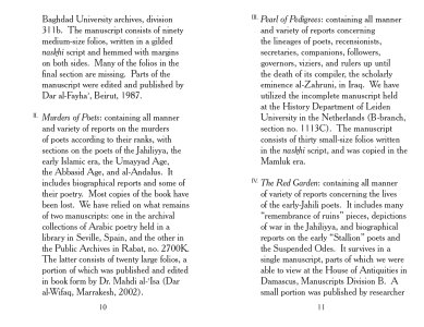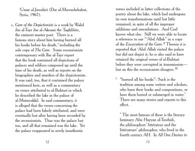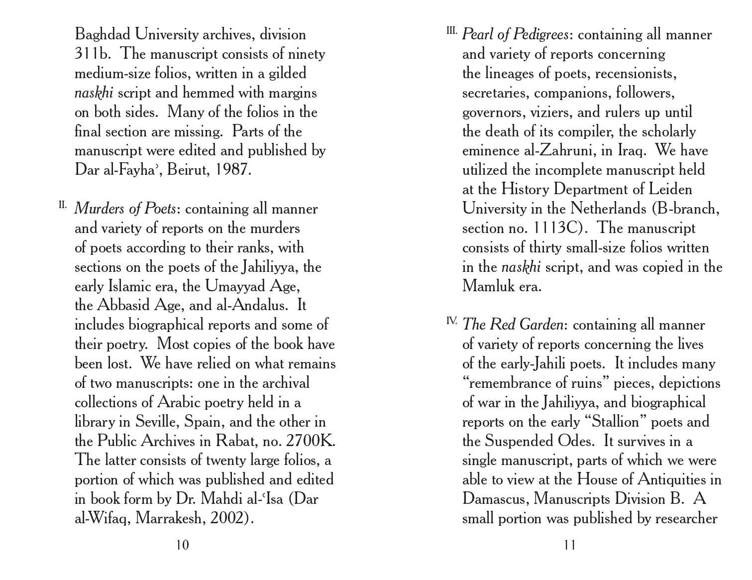 The book begins with one single verse of poetry on "Abdallāh - The Slain" (Abdallāh al Qateel), a poet who was killed by the last thing he saw: the columns of the castle as palm trees. The rest of the book is footnotes on each word in this verse, and on the works of this poet, who only exists on the margins of the arabic literary canon. The text extends to reflect on monumentality, architectural descriptions, disappearance of texts and histories, and the different ways a metaphor could kill it's poet.