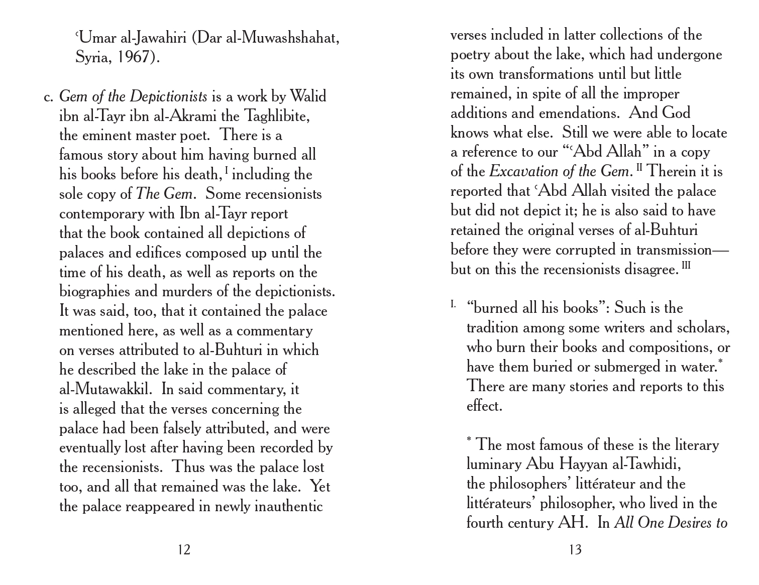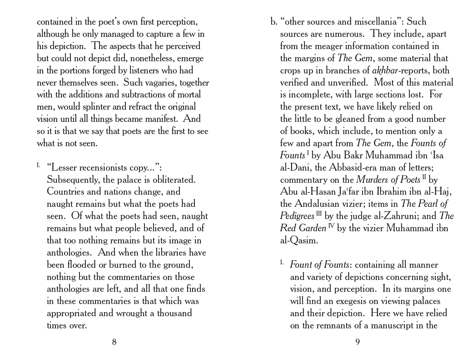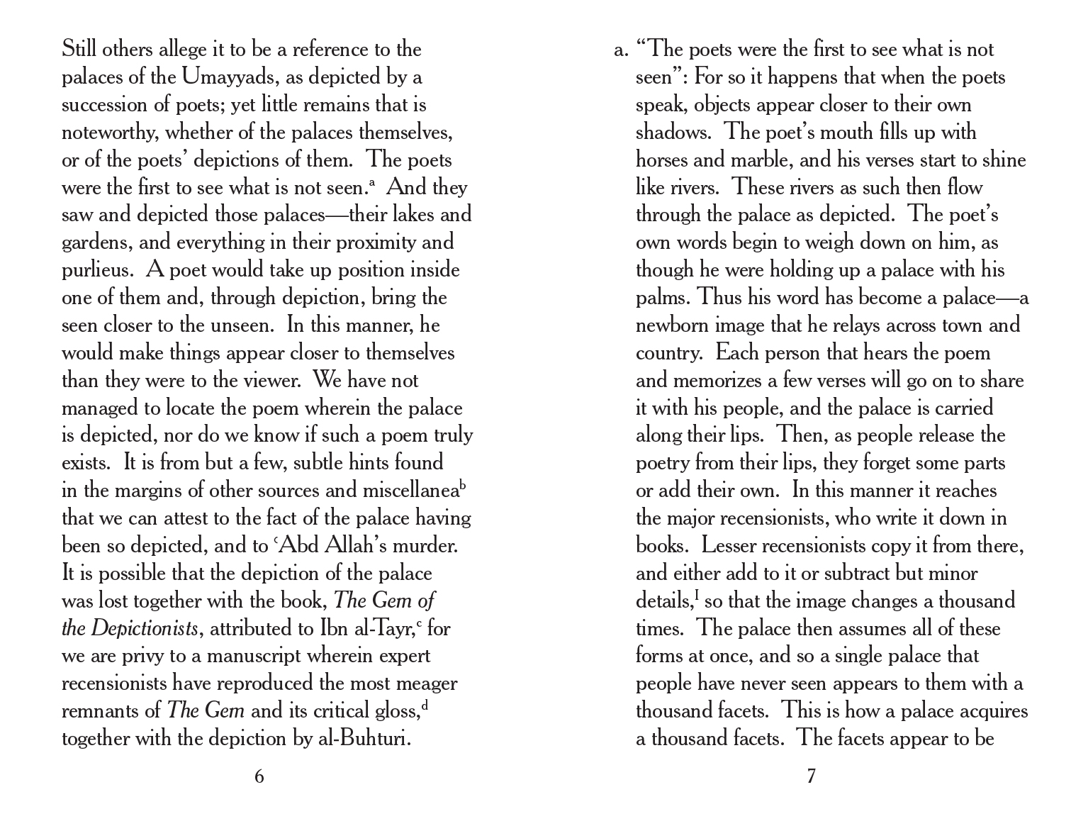 For so it happens that when the poets speak, objects appear closer to their own shadows. The poet's mouth fills up with horses and marble, and his verses start to shine like rivers. These rivers then turn back to flow through the very palace he is depicting. The poet's own words begin to weigh down on him, as though he were holding up a palace with his palms. Then he travels, and the palace is obliterated. Countries and nations change, and naught remains but what the poets had seen. Of what the poets had seen, naught remains but its image in anthologies. And when the libraries have been flooded or burned to the ground, nothing but the commentaries on those anthologies are left, and all that one finds in these commentaries is that which was appropriated and wrought a thousand times over.