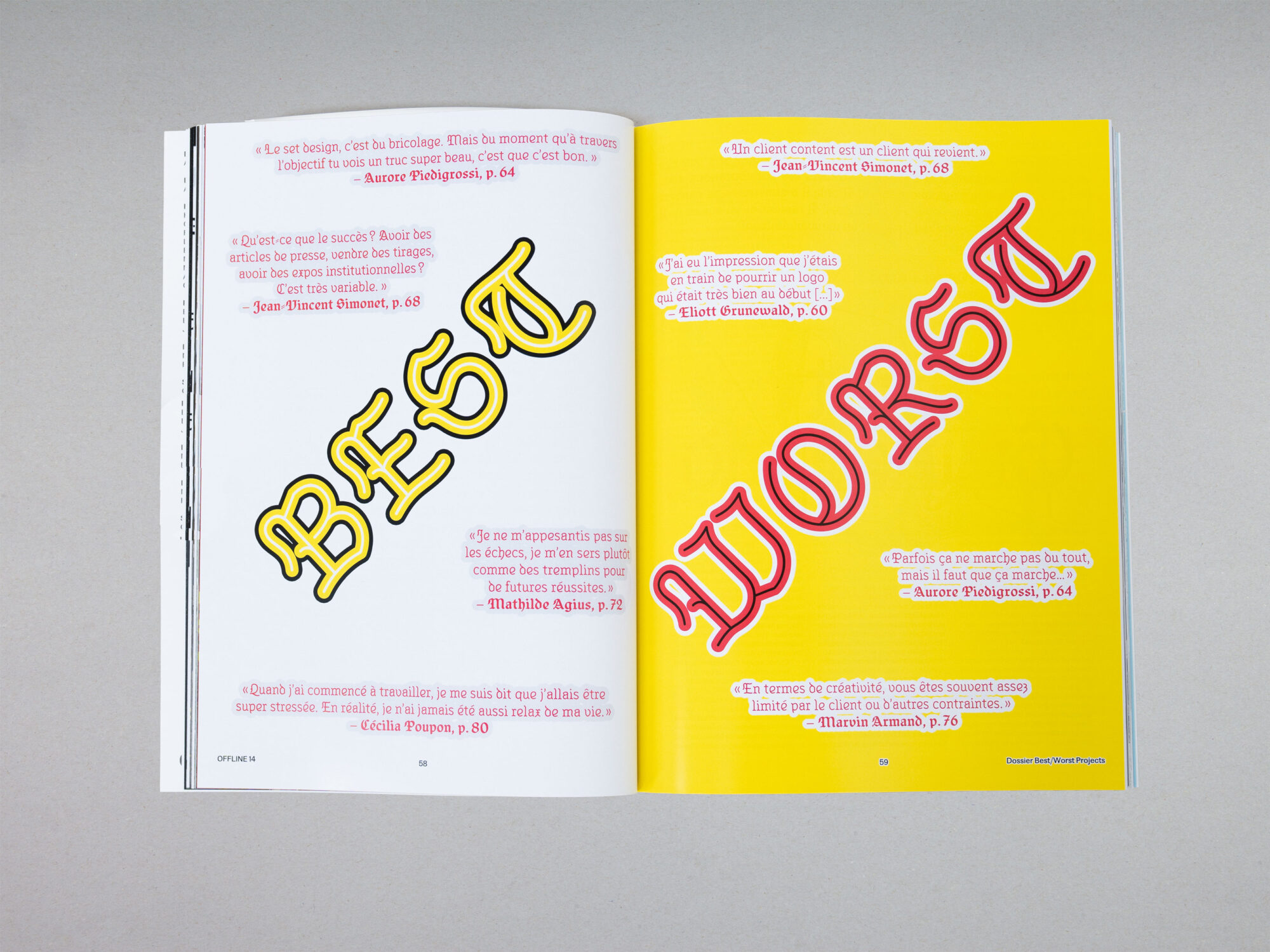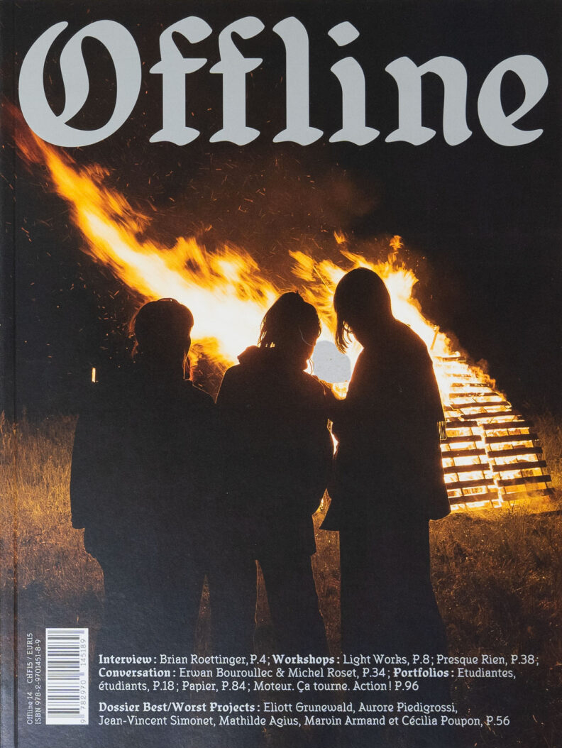 Offline is the biannual magazine of the ECAL (Lausanne University of Art and Design). Produced by the students, it presents a glimpse of the current events of the year: workshops, masterclasses, exhibitions, trips, etc., through interviews and portfolios. Each issue is structured around a thematic dossier, which is an opportunity to examine an issue from different points of view. Finally, reviews of diploma theses (Visual Arts, Cinema, Graphic Design, Industrial Design, Media & Interaction Design, Photography) complete the set. The artistic direction of each issue is also renewed, giving the paper version its specificity.