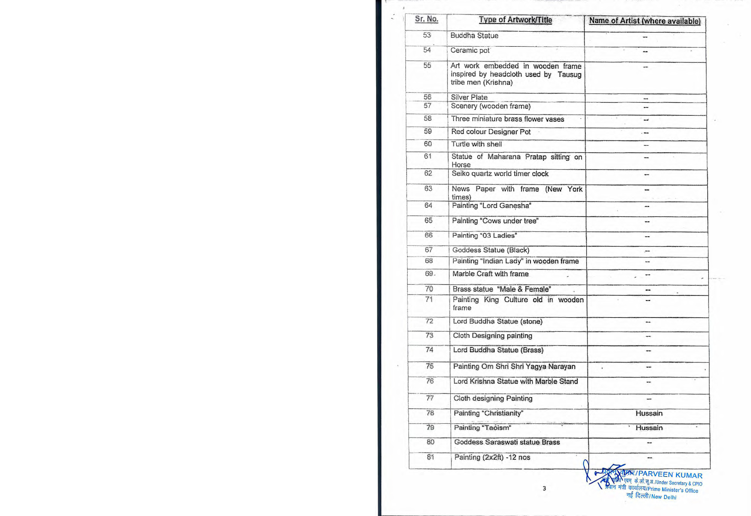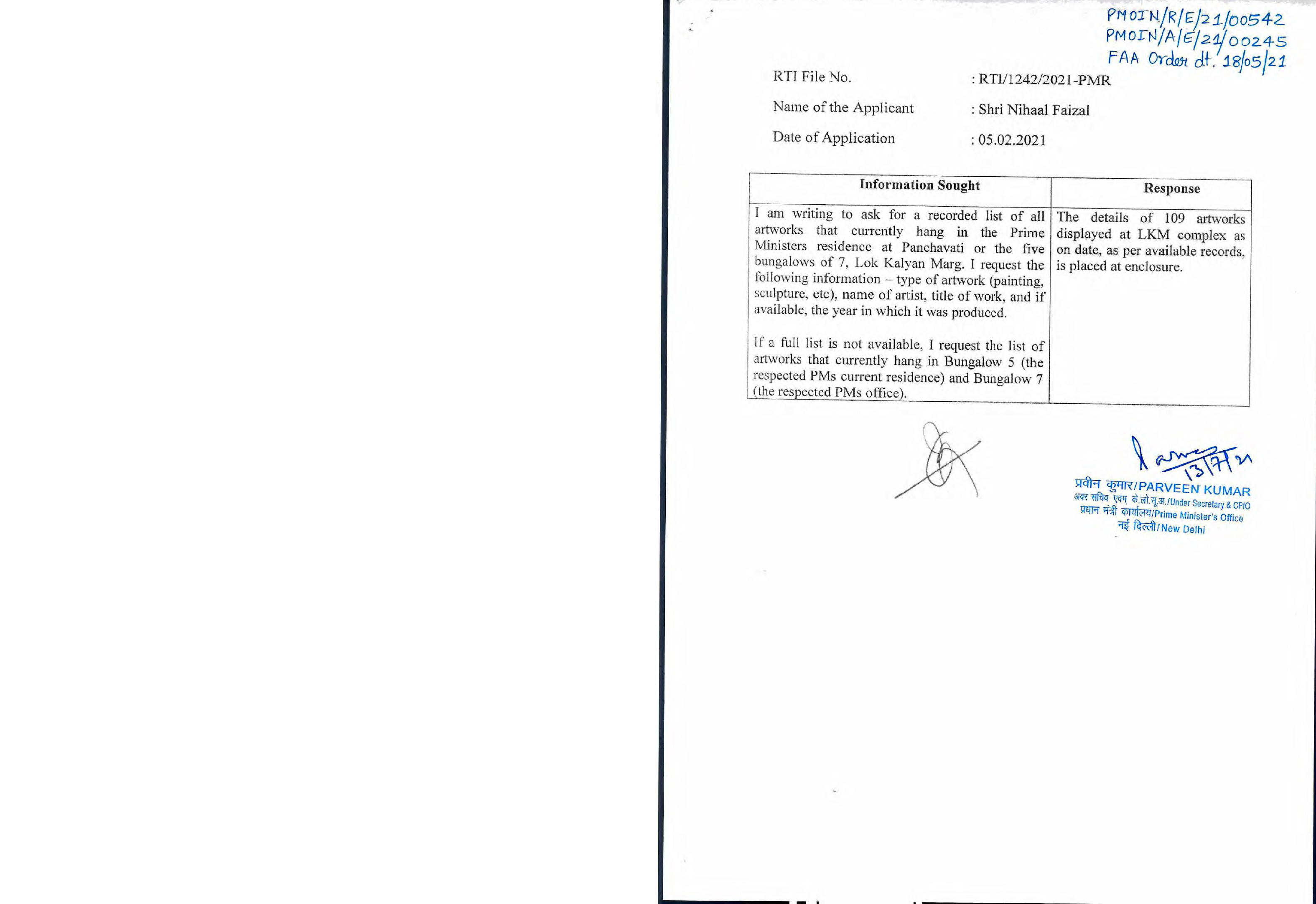 A public record document containing the list of all artworks that hang in the Indian Prime Minister Narendra Modi's official residence, as submitted by the Prime Minister's Office in response to a Right-to-Information application filed by the artist Nihaal Faizal (artists' book).