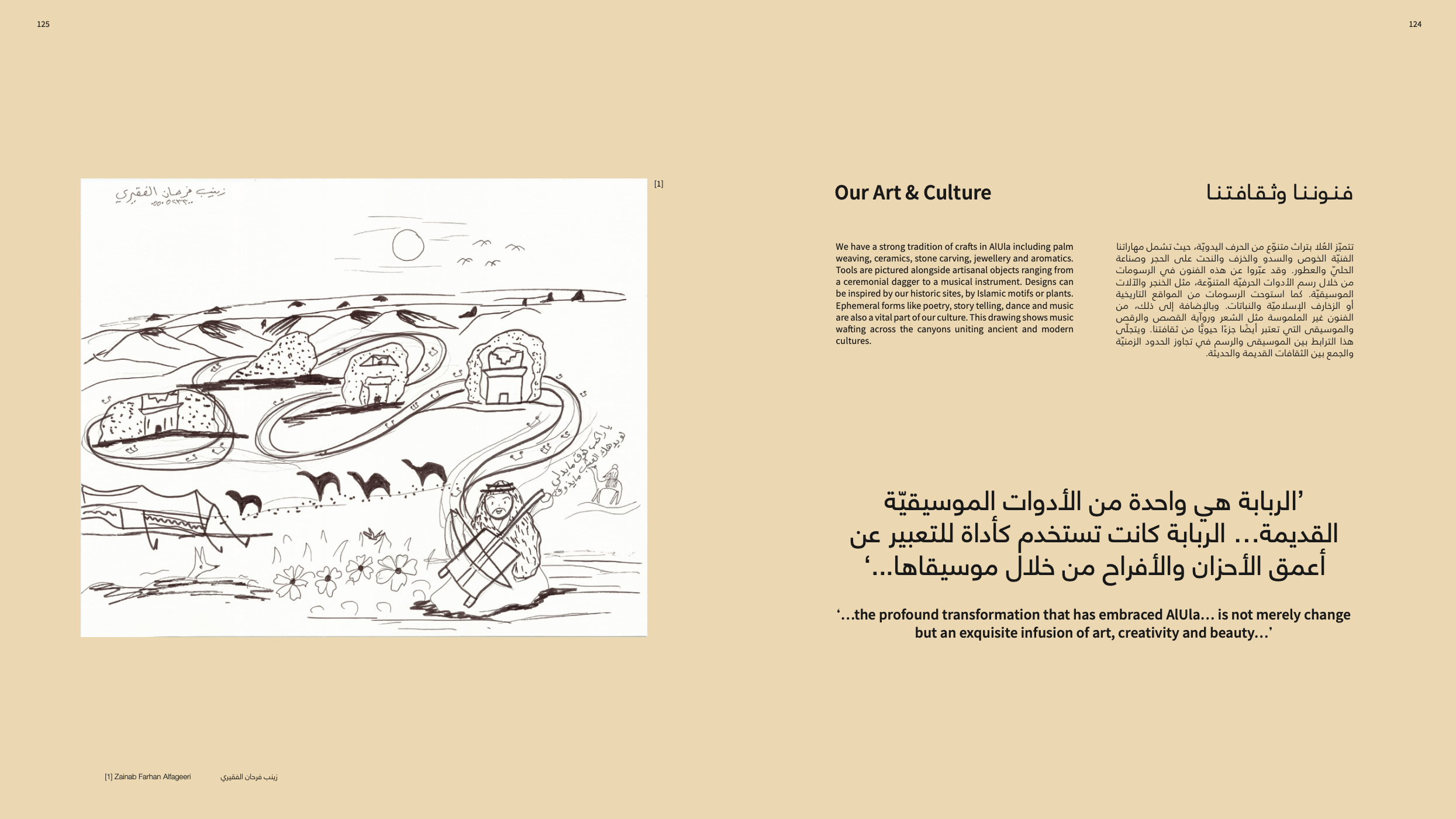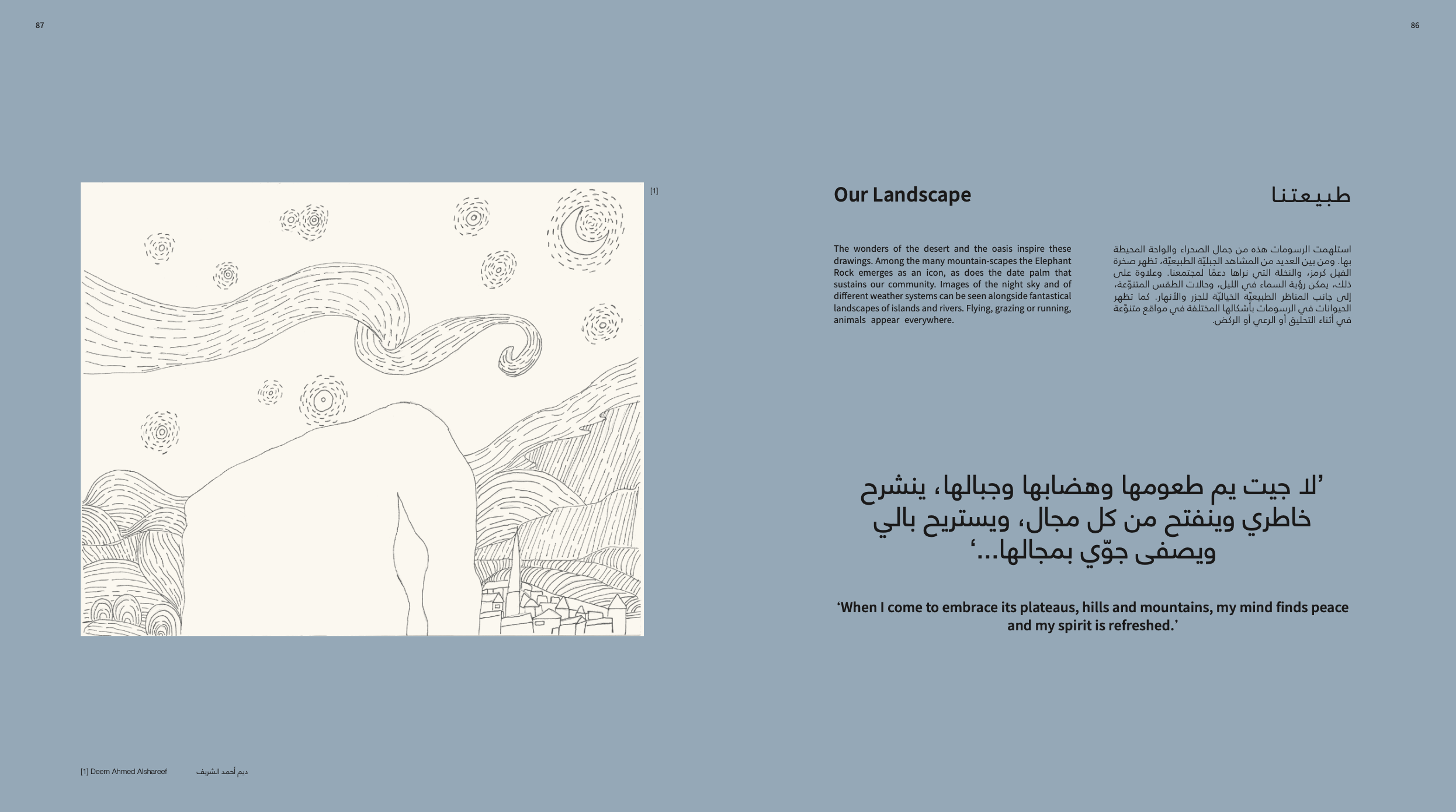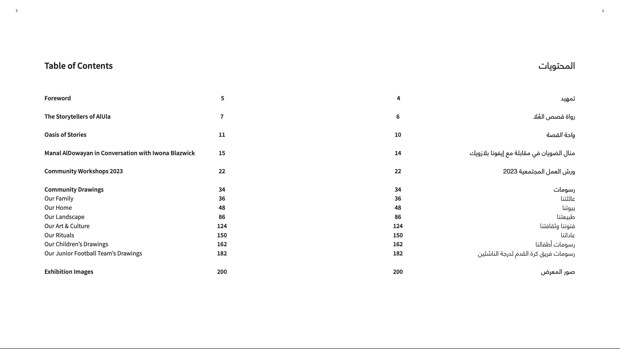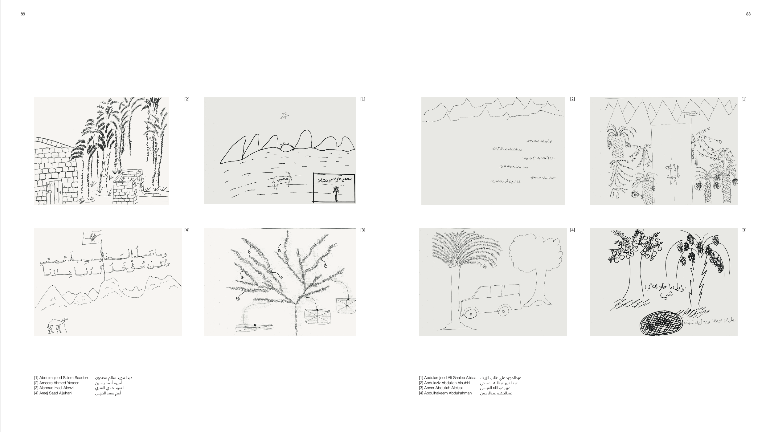 For this project, the artist asked local communities to create pictograms that symbolise their life in AlUla which she will inscribe on the walls of her desert installation. Their remarkable drawings are presented in this book, and every picture tells a story. The artist connects them with a pre-historic tradition of rock art. Just as travellers once carved animals, goods, prayers and salutations into Wadi AlFann's cliffs, so the people of AlUla will leave their mark in the desert for future generations.