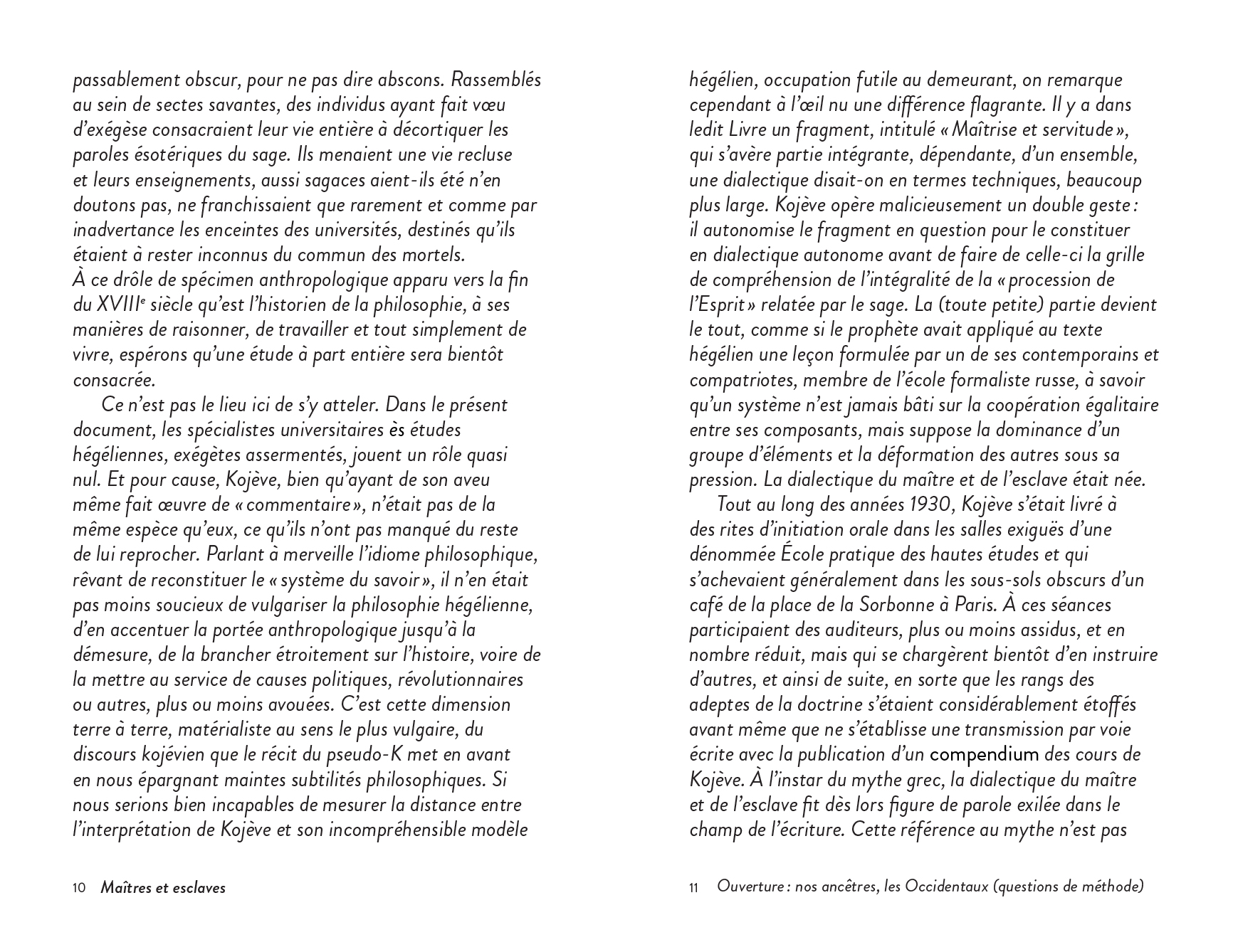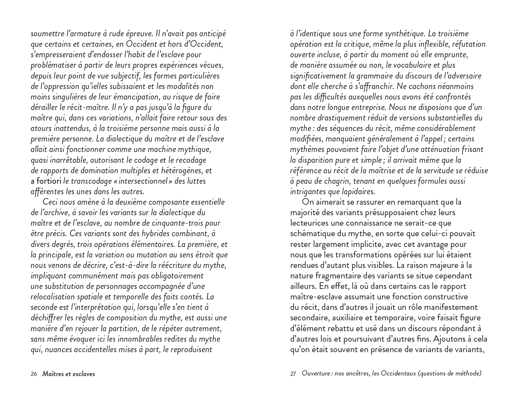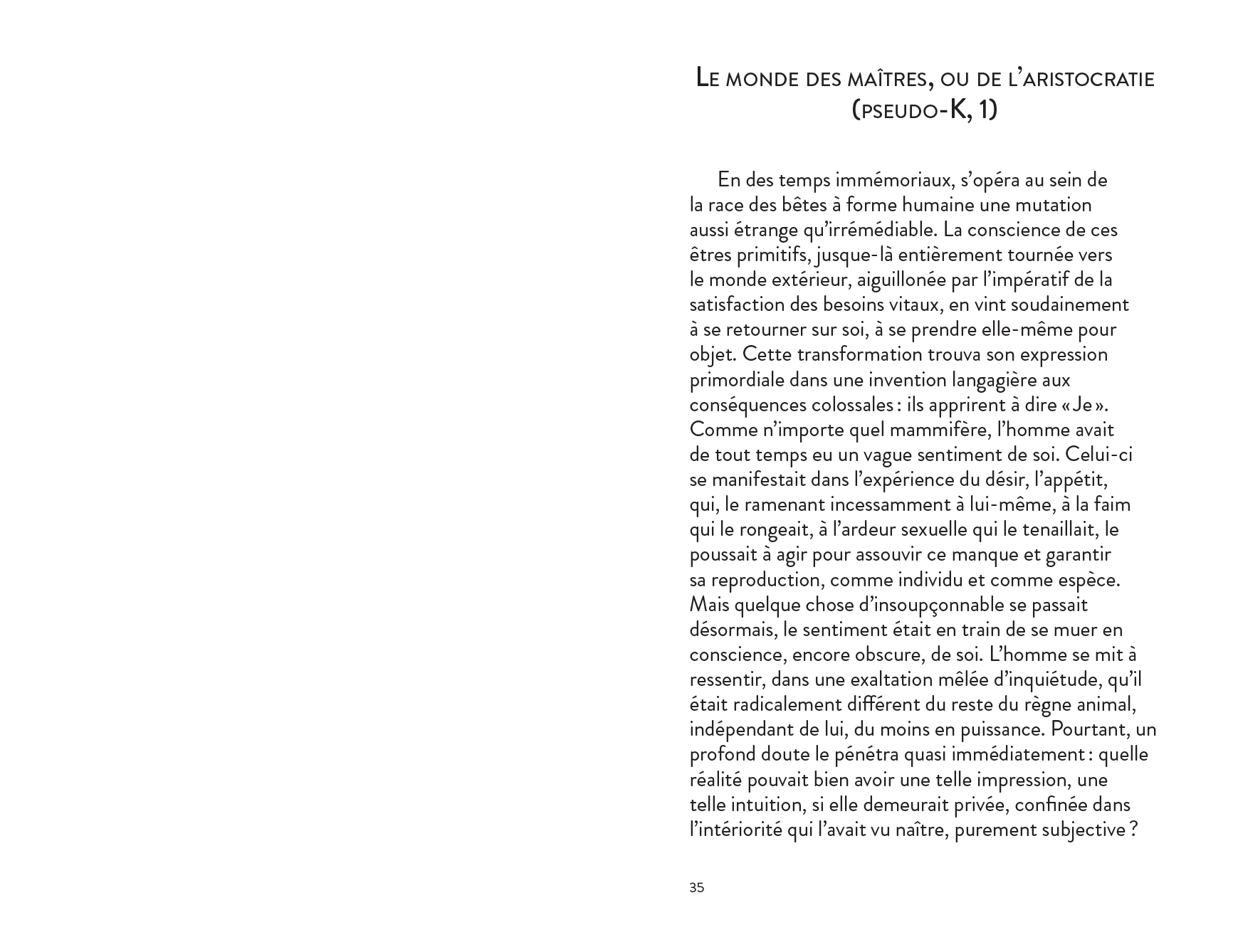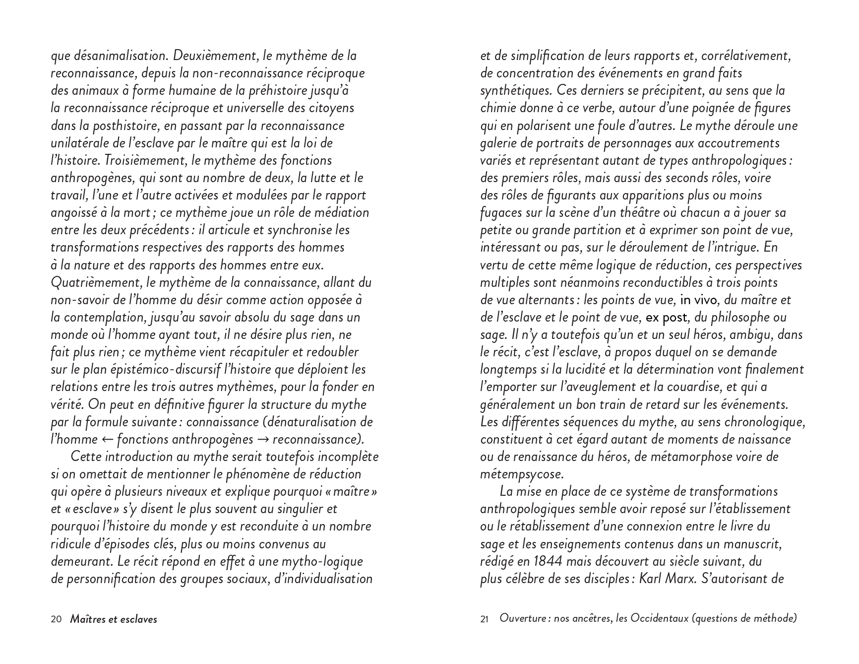 An experimental fictional ("post-apocalyptic") anthropology of philosophy, focusing on the dialectic of master and slave, itself understood as myth.