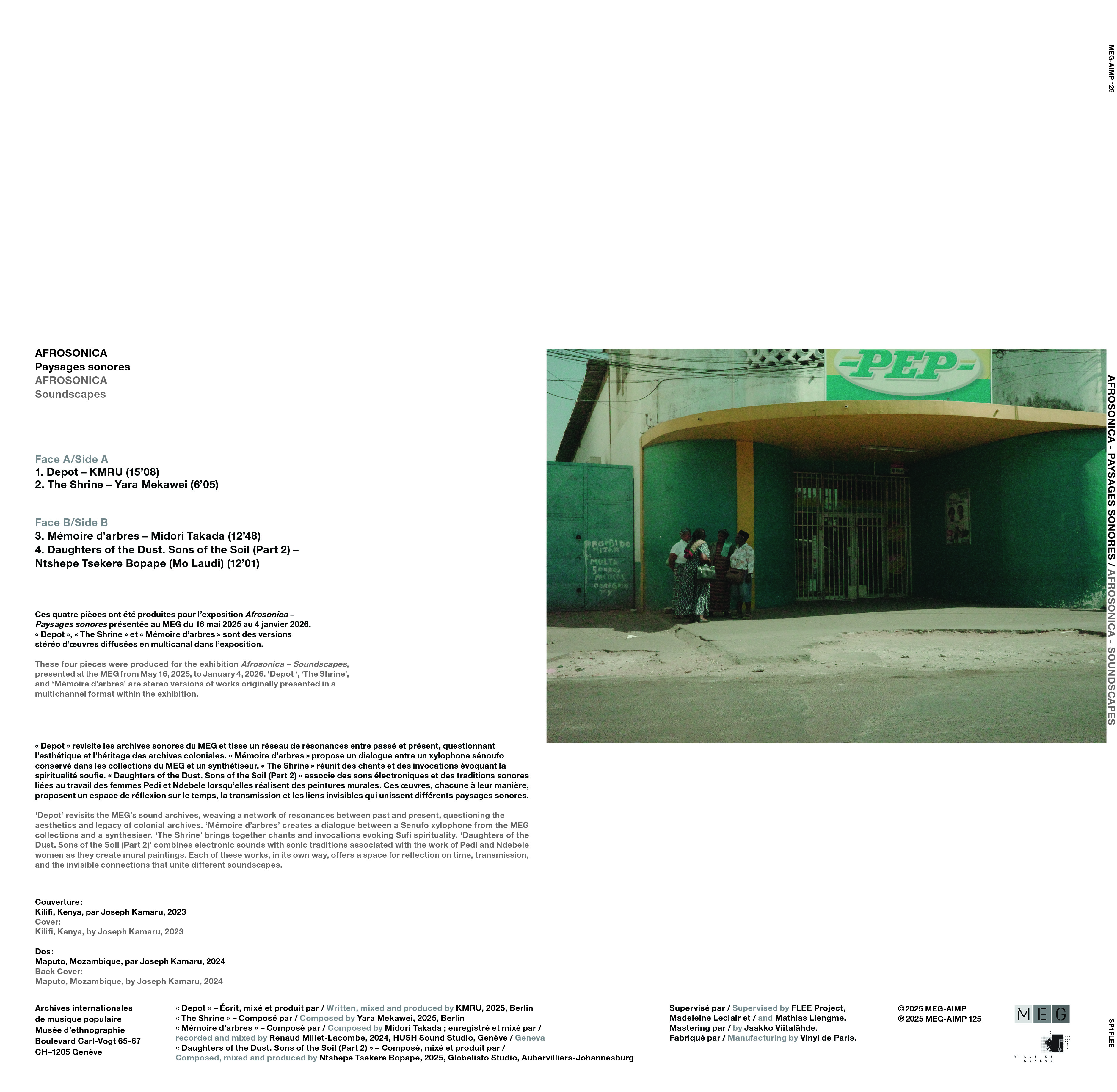 This record brings together four original works commissioned for the exhibition Afrosonica – Soundscapes, presented at the MEG (Museum of Ethnography in Geneva) in 2025. Blending sound art with reflections on the democratization of museum collections, this recording project explores connections: between past and present, between archives and living practices, between sonic materials, collective imaginaries, and diasporic trajectories.