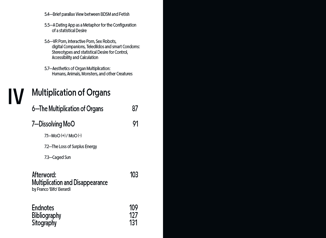 This book begins with an analysis of three iconic erotic texts from Masoch, Ballard and Bataille, and uses this analysis as the departure point for its main theoretical work on the four topics listed in the subtitle. The book passes through a lot of interesting phases, including an analysis of Phenomenology and Gucci, class struggle and OnlyFans and much more, until eventually arriving at the actual manifesto for Organ Multiplication and the beautifully named notion of the "Caged Sun".
