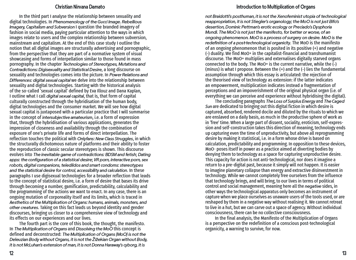 Organ Multiplication Manifesto is an essay that delves into the transformations of sociality and sexuality in the context of digital technologies. Using an interdisciplinary approach that blends philosophy, erotic literature, media theory, psychoanalysis, gender studies, and neuroscience, the text explores how devices, platforms, and technologies shape and produce normative systems that influence our perceptions, desires, and relationships with others. By examining the interplay between desire and digital mediation and drawing comparisons with authors such as