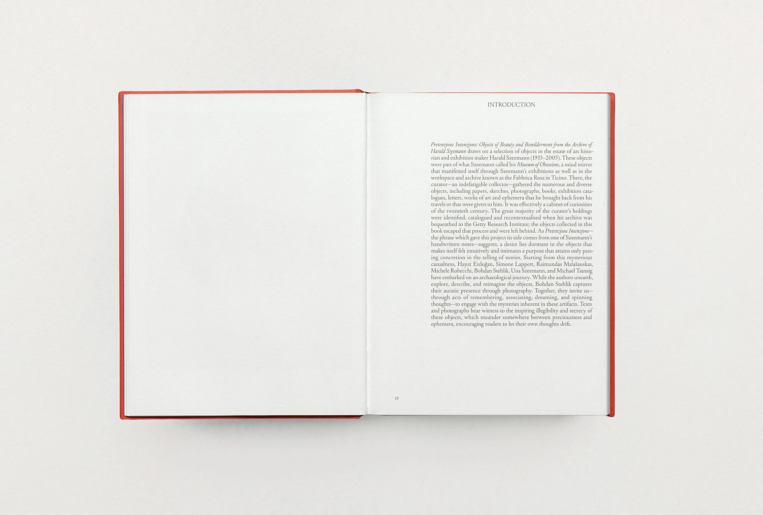 Pretenzione Intenzione: Objects of Beauty and Bewildermentfrom the Archive of Harald Szeemann draws on a selection of objects in the estate of art historian and exhibition maker Harald Szeemann (1933–2005). These objects were part of what Szeemann called his Museum of Obsessions, a mind mirror that manifested itself through Szeemann's exhibitions as well as in the workspace and archive known as the Fabbrica Rosa in Ticino. There he gathered the numerous and diverse objects, including papers, sketches, photographs, books, exhibition catalogues, letters, works of art and ephemera. As