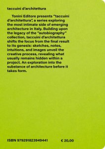 Taccuini d'architettura is a series exploring the most intimate side of emerging architecture in Italy. Building upon the legacy of the Autobiography collection, Taccuini d'architettura shifts the focus from the final result to its genesis: sketches, notes, intuitions, and images unveil the creative process, revealing what usually remains hidden within a project. An exploration into the substance of architecture before it takes form.