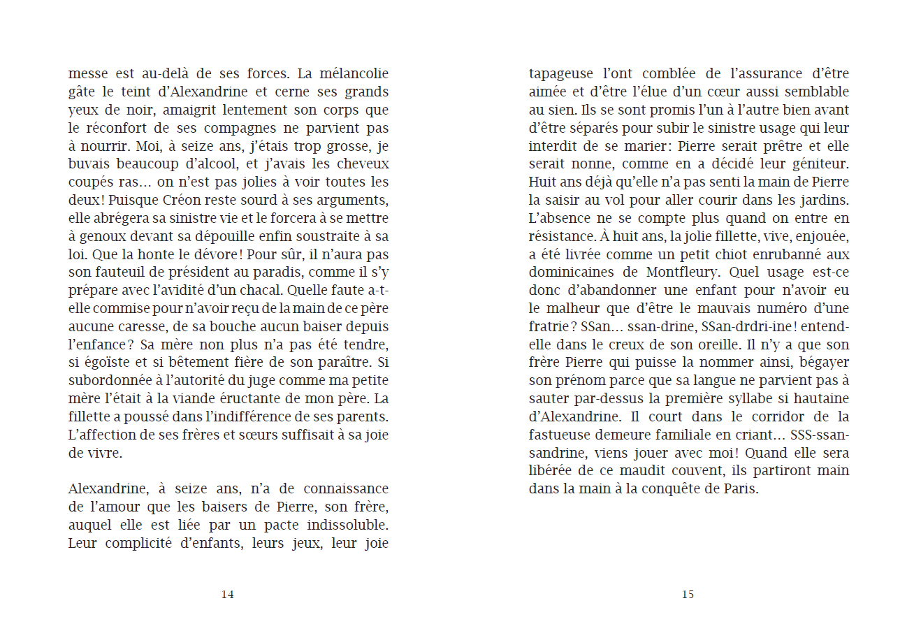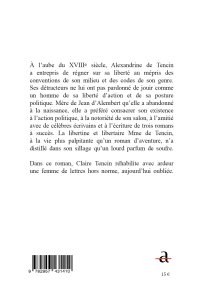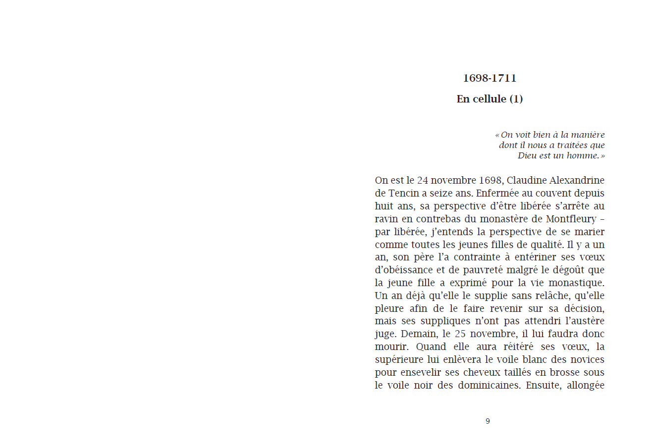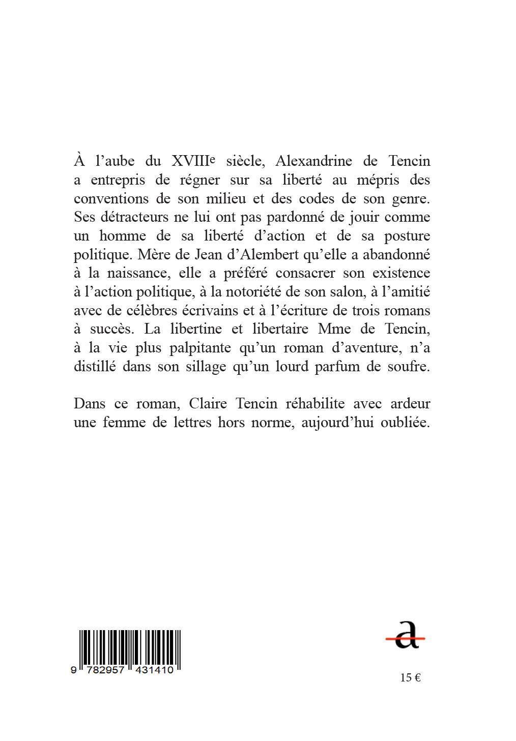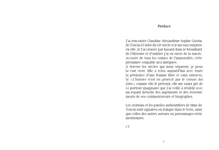 Claire Tencin retraces the tumultuous life of Alexandrine de Tencin (1682-1749), a libertine and libertarian woman of letters, at the dawn of the Age of Enlightenment, in a mirror-image dialogue with her character.