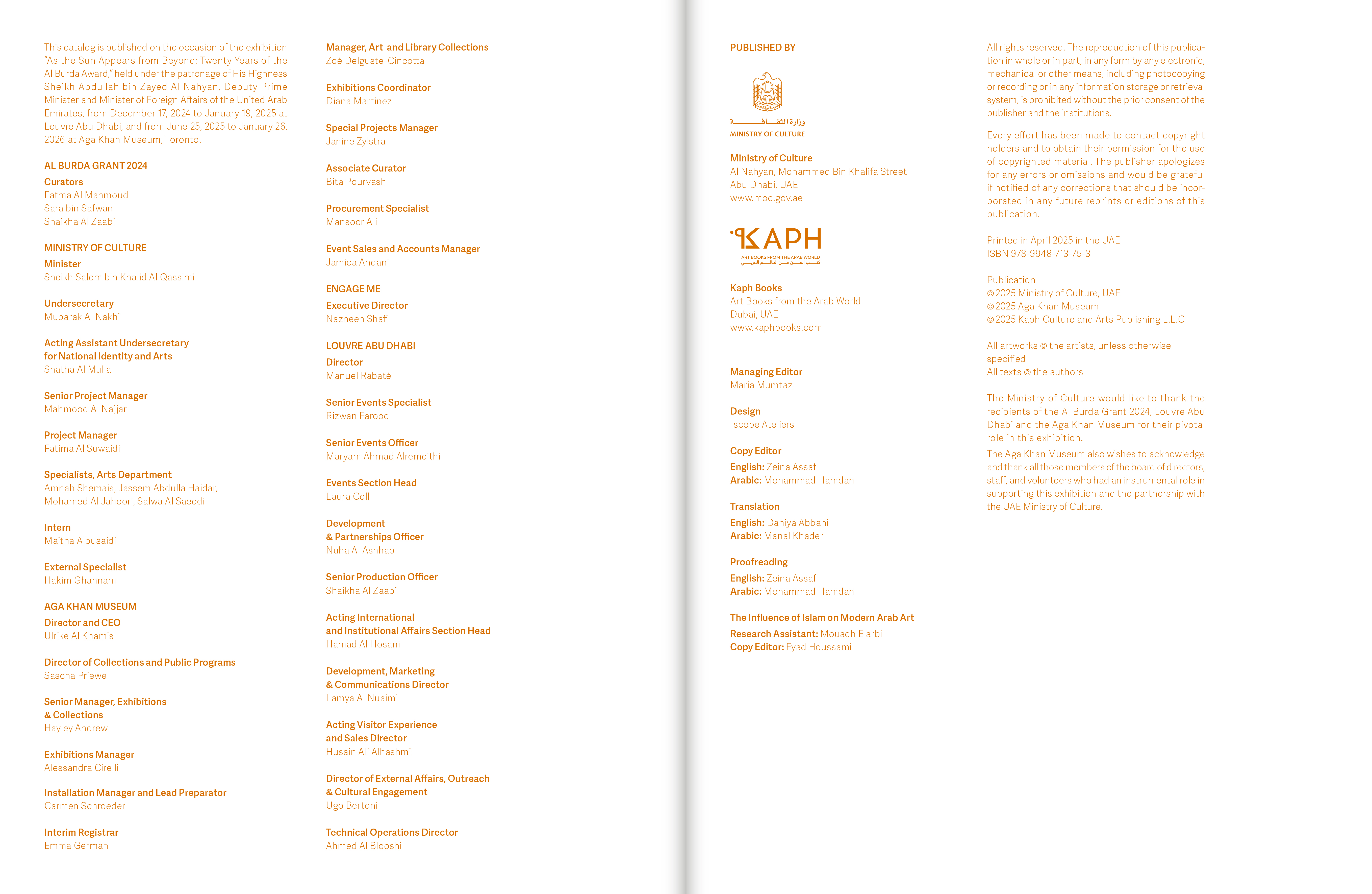 This richly illustrated catalogue was published on the occasion of the exhibition As the Sun Appears from Beyond: Twenty Years of the Al Burda Award. Spanning two decades of the UAE Ministry of Culture's Al Burda Award, the publication features a selection of artworks and essays that highlight the profound legacy of this initiative.