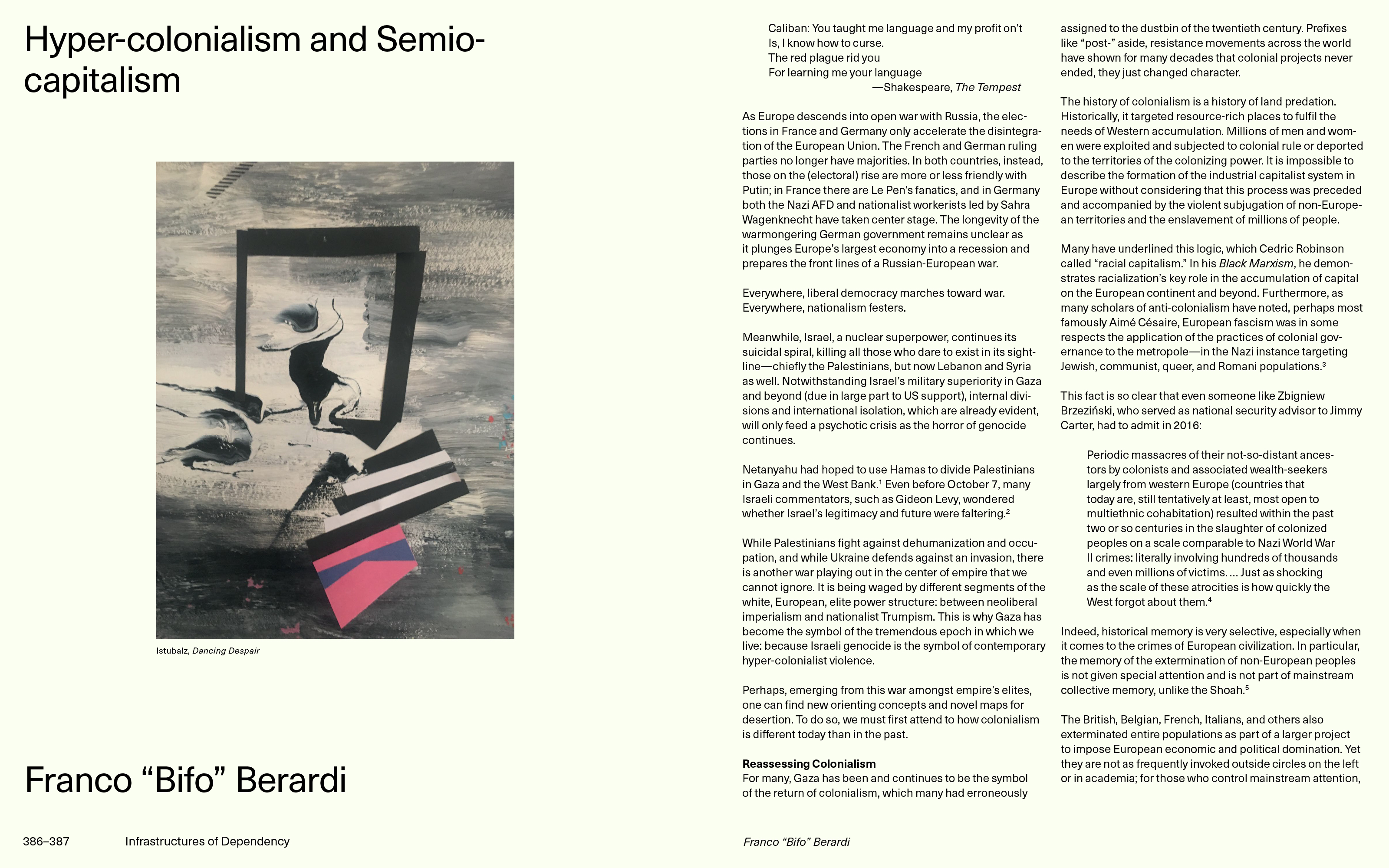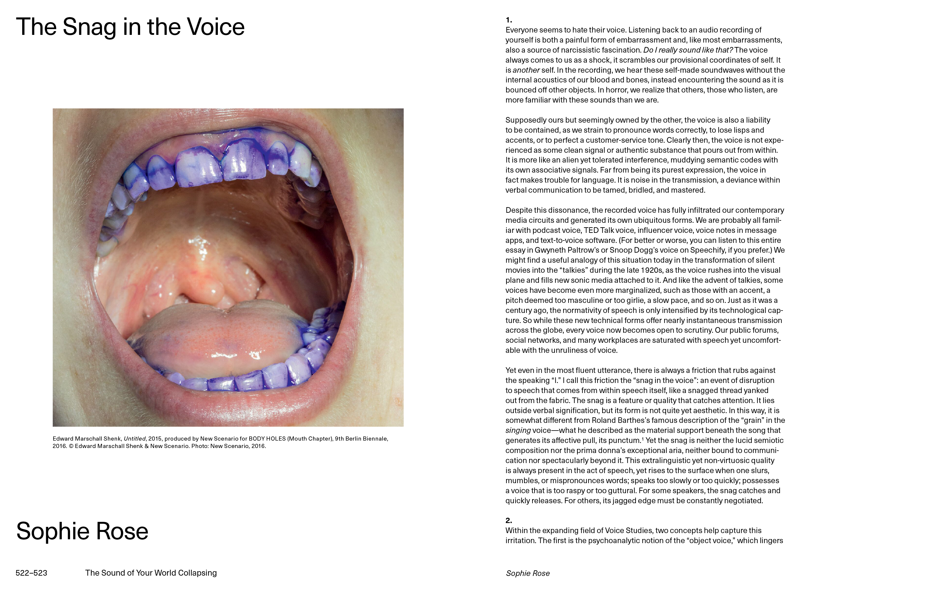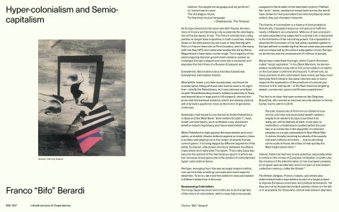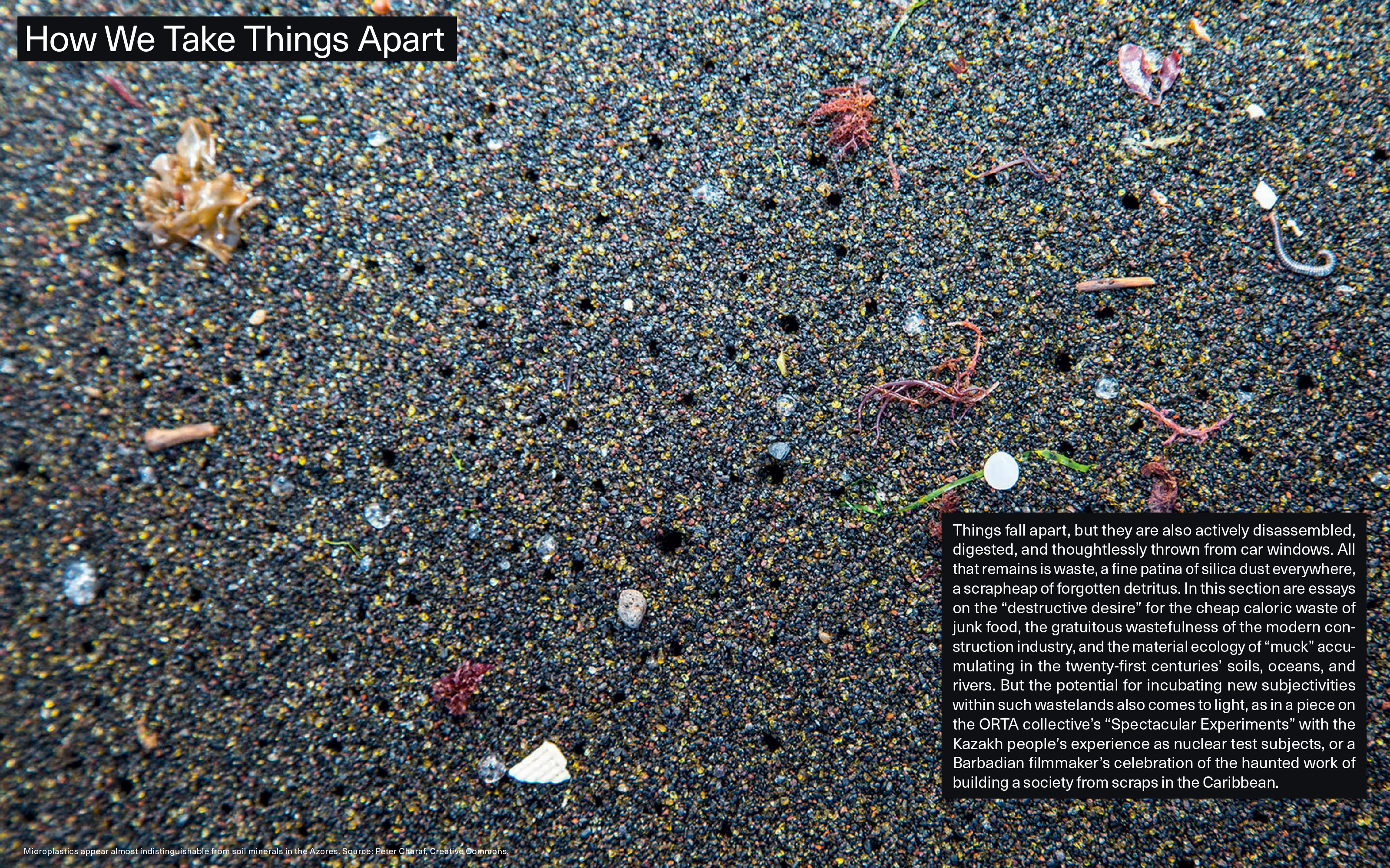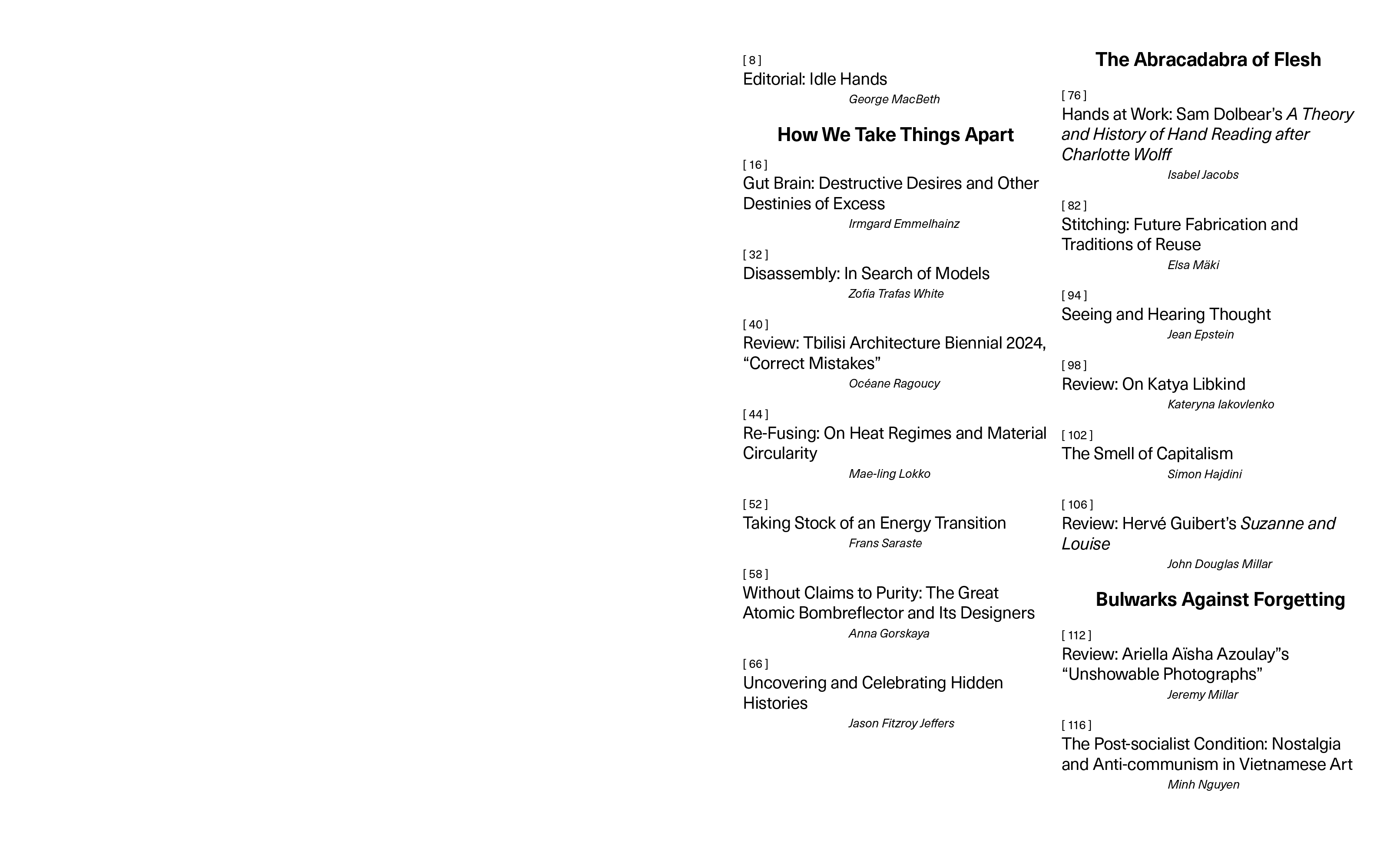 Contributions by Katherine C.M. Adams, Mal Ahern, Jamie Allen, Mónica Amor, Stephanie Bailey, Oliver Basciano, Sarah Bell, Lucy Benjamin, Franco "Bifo" Berardi, Pietro Bianchi, Ewa Borysiewicz, Molly Crabapple, Jhordan Channer, Adeline Chia, After Comfort Collective, Guy Debord, Brian Dillon, Cathryn Drake, Marguerite Duras, Ben Eastham, Caroline Elbaor, Jean Epstein, Irmgard Emmelhainz, Almudena Escobar López, Chris Fite-Wassilak, Andrea Fraser, Yervant Gianikian and Angela Ricci Lucchi, Alan Gilbert, David Gissen, Anna Gorskaya, Rob Goyanes, Simon Hajdini, Jörg Heiser, Yuk Hui, Dylan Huw, Nadia Huggins, Isabel Jacobs, Jason Fitzroy Jeffers, Jennifer Johung, George Kafka, Michael Kurtz, Enzo Lara-Hamilton, Alex Taek-Gwang Lee, Jen Liu, Sven Lütticken, Mae-ling Lokko, Natasha Marie Llorens, Elsa Mäki, Ives Maes, Babette Mangolte, Michael Marder, Jeremy Millar, John Douglas Millar, Luise Mörke, Serubiri Moses, Novuyo Moyo, Chris Murtha, Minh Nguyen, Marakianí Olivieri, Trevor Paglen, Andreas Petrossiants, Armina Pilav, André Pitol, Valery Podoroga Post-Novis, Océane Ragoucy, Rachel Rakes, Oleksiy Radynski, Shellyne Rodriguez, Luis Othoniel Rosa, Sophie Rose, Kristin Ross, Roque Raquel Salas Rivera, Frans Saraste, Aaron Schuster, Marina Vishmidt, Lua Vollaard, Jason Waite, Zofia Trafas White, Toby Üpson, Slavoj Žižek, Amy Zhang.