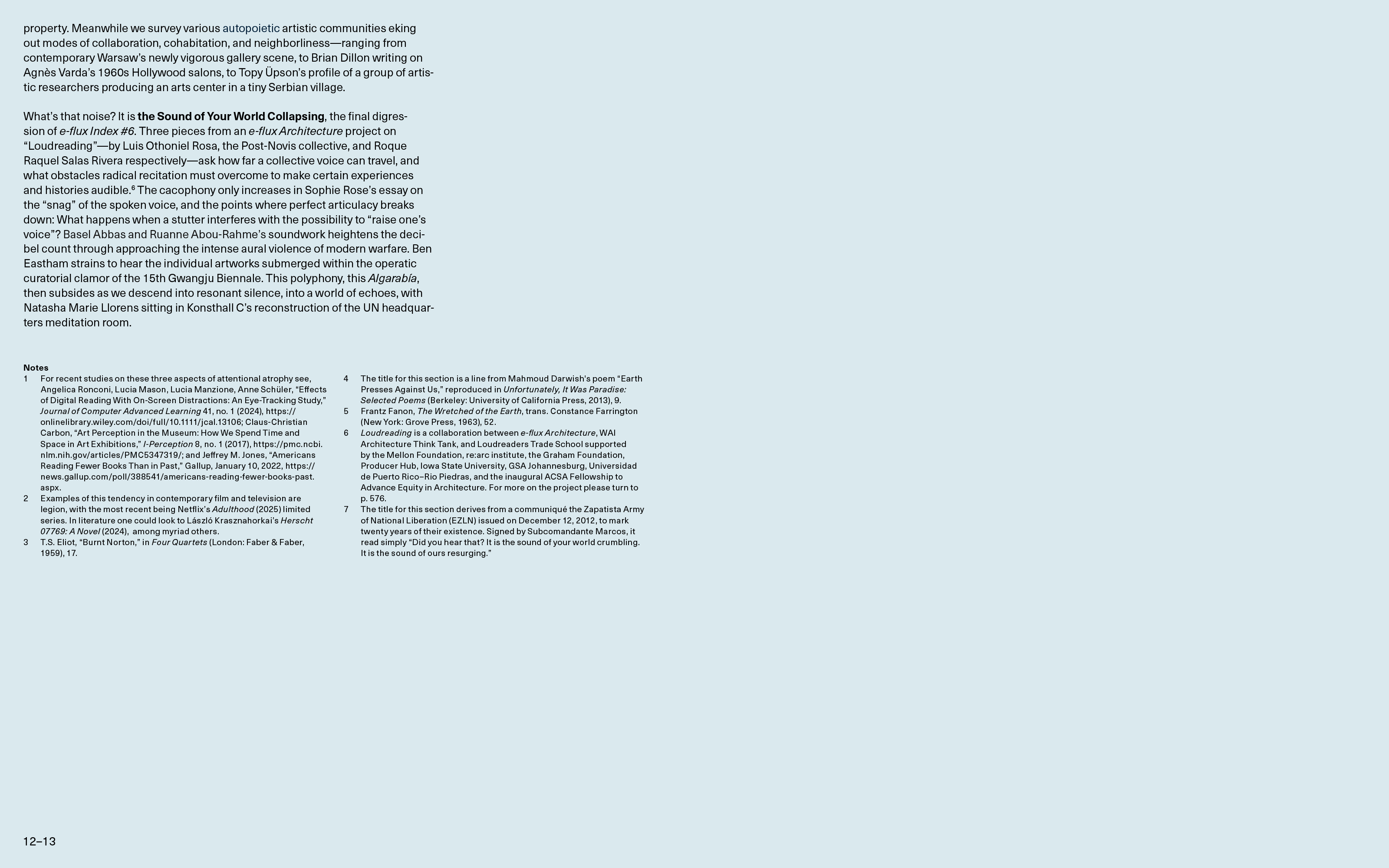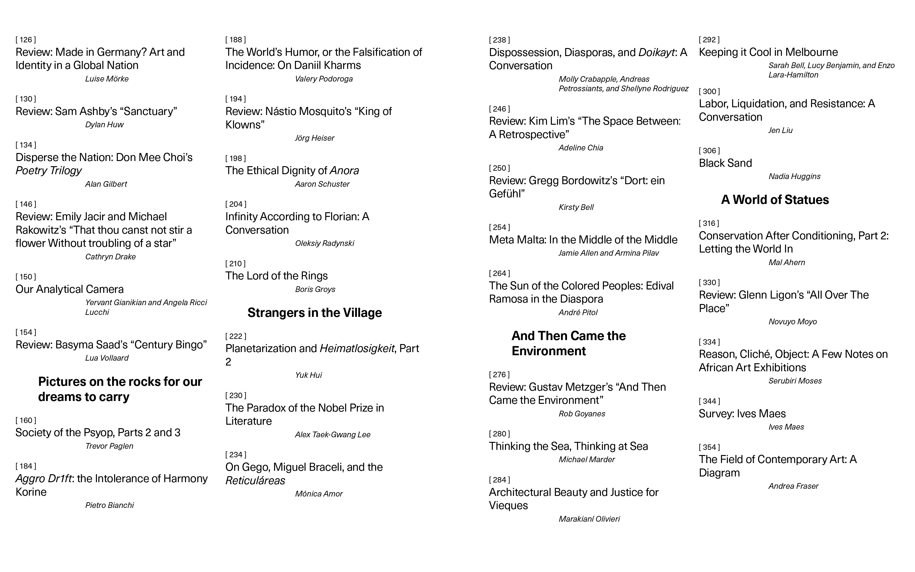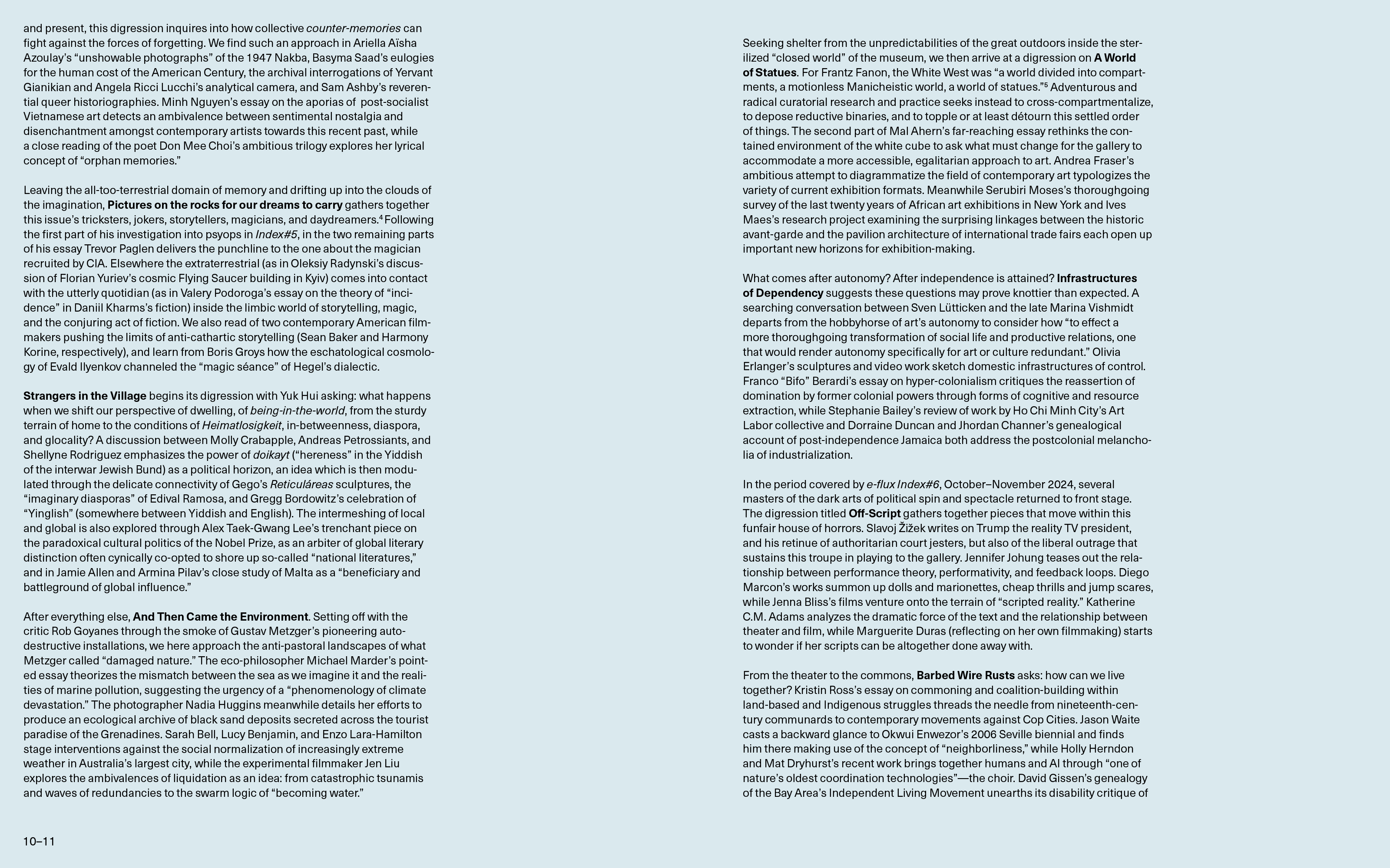 Index# 6 features all e-flux's commissioned pieces from October–November 2024. It includes contributions from 82 authors, artists, architects, filmmakers, poets, and educators, organized into eleven thematic digressions that index the arts. These are titled How We Take Things Apart; The Abracadabra of Flesh; Bulwarks Against Forgetting; Pictures on the rocks for our dreams to carry; Strangers in the Village; And Then Came the Environment; A World of Statues; Infrastructures of Dependency; Off-Script; Barbed Wire Rusts; and the Sound of Your World Collapsing.