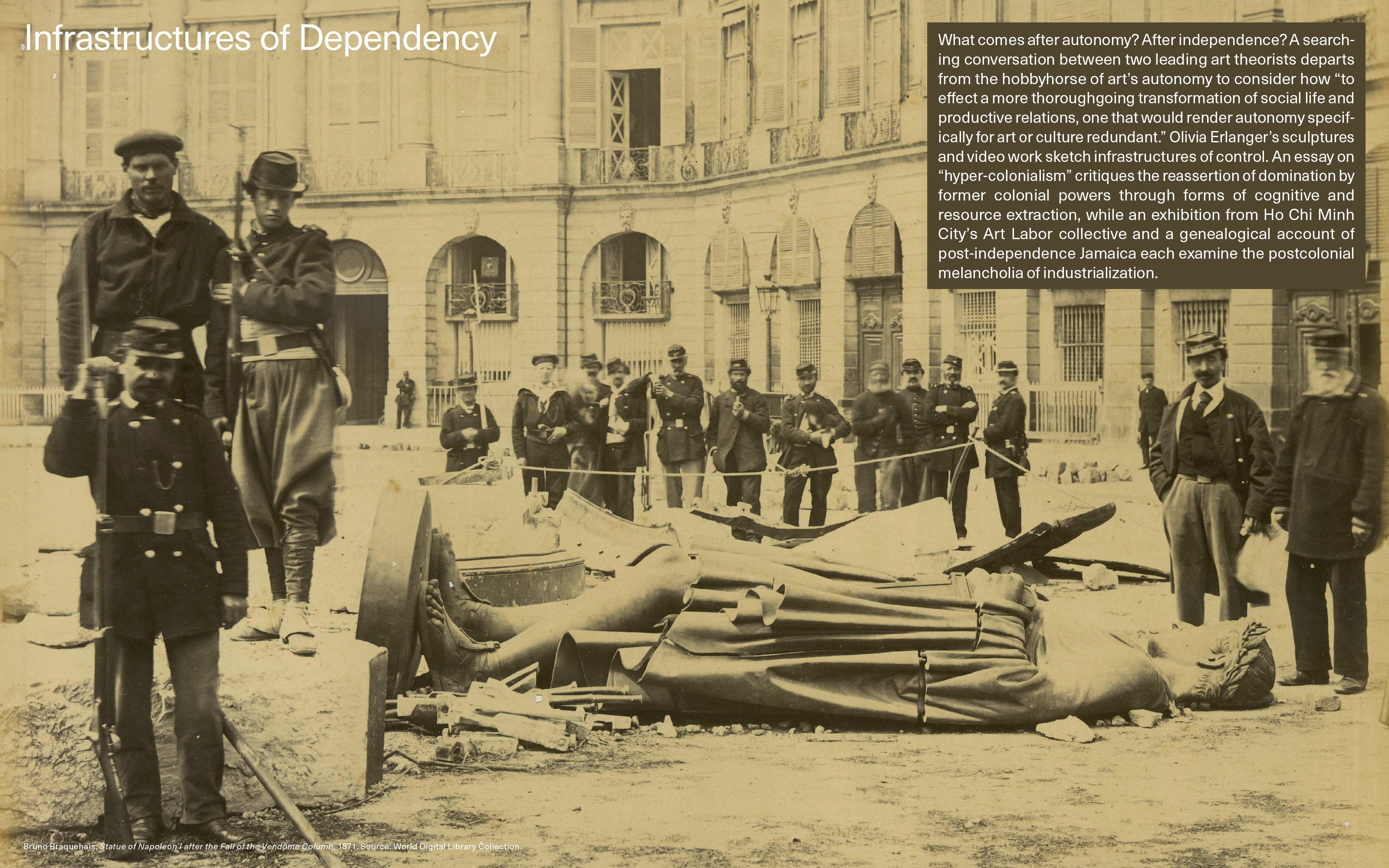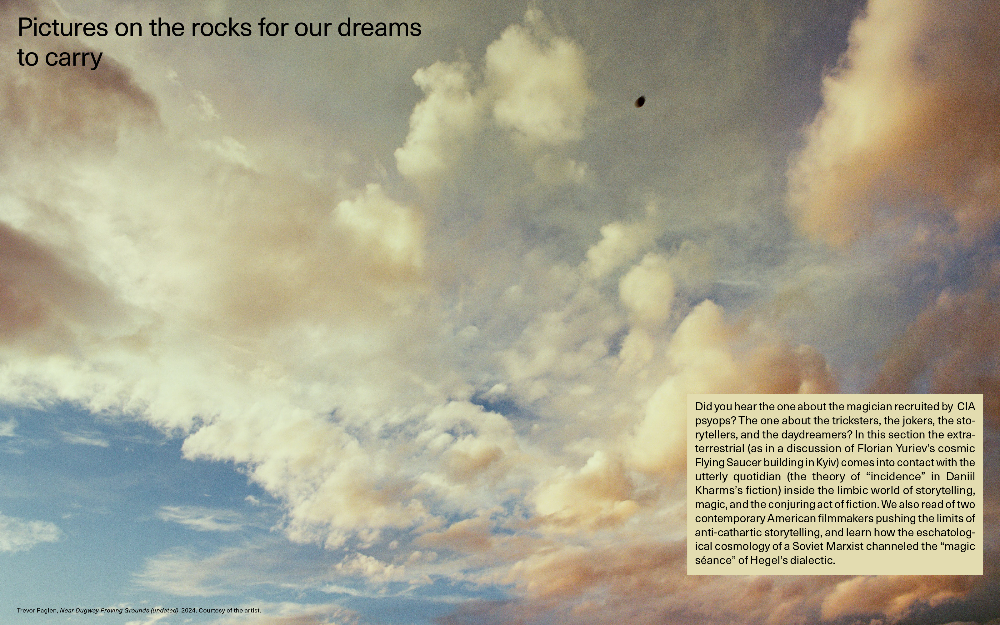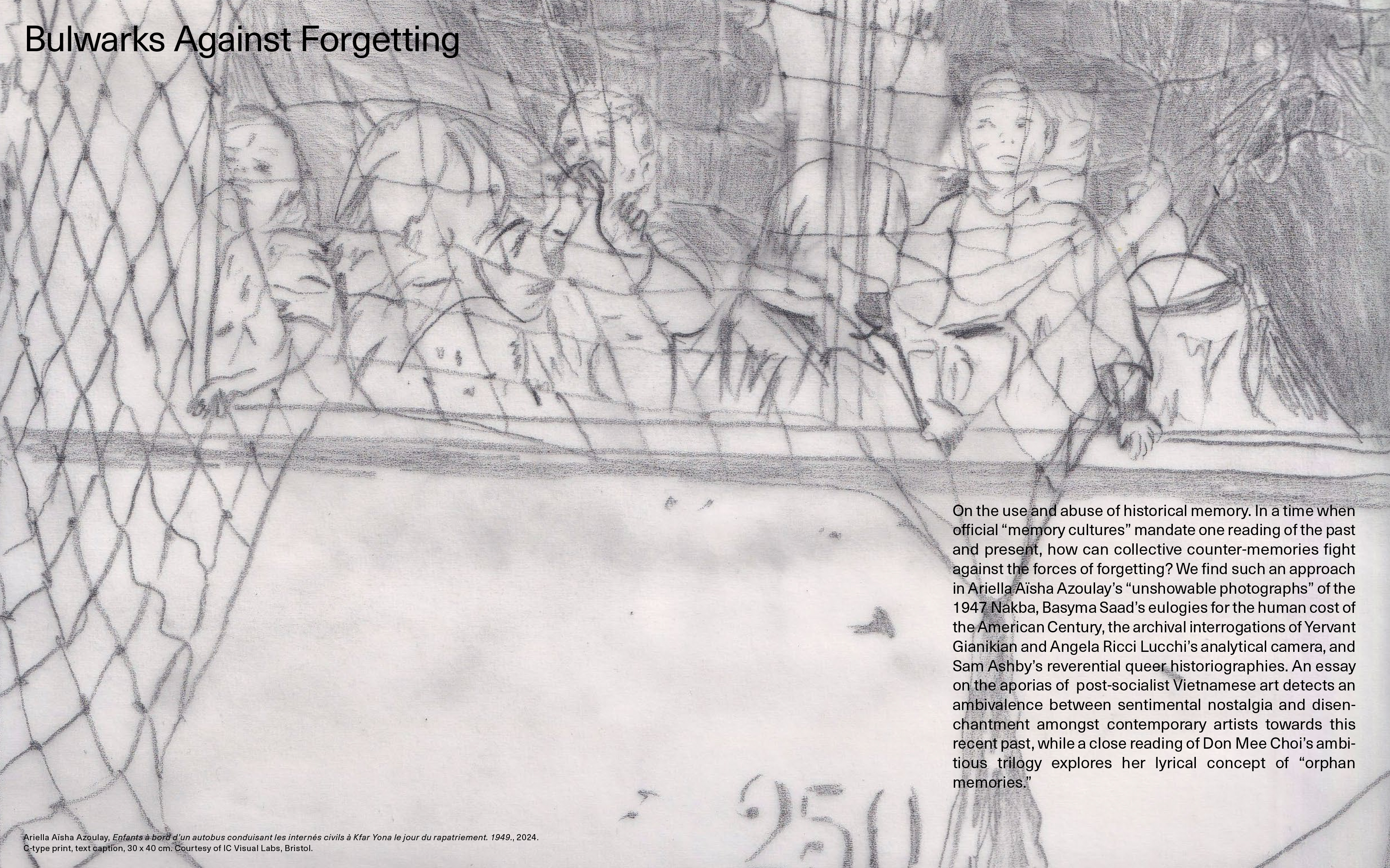 Index# 6 features all e-flux's commissioned pieces from October–November 2024. It includes contributions from 82 authors, artists, architects, filmmakers, poets, and educators, organized into eleven thematic digressions that index the arts. These are titled How We Take Things Apart; The Abracadabra of Flesh; Bulwarks Against Forgetting; Pictures on the rocks for our dreams to carry; Strangers in the Village; And Then Came the Environment; A World of Statues; Infrastructures of Dependency; Off-Script; Barbed Wire Rusts; and the Sound of Your World Collapsing.