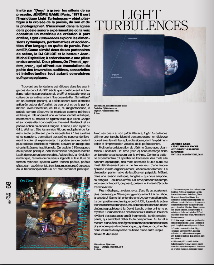 Invited by *Duuu Radio to record an EP of sound poetry, Jérôme Game, a poet working at the crossroads of words, sounds, and images, gathers two of his stage partners to each create a duet piece with him. The result is _system_error_ with CHLOÉ and On Time with Jean-Michel Espitallier.