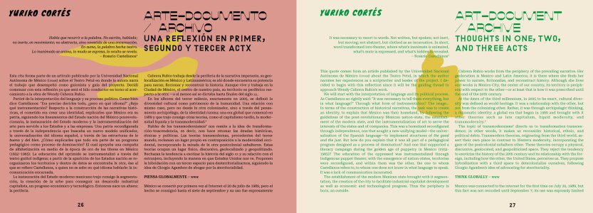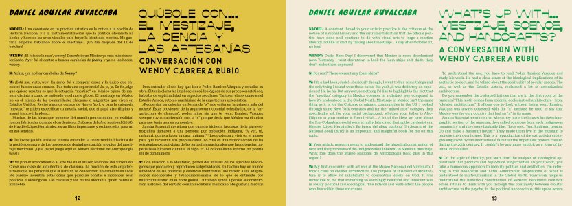 There are events and images that have a direct connection with the past to the point that they are mistaken as contemporary, their time has been dislocated and the apparent stability of historical linearity disappears. Through her practice, Mexican artist Wendy Cabrera Rubio renders the temporal and narrative traces in which Mexican identity transits, a history marked by the creation of a nationalism whose fixation on an indigenous past wanders in the present. This book focuses on the construction of mestizaje and the differences between a "popular" art and a "cultured" art, because as the philosopher Bruno Latour would say, the relative existence of these experiences breaks the logic of a beginning and an end: no step is left to chance, contemporary existence, therefore, implies imagining different possible pasts.