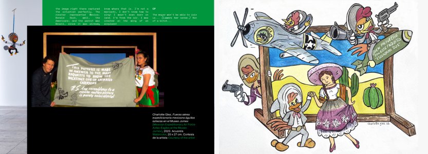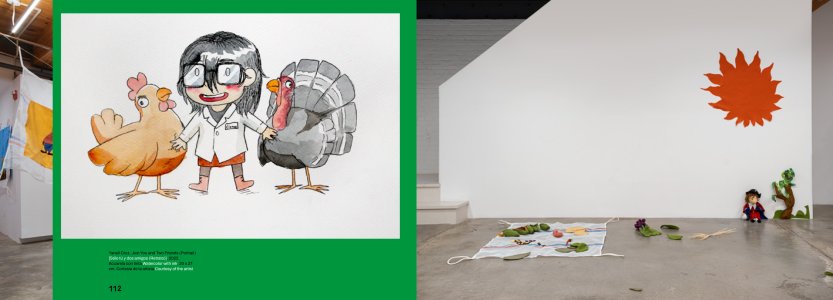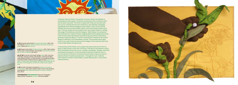 Wendy Cabrera Rubio (born in 1993 in Mexico City) is part of a generation of artists that has been invested in revisiting the history of Mexican arts and crafts with a multidisciplinary and pedagogical approach. Her practice explores the production and distribution of images; using strategies such as appropriation and performance, Cabrera condenses high and low, arts and crafts, history and storytelling. Her work frequently consists of bi-dimensional and three-dimensional quilted objects, cartoon-like characters and/or landscapes made of felt, that stage different narratives (often as a puppet theater) influenced by the educational television programs from the first half of the 20th century. Among the recurrent topics in her work are the concept of the so-called Pan-American history and its relation to North American interventionism in Latin America as embodied by the cultural industries, particularly in Walt Disney's productions. In this vein, Cabrera's practice critically addresses the ideological aspects of identity politics.
