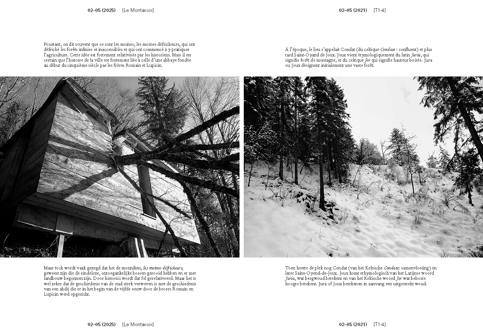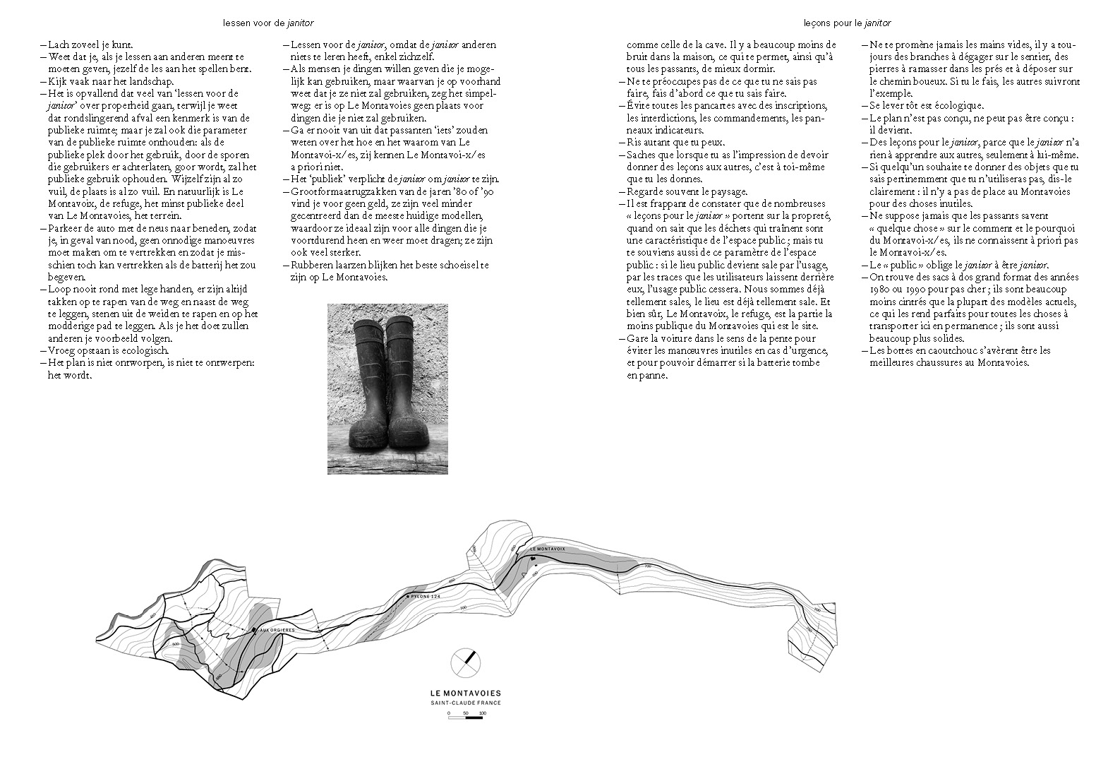 However, a lot has changed in recent years: climate change is having a severe impact on the terrain. Ecological forest management will have to take a very different approach to that followed in the past. Lastly, there is the fact that we are living in a hyperconnected world. Cuyvers argues that the connected condition means that we are always 'inside'. With this book, he therefore heralds the end of architecture (as he had defined it). Le Montavoix is a danse macabre with the dying medium of the art of space.
